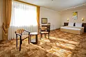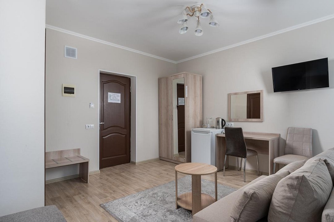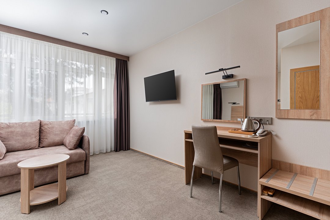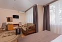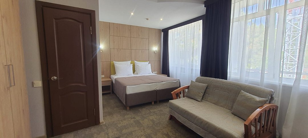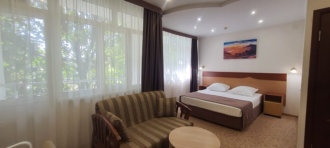 Однокомнатный номер с ванной комнатой, балконом, летней мебелью и видом на горы расположен в корпусе №2. В номере: кровать с ортопедическим матрасом, прикроватные тумбочки, ЖК телевизор, шкаф, стол, чайник, холодильник, сейф, сплит-система, напольная раскладная сушилка.