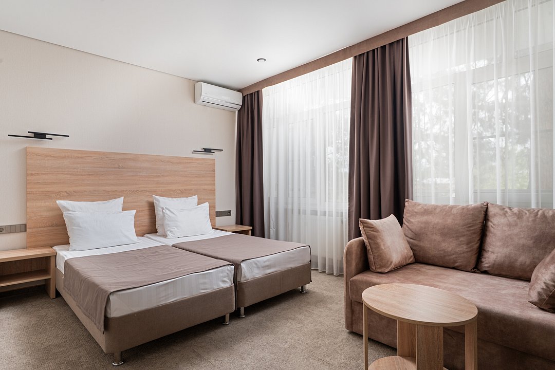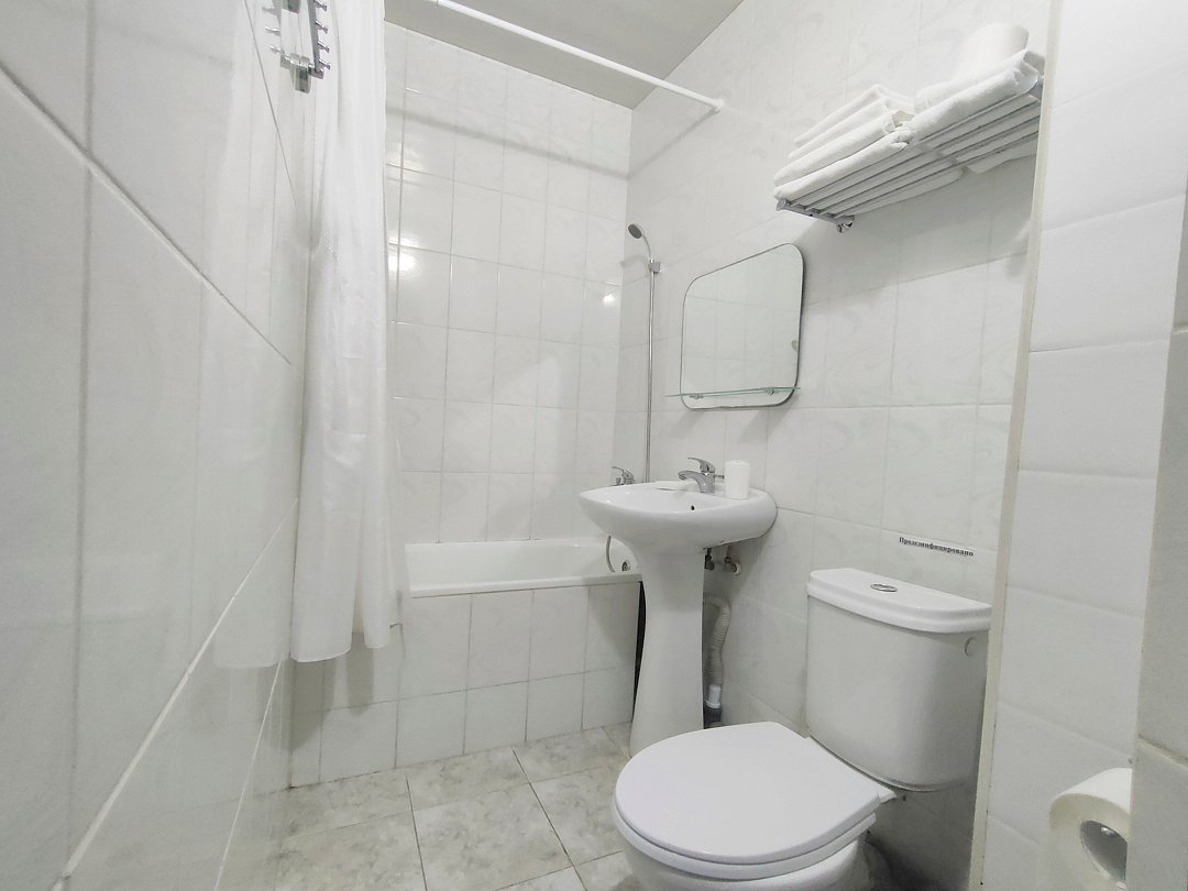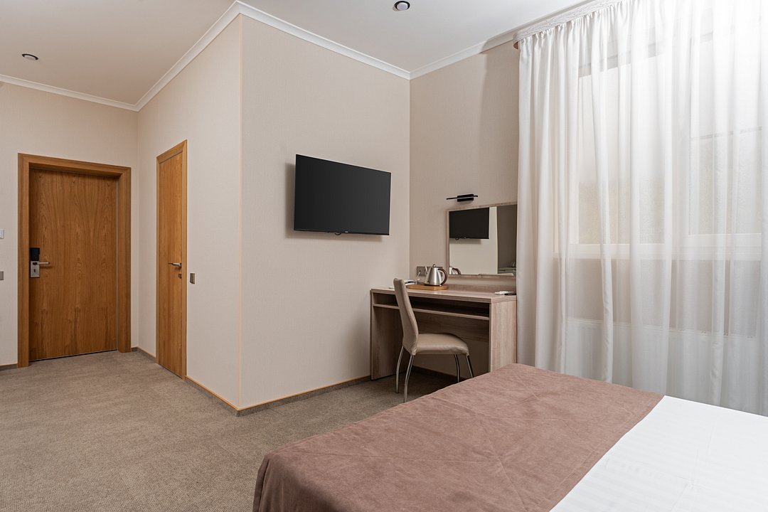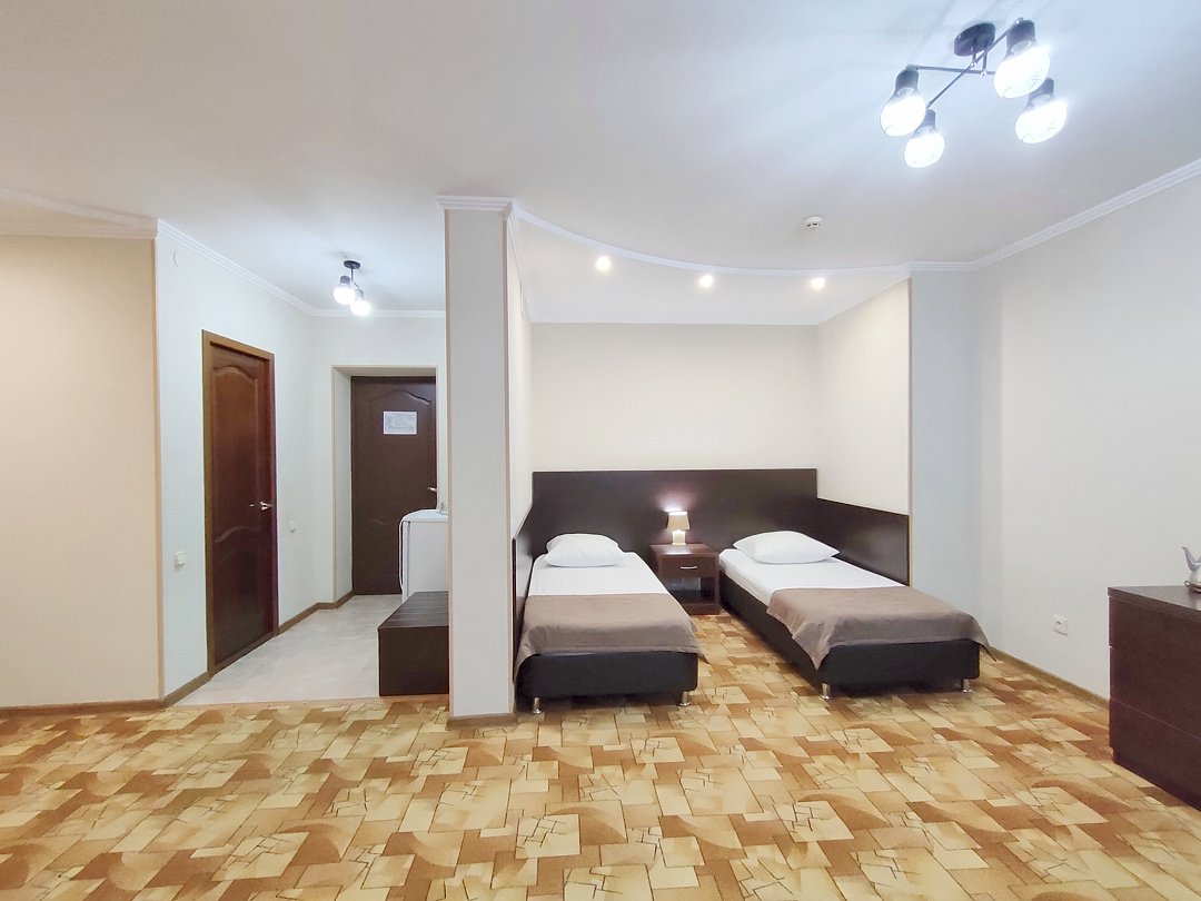 Однокомнатный номер с ванной комнатой (без балкона) расположен в корпусе №1. В номере двуспальная кровать с ортопедическим матрасом и односпальная кровать с ортопедическим матрасом или три односпальные кровати с ортопедическим матрасом, прикроватные тумбочки, ЖК телевизор, шкаф, стол, холодильник, чайник, сейф, сплит-система, напольная раскладная сушилка.