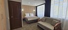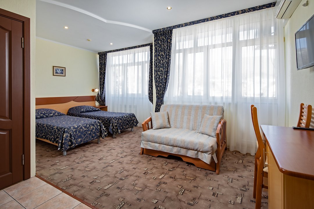 Однокомнатный семейный номер с ванной комнатой, без балкона, с видом на море, расположен в корпусе №1. В номере двуспальная кровать с ортопедическим матрасом и две односпальные кровати с ортопедическим матрасом, прикроватные тумбочки, ЖК-телевизор, шкаф, стол, комод, холодильник, чайник, сейф, сплит-система, напольная раскладная сушилка.