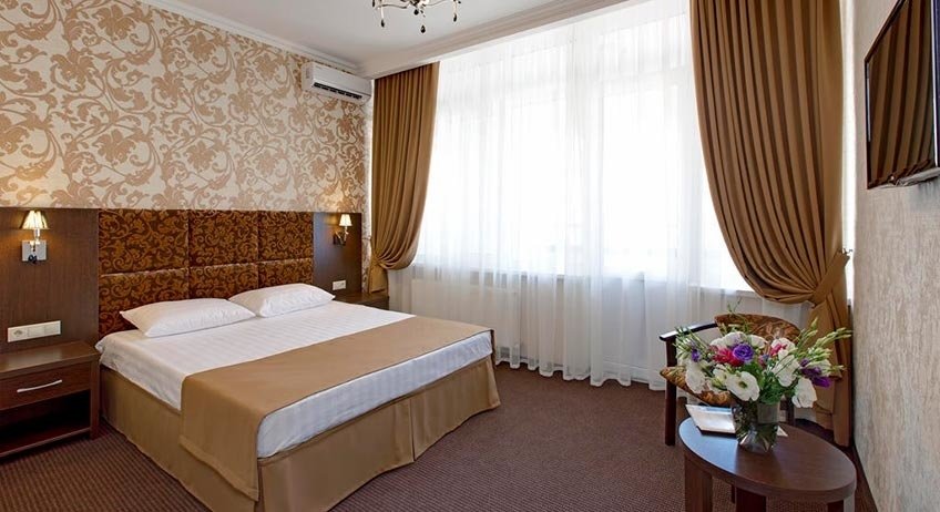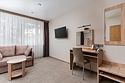 Однокомнатный номер с ванной комнатой и балконом расположен в корпусе №1. В номере: кровать с ортопедическим матрасом, прикроватные тумбочки, ЖК телевизор, шкаф, стол, холодильник, чайник, сейф, сплит-система, напольная раскладная сушилка.