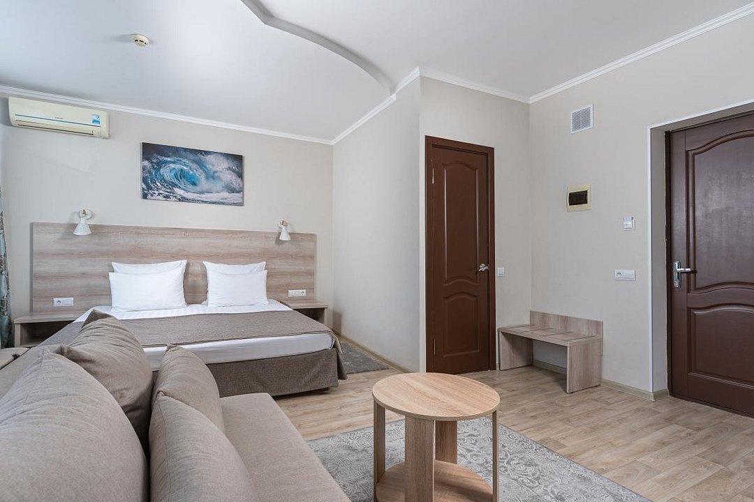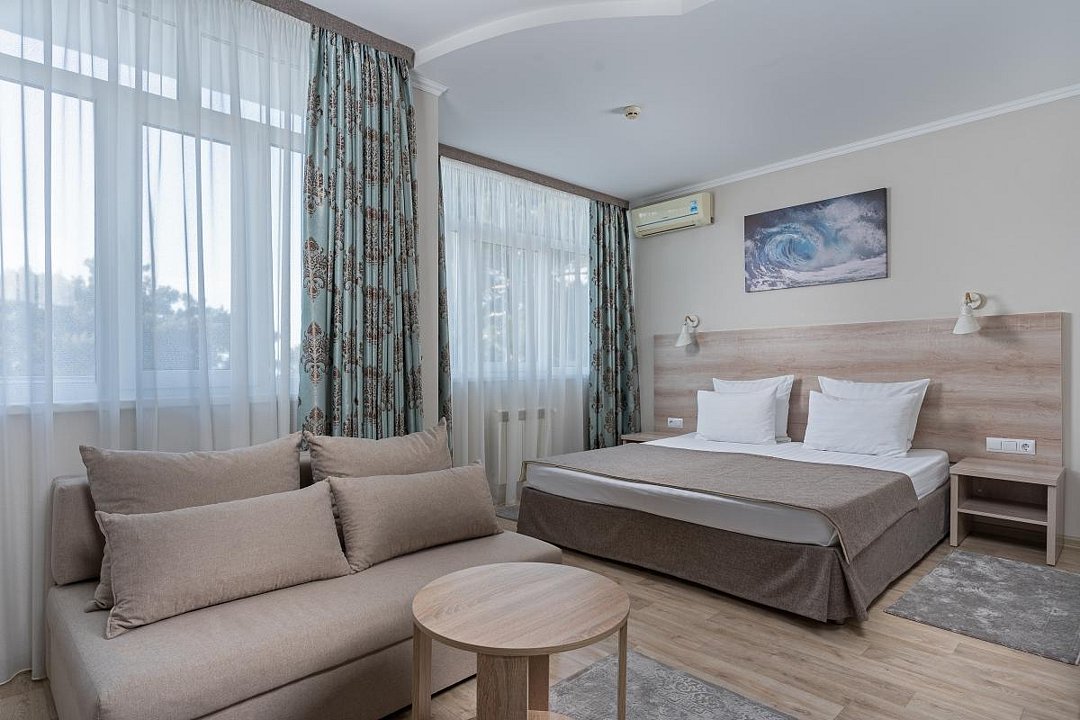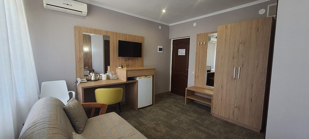 Однокомнатный номер с ванной комнатой, балконом, летней мебелью и видом на море расположен в корпусе №2. В номере двуспальная кровать с ортопедическим матрасом или две односпальные кровати, прикроватные тумбочки, ЖК телевизор, шкаф, стол, чайник, холодильник, сейф, сплит-система, напольная раскладная сушилка.