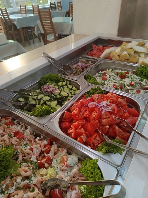 С 1 июня по 30 сентября в пансионате «Геленджик» действует система трехразового питания «Шведский стол». В меню входят холодные и горячие закуски, разнообразные салаты, супы и вторые блюда из мяса, рыбы и птицы. Гости могут выбрать гарниры, свежие фрукты и овощи, а также молочные и кисломолочные продукты.