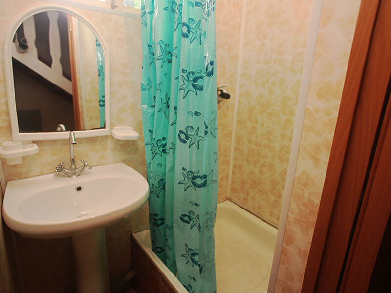 На втором этаже: большая спальня с двуспальной кроватью, душевая кабина с туалетом.