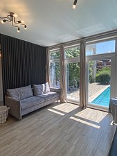 В бане есть уютное место для отдыха после парной. Здесь можно провести время с родными и близкими людьми за чашечкой чая в комфортных условиях. Сразу перед зоной отдыха находится бассейн с подогревом, который открыт в любую погоду.