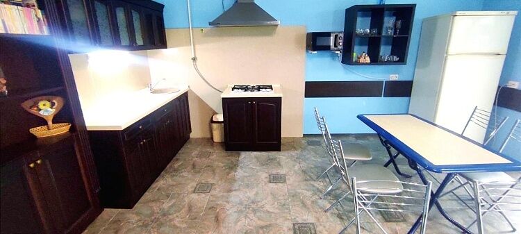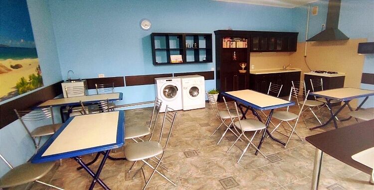 На первом этаже гостевого дома находится кухня-столовая общего пользования. К услугам проживающих газовая 4-х комфорочная плита, микроволновка, чайник, кухонная утварь, столики для приема пищи. Также на улице под навесом имеются столики для приема пищи на свежем воздухе.