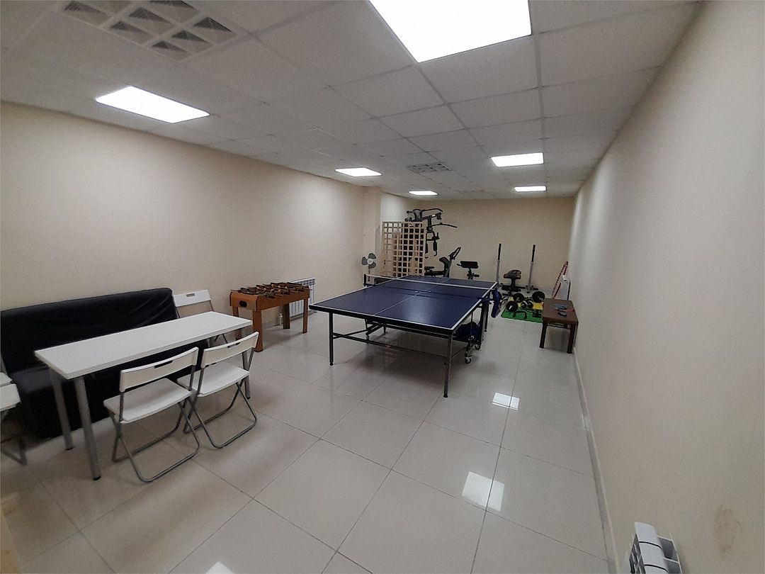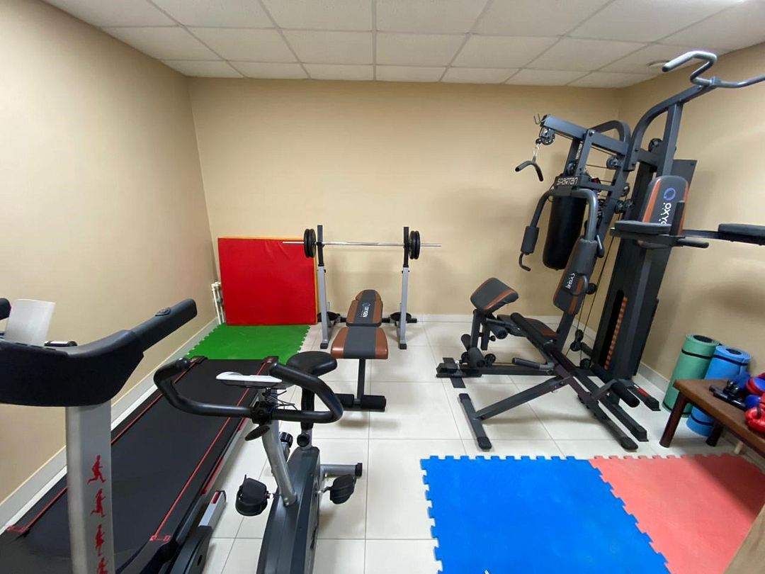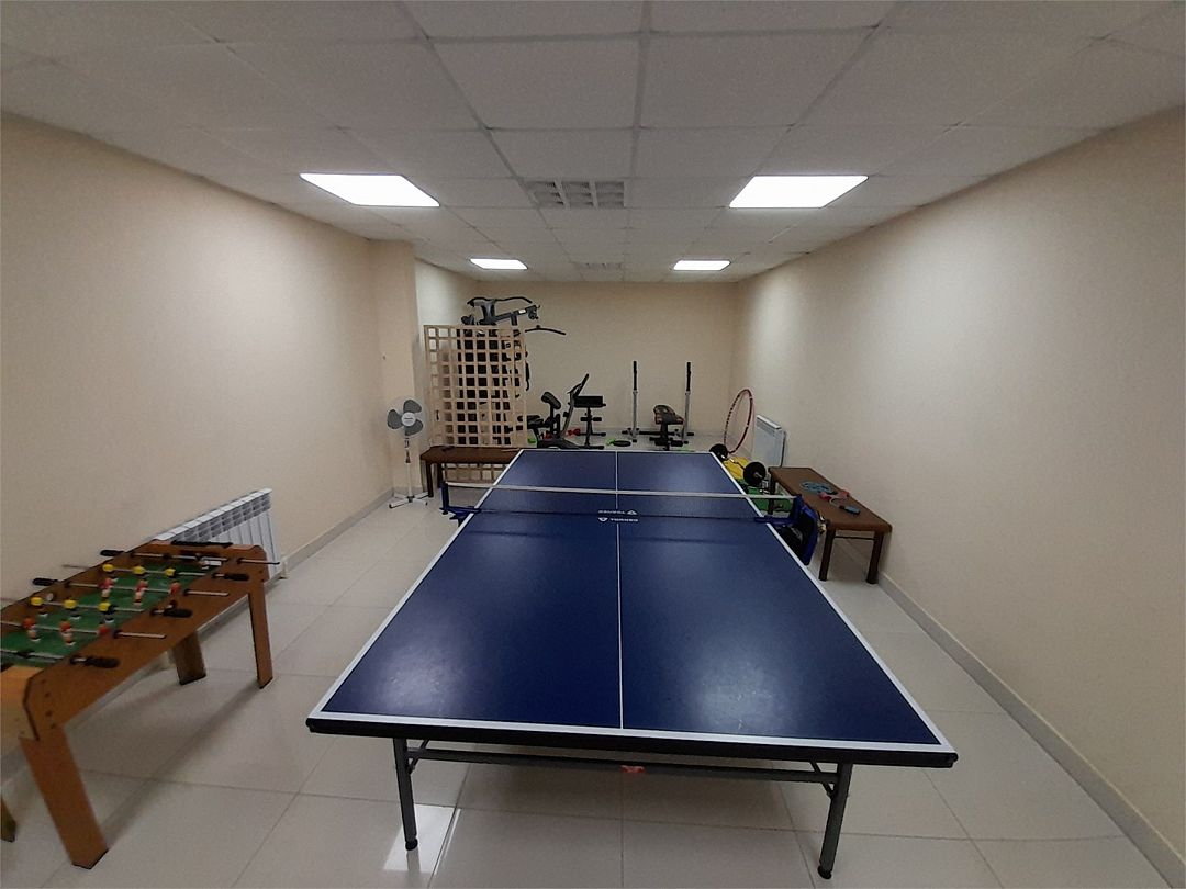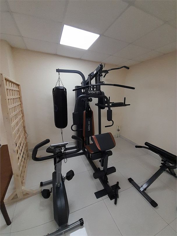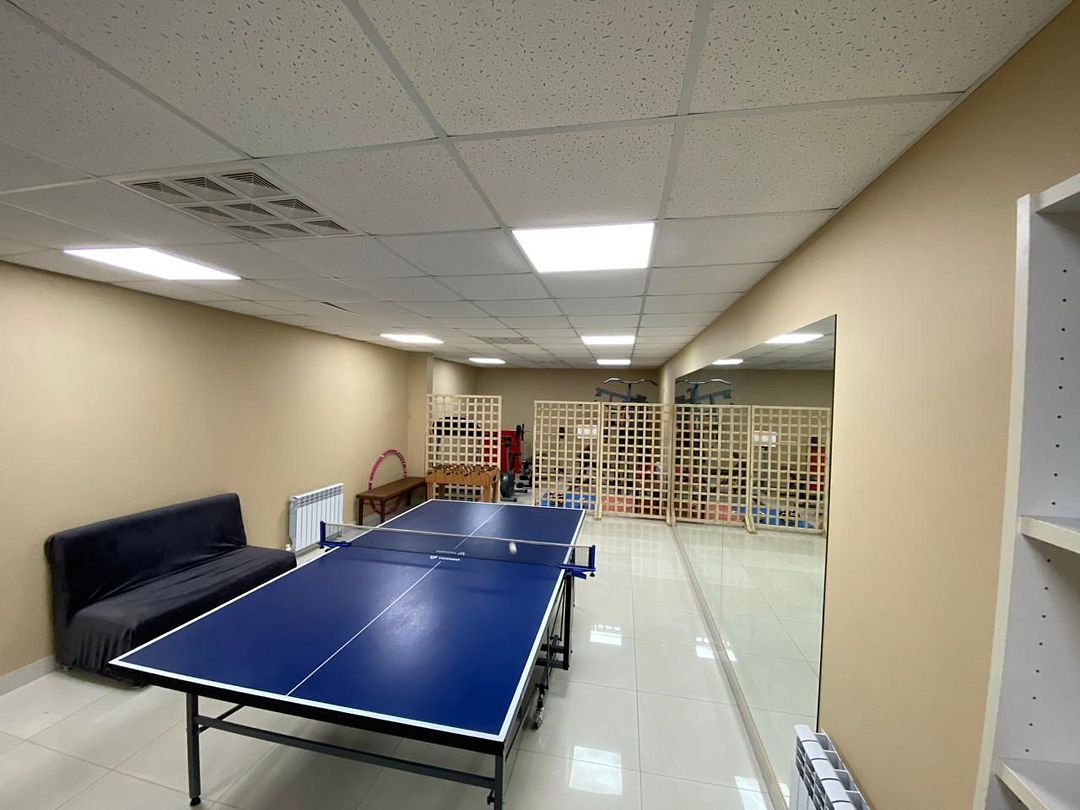 На нулевом этаже гостевого дома находится спортивная комната, оборудованная силовыми тренажерами, велотренажером и теннисным столом. Здесь можно отлично потренироваться и даже устроить соревнования по настольному теннису.