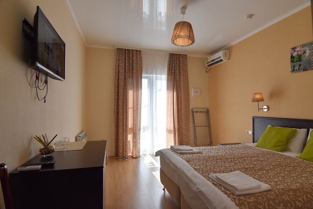 кабельное телевидение, Wi-Fi, интернет, холодильник, кондиционер, светильник, фен, ванная комната, санузел, банные полотенца, гигиенические средства, балкон, двуспальная кровать, две односпальные кровати, тумбы, шкаф для одежды, набор посуды, унитаз, раковина, отопление, душ, кулер на этаже, вид во двор, ламинат, кухонная посуда, стаканы, столовые приборы, стул, туалетные средства, сплит-система, сушилка для белья, телевизор с плоским экраном, мини-холодильник, москитная сетка, номер для некурящих, рабочий стол, уборка номера, вешалки-плечики, мыло, прачечная (за дополнительную плату)В гостиничном номере