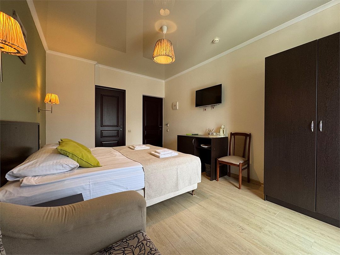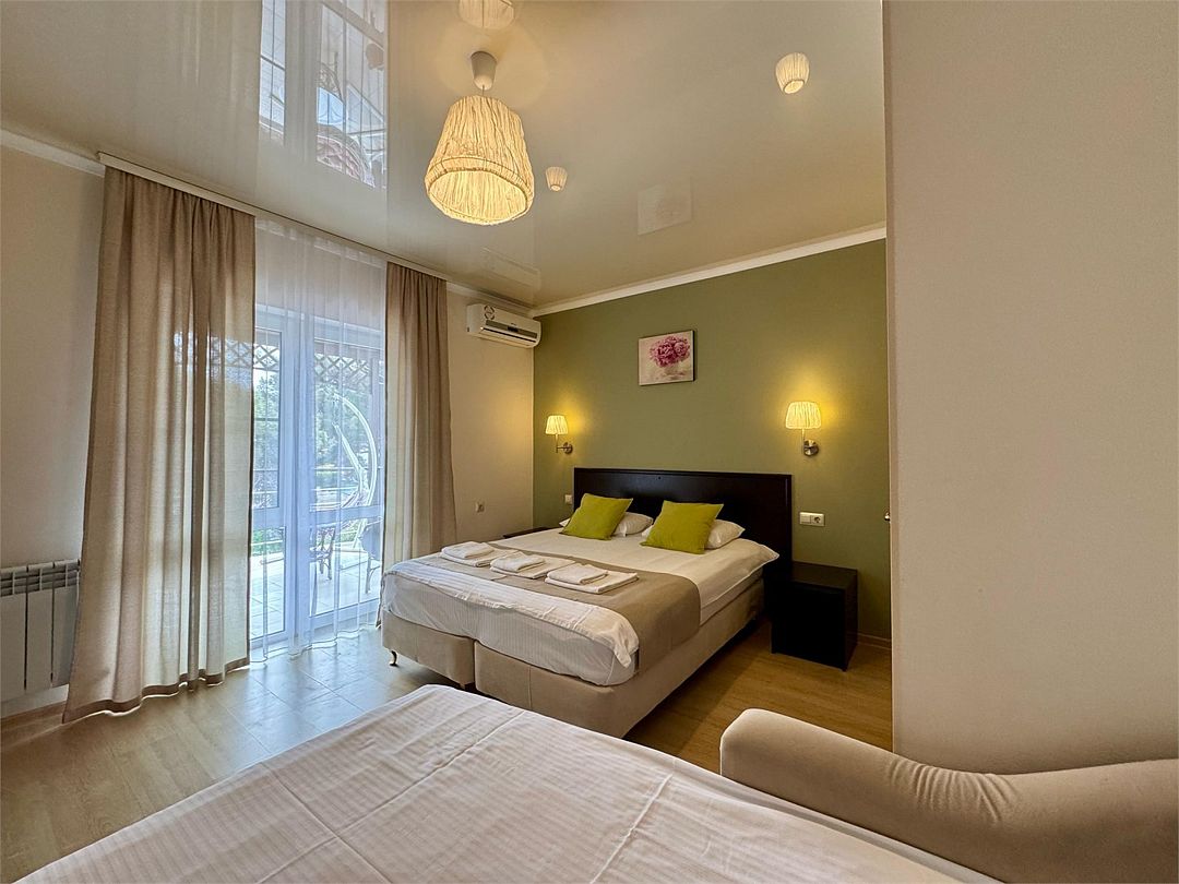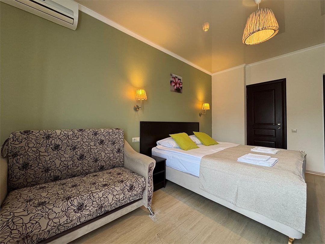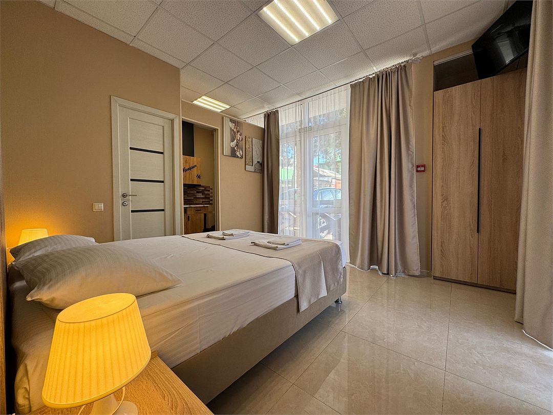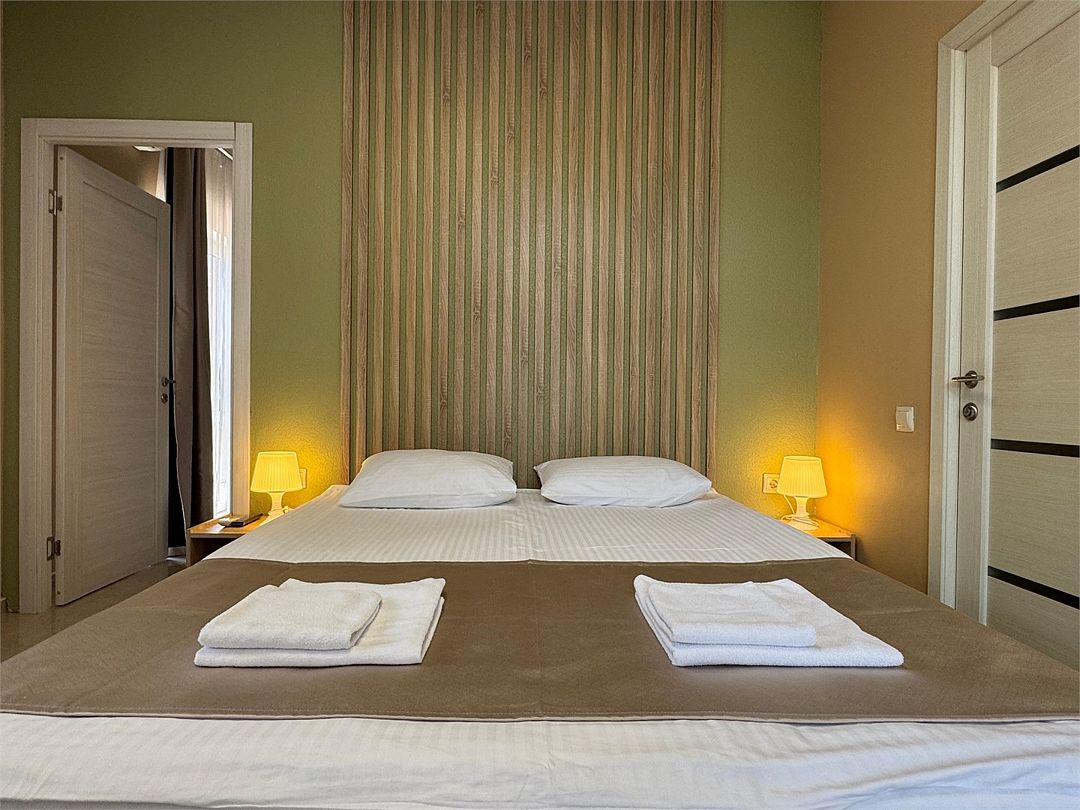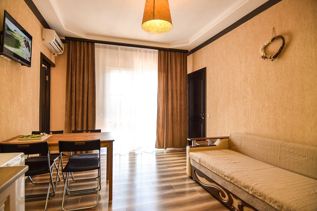 Двухкомнатные апартаменты на 1 этаже. В номере 1 спальня и гостиная-кухня. В спальне одна двуспальная кровать или две односпальные кровати (на выбор) и кресло-кровать (80х200). В гостиной-кухне диван-кровать (145х190). Выход из номера во двор гостевого дома.Услуги и удобства