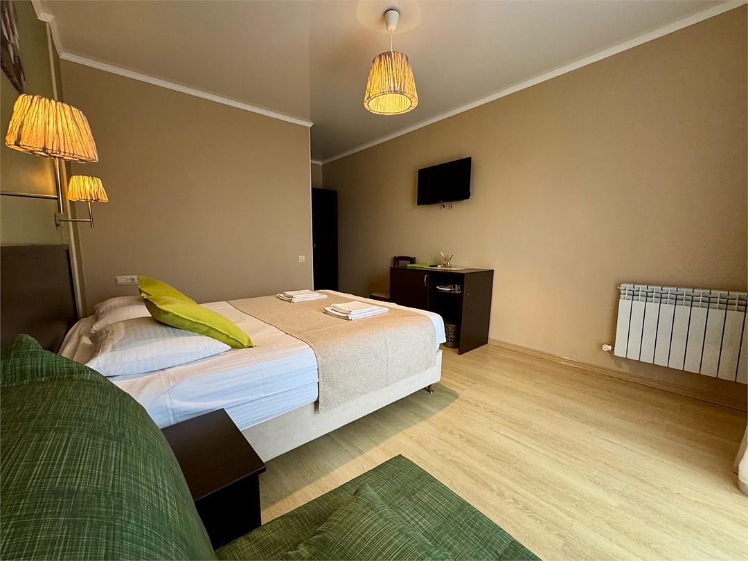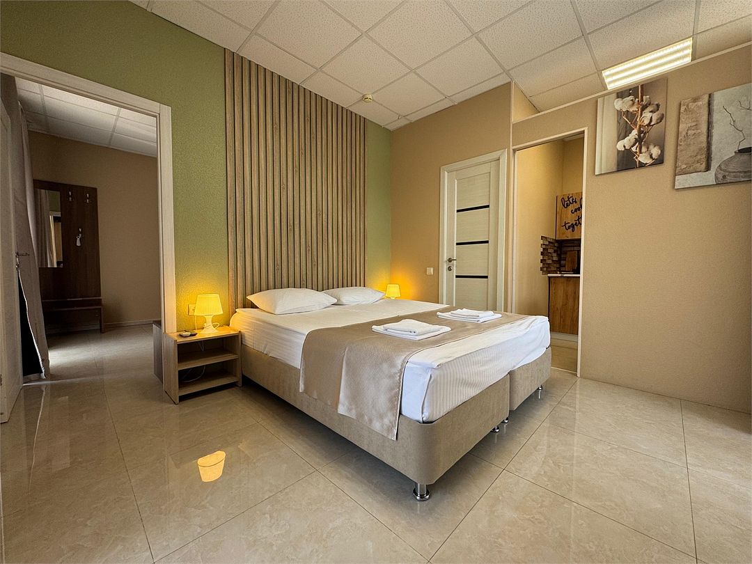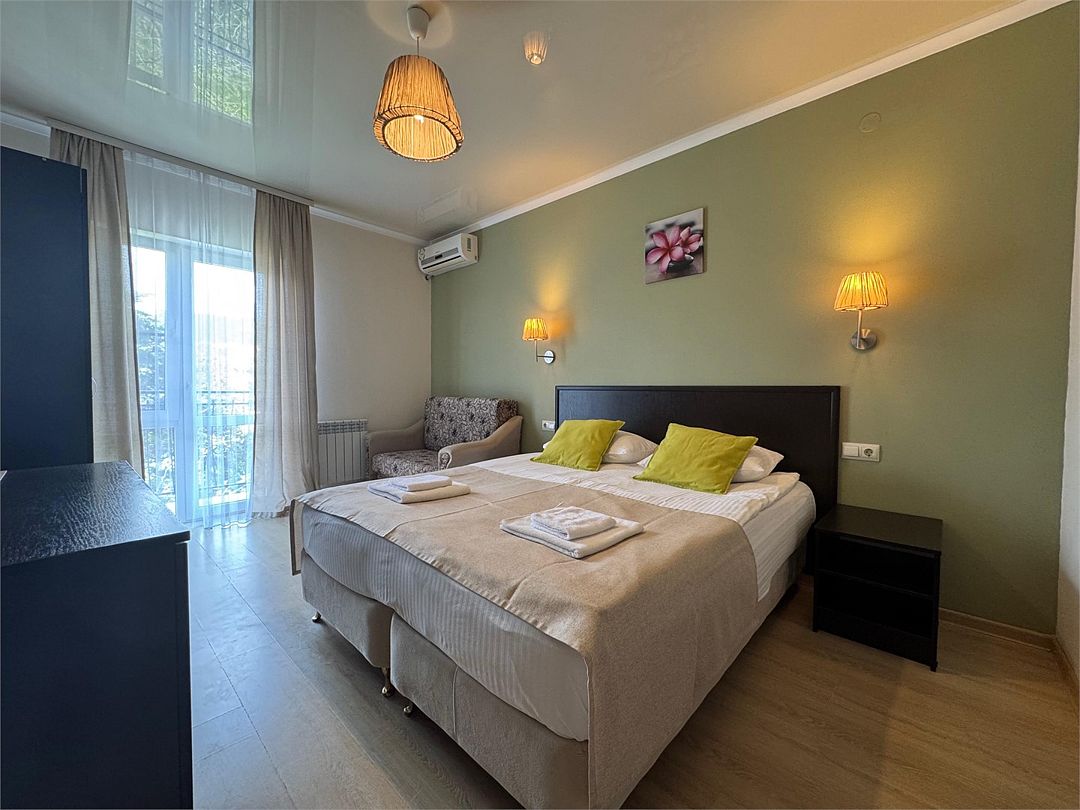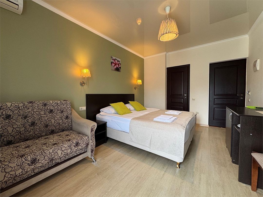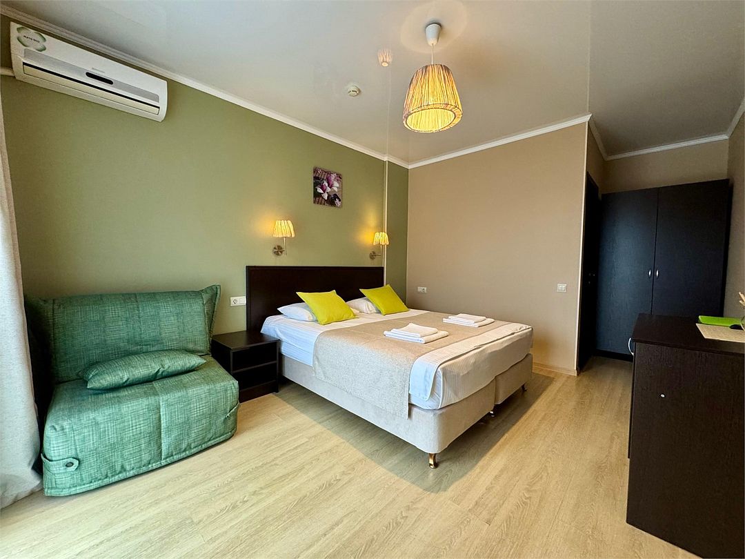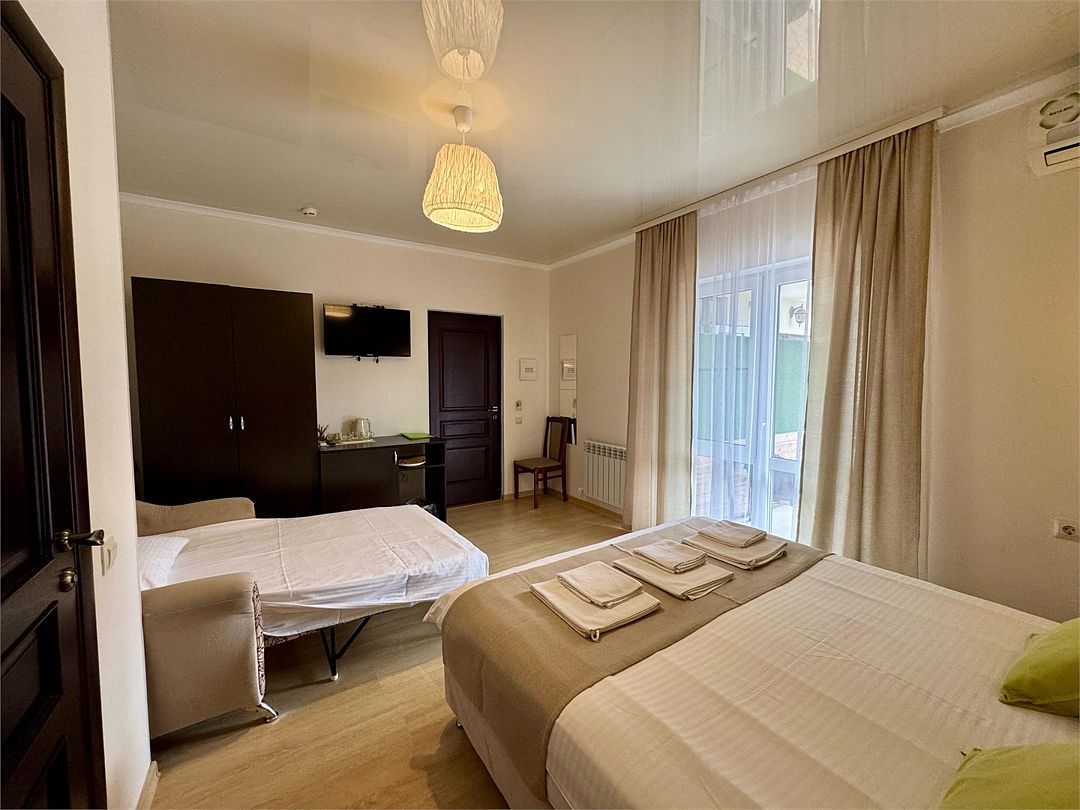 Двухкомнатные апартаменты на 1 этаже. В номере 1 спальня и гостиная-кухня. В спальне одна двуспальная кровать или две односпальные кровати (на выбор) и кресло-кровать (80х200). В гостиной-кухне диван-кровать (145х190). Выход из номера во двор гостевого дома.Услуги и удобства