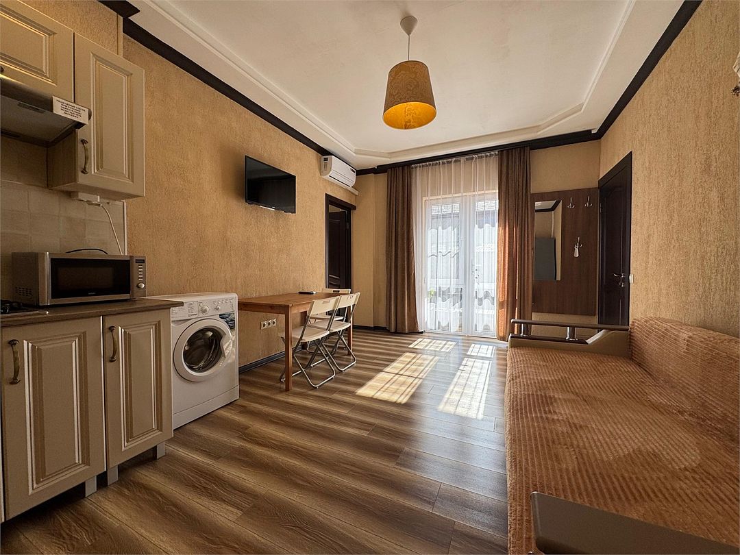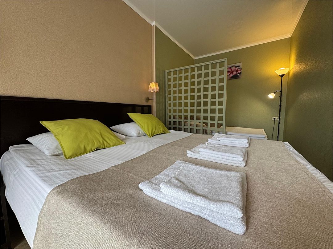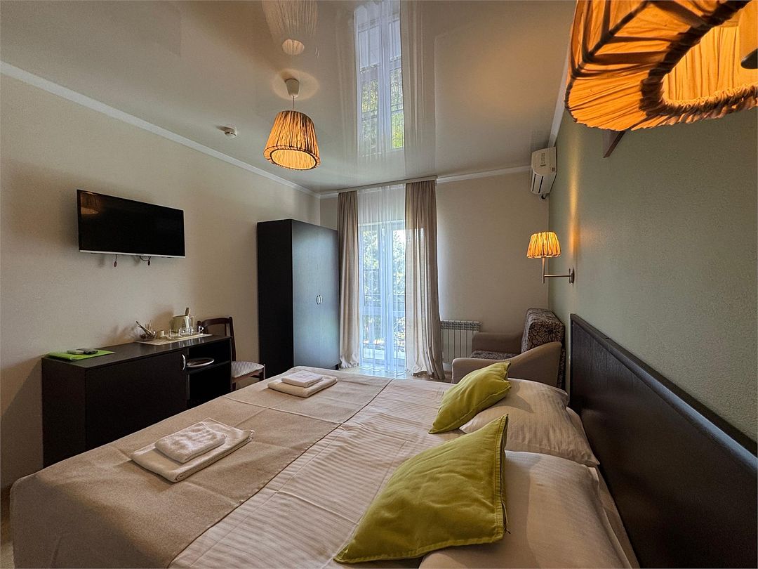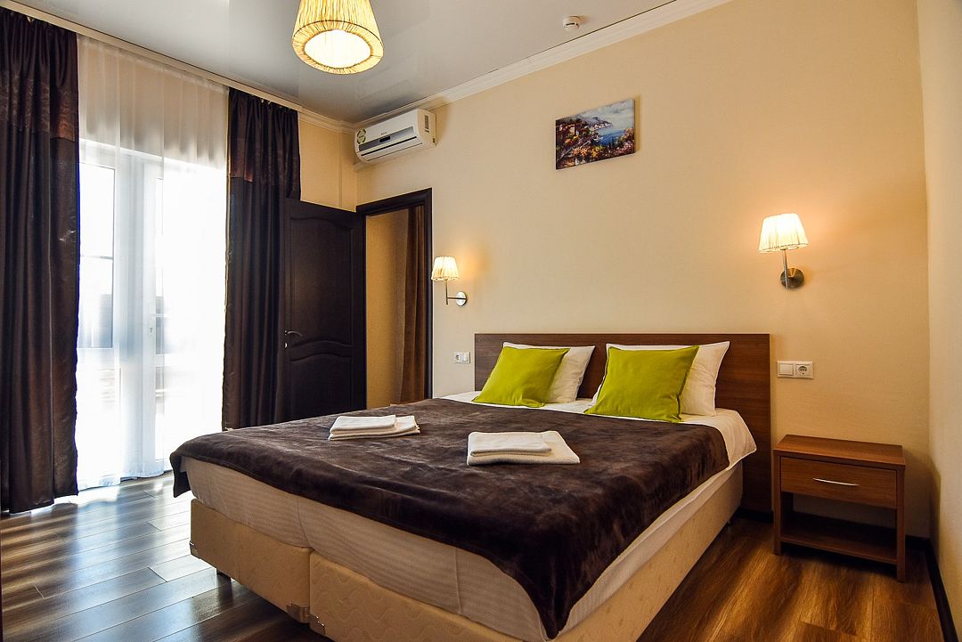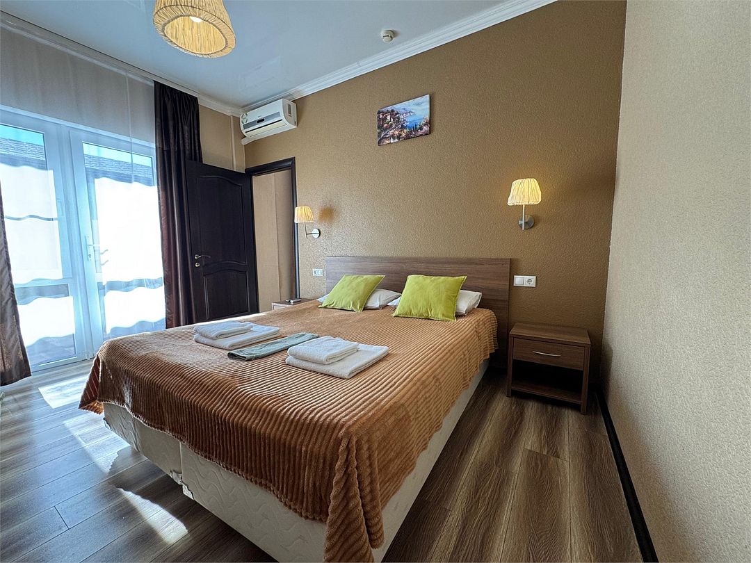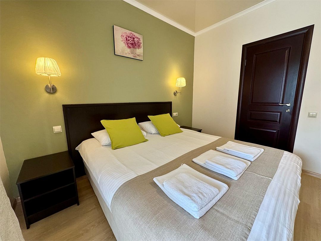 Двухкомнатные апартаменты на 1 этаже. В номере 1 спальня и гостиная-кухня. В спальне одна двуспальная кровать или две односпальные кровати (на выбор) и кресло-кровать (80х200). В гостиной-кухне диван-кровать (145х190). Выход из номера во двор гостевого дома.Услуги и удобства