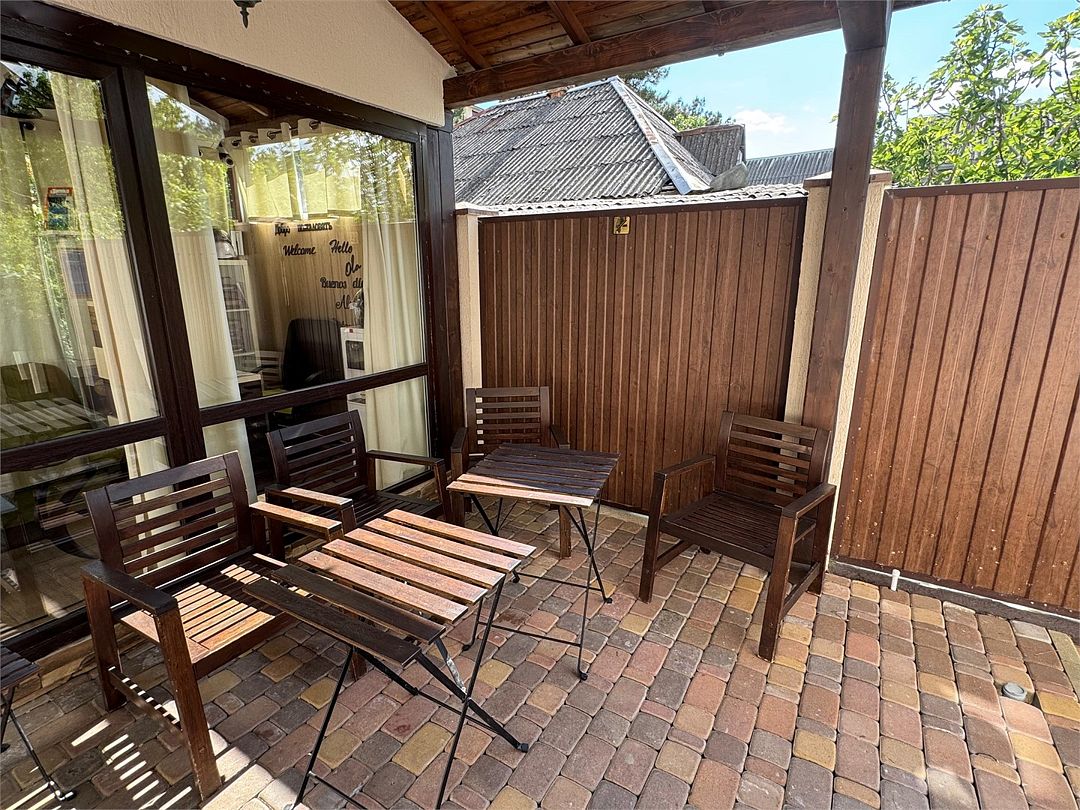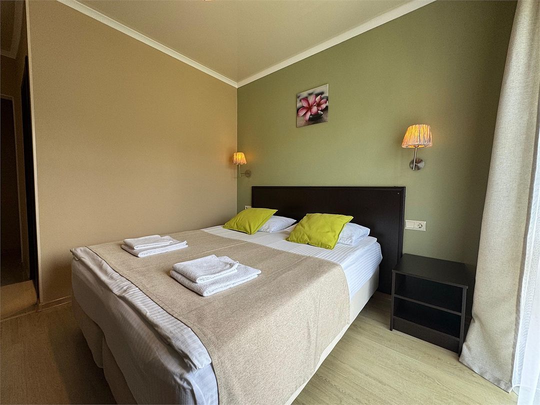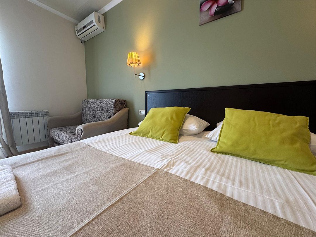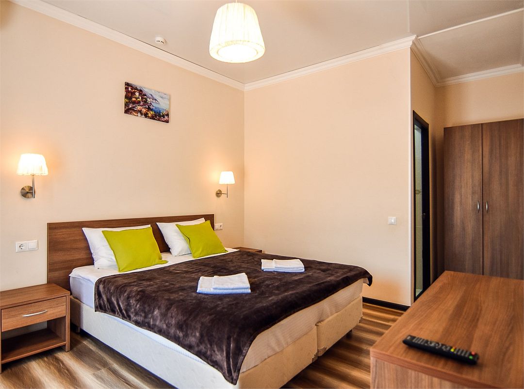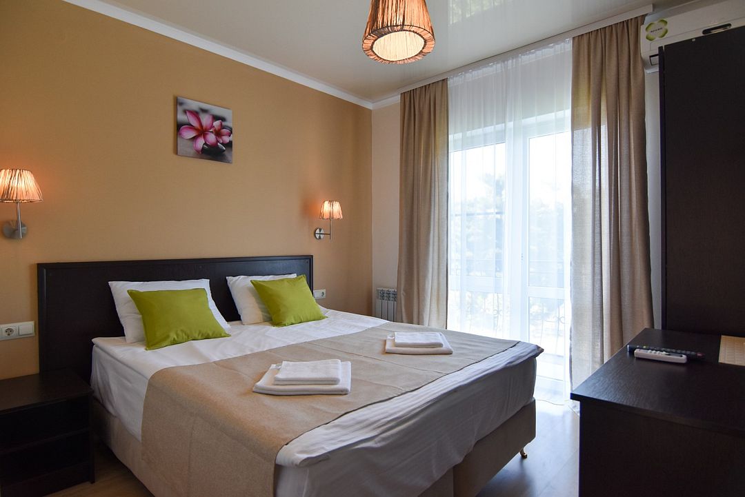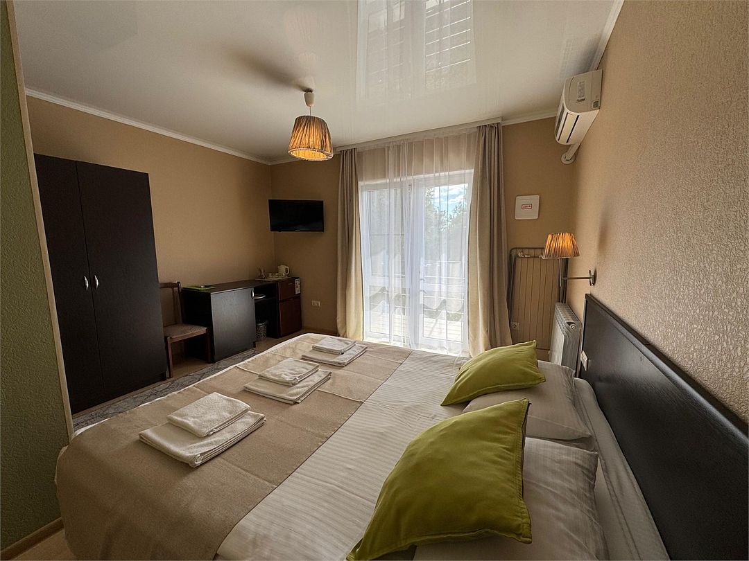 Двухкомнатные апартаменты на 1 этаже. В номере 1 спальня и гостиная-кухня. В спальне одна двуспальная кровать или две односпальные кровати (на выбор) и кресло-кровать (80х200). В гостиной-кухне диван-кровать (145х190). Выход из номера во двор гостевого дома.Услуги и удобства