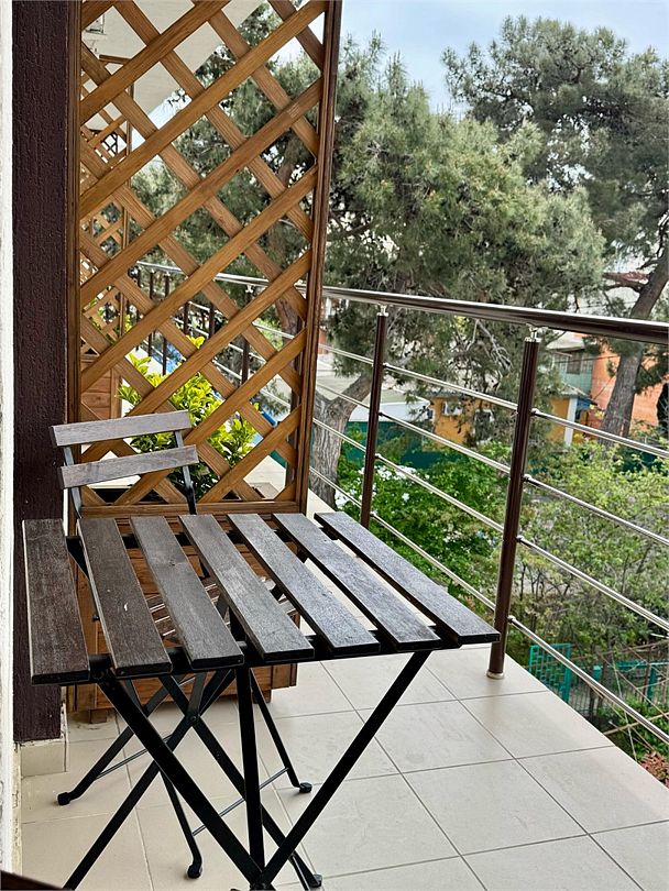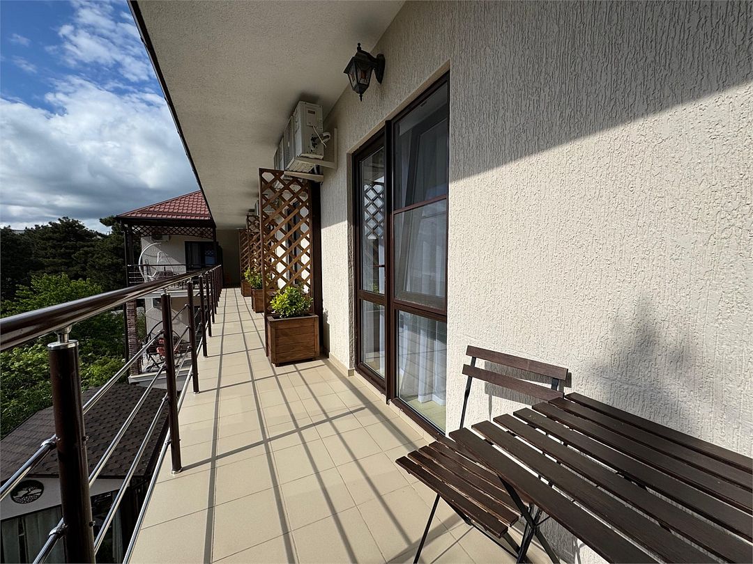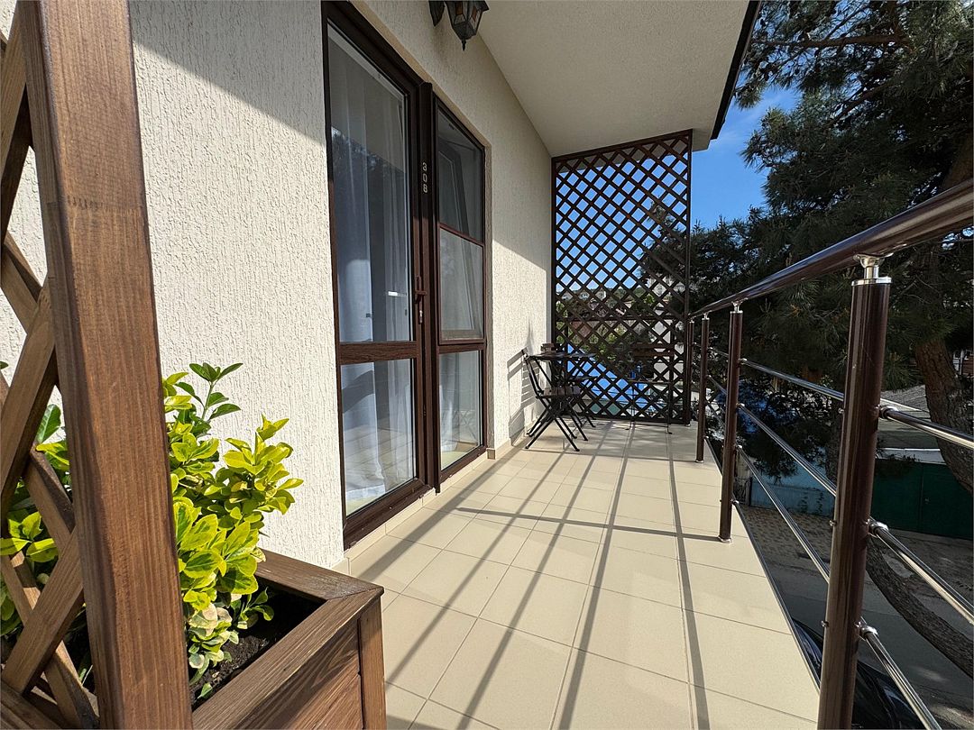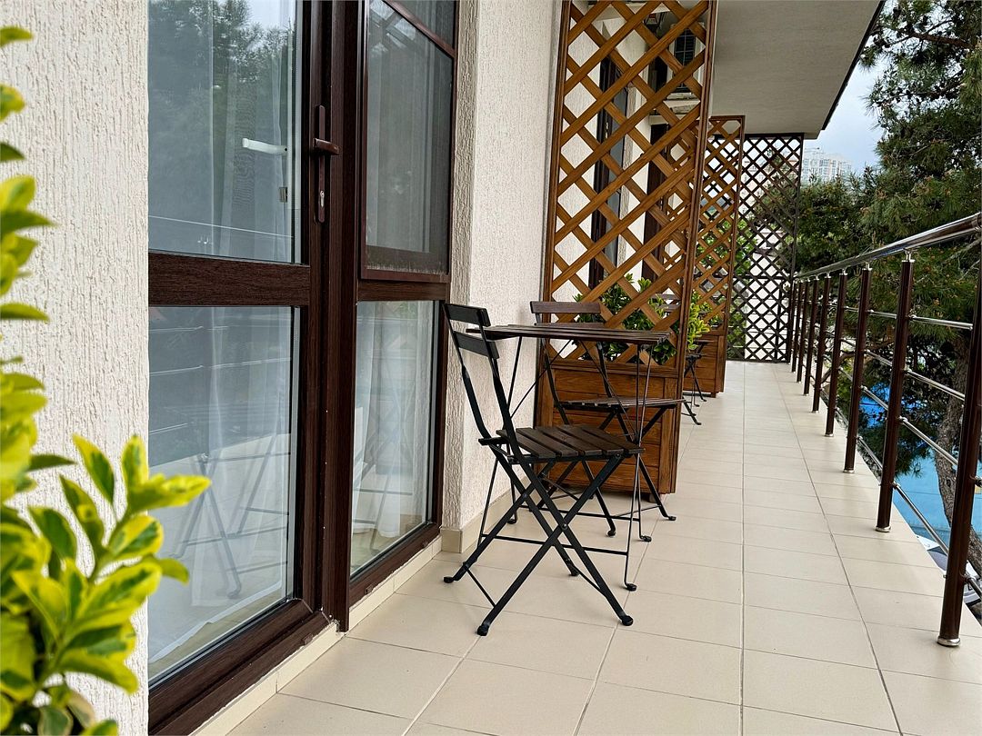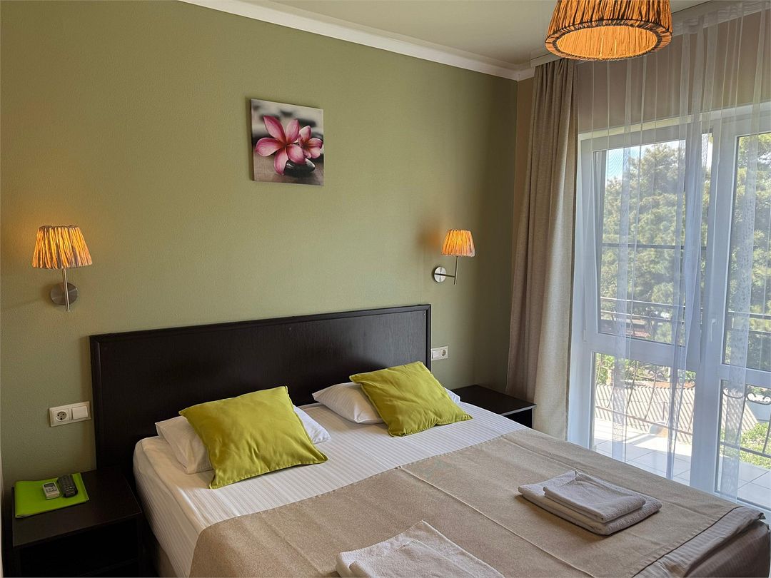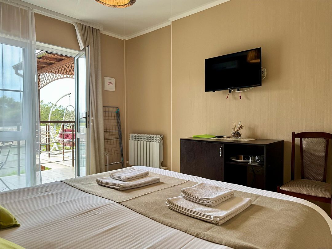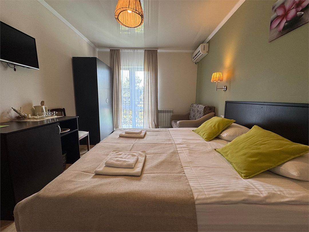 Трёхместный номер с общим балконом с одной двуспальной кроватью или двумя односпальными кроватями (на выбор) и диваном-кроватью (110х190). На балконе имеется индивидуальная уличная мебель.Услуги и удобства