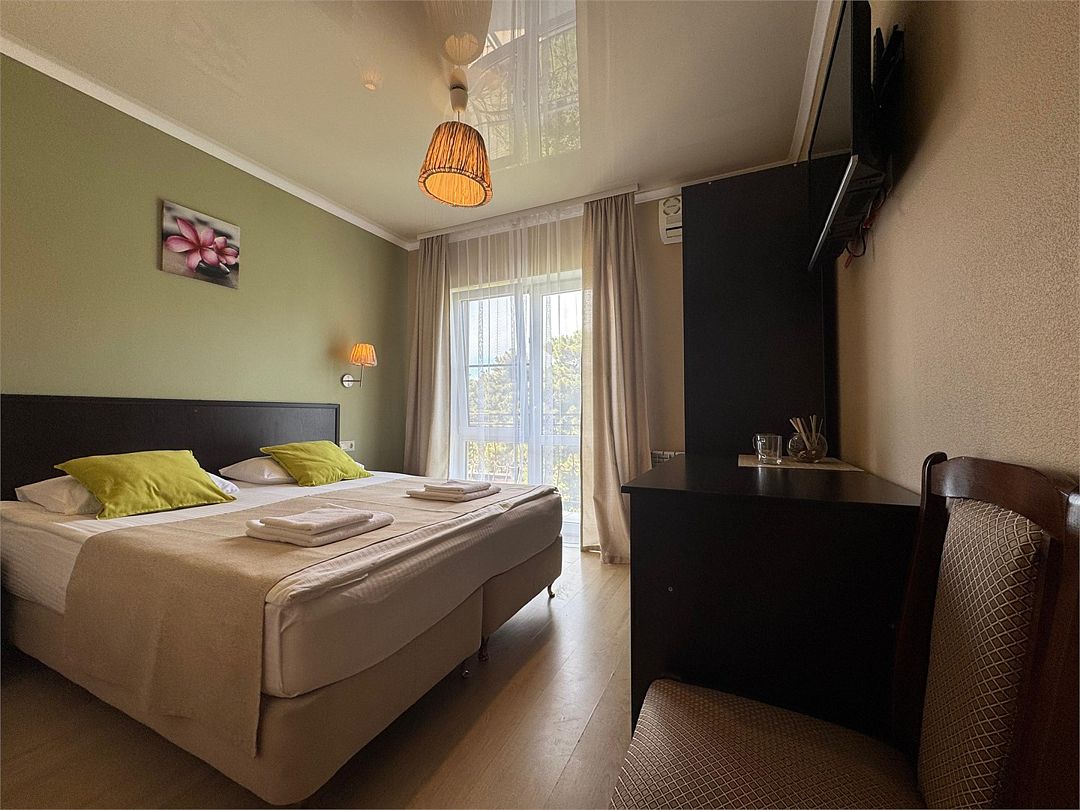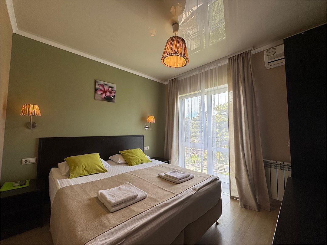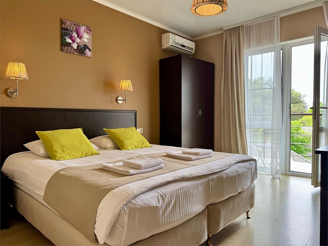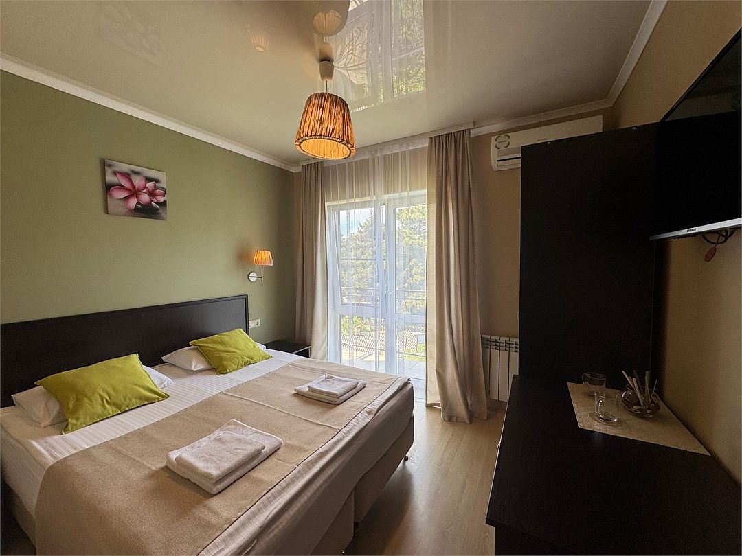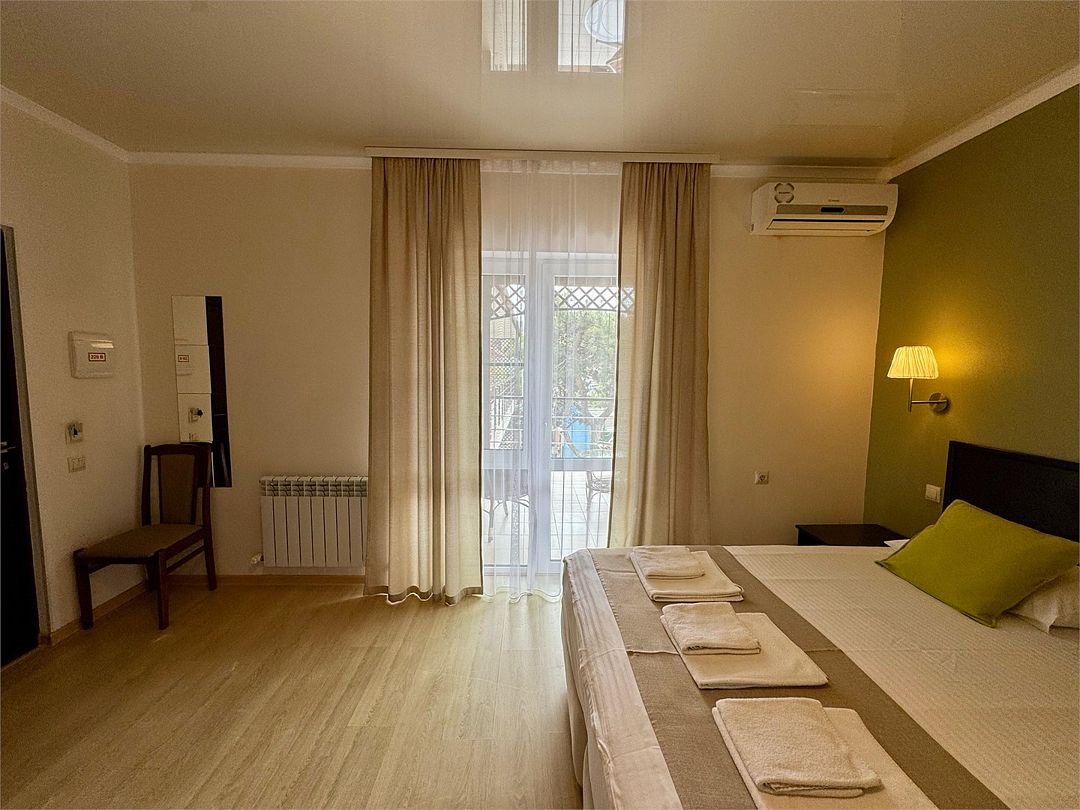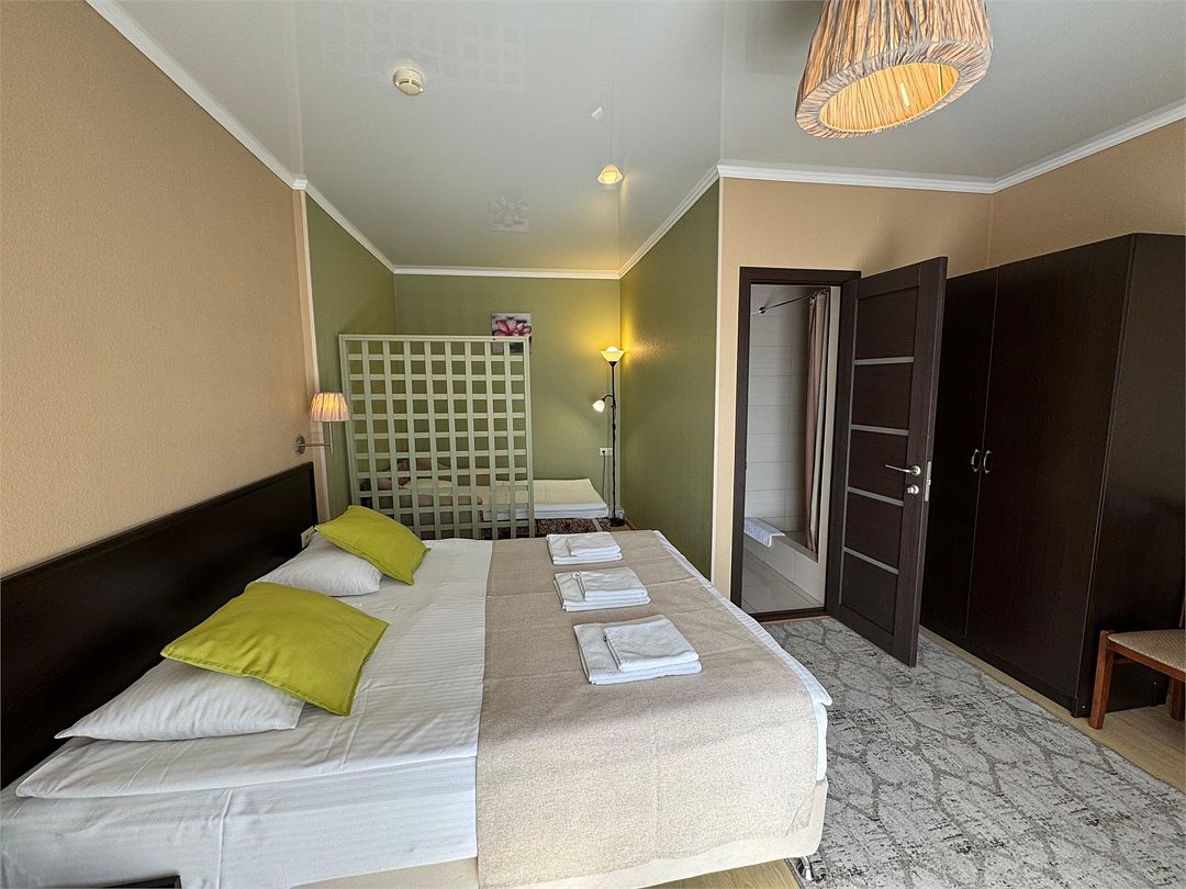 Трёхместный номер с одной двуспальной кроватью или двумя односпальными кроватями (на выбор), с раскладным диваном-кроватью (110х190). Номер имеет собственную террасу площадью 9 кв.м. Терраса оснащена уличной мебелью и качелью.Услуги и удобства