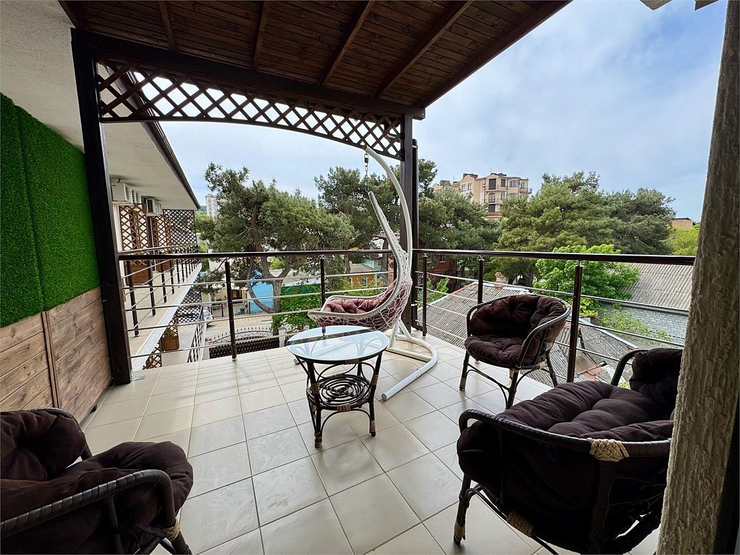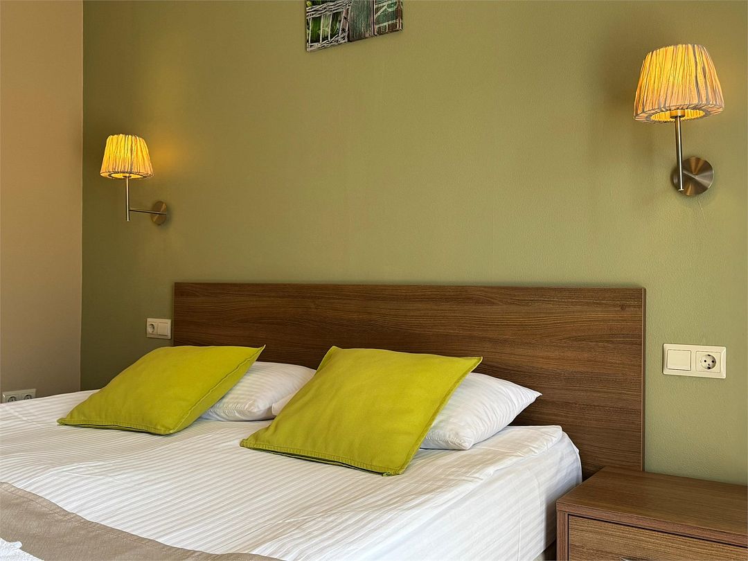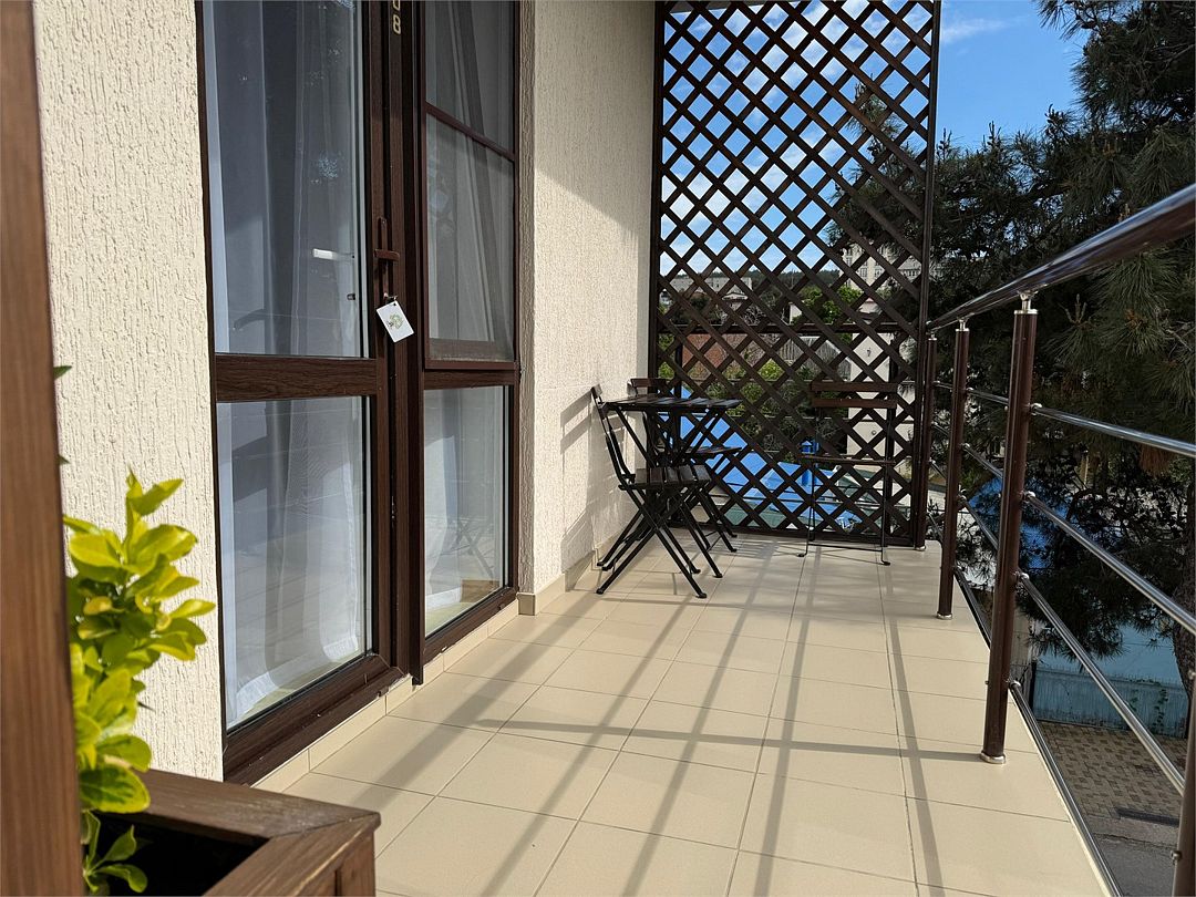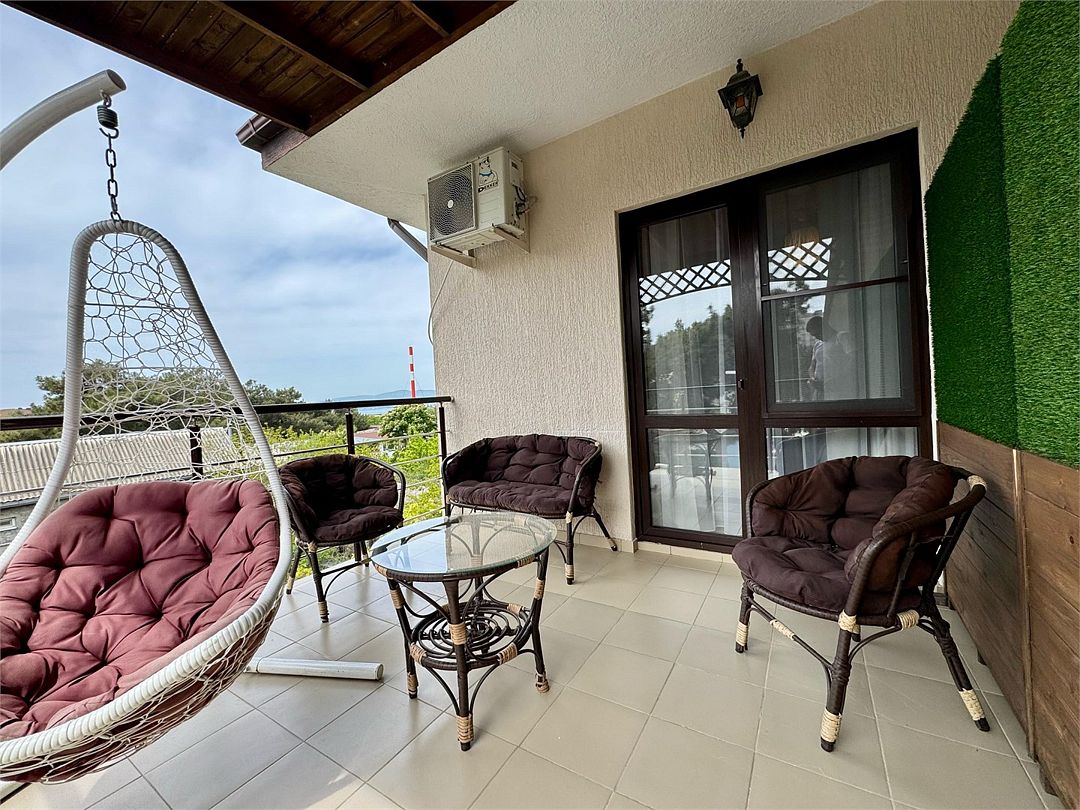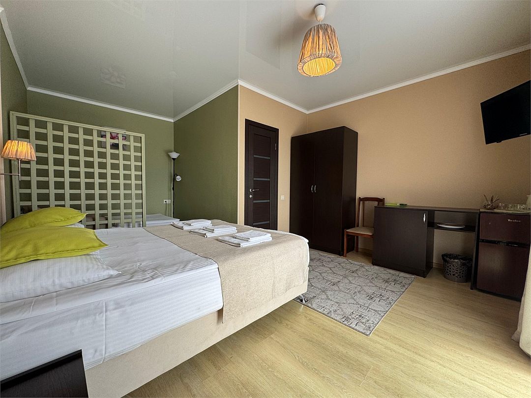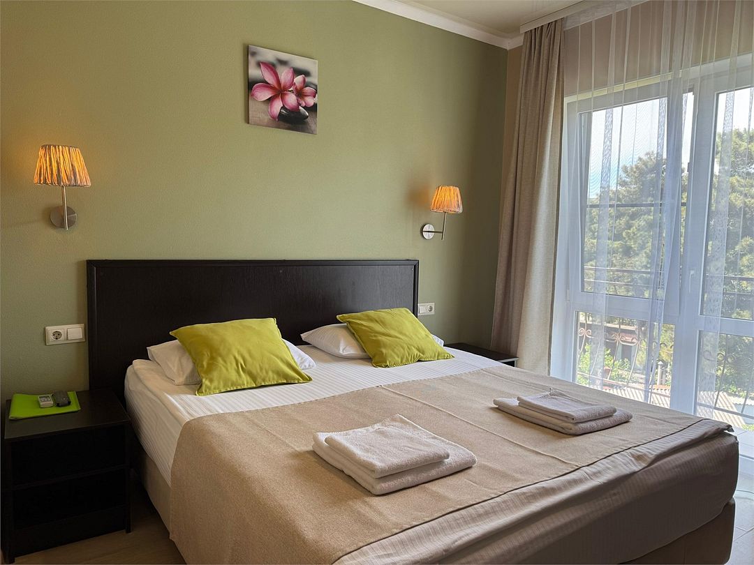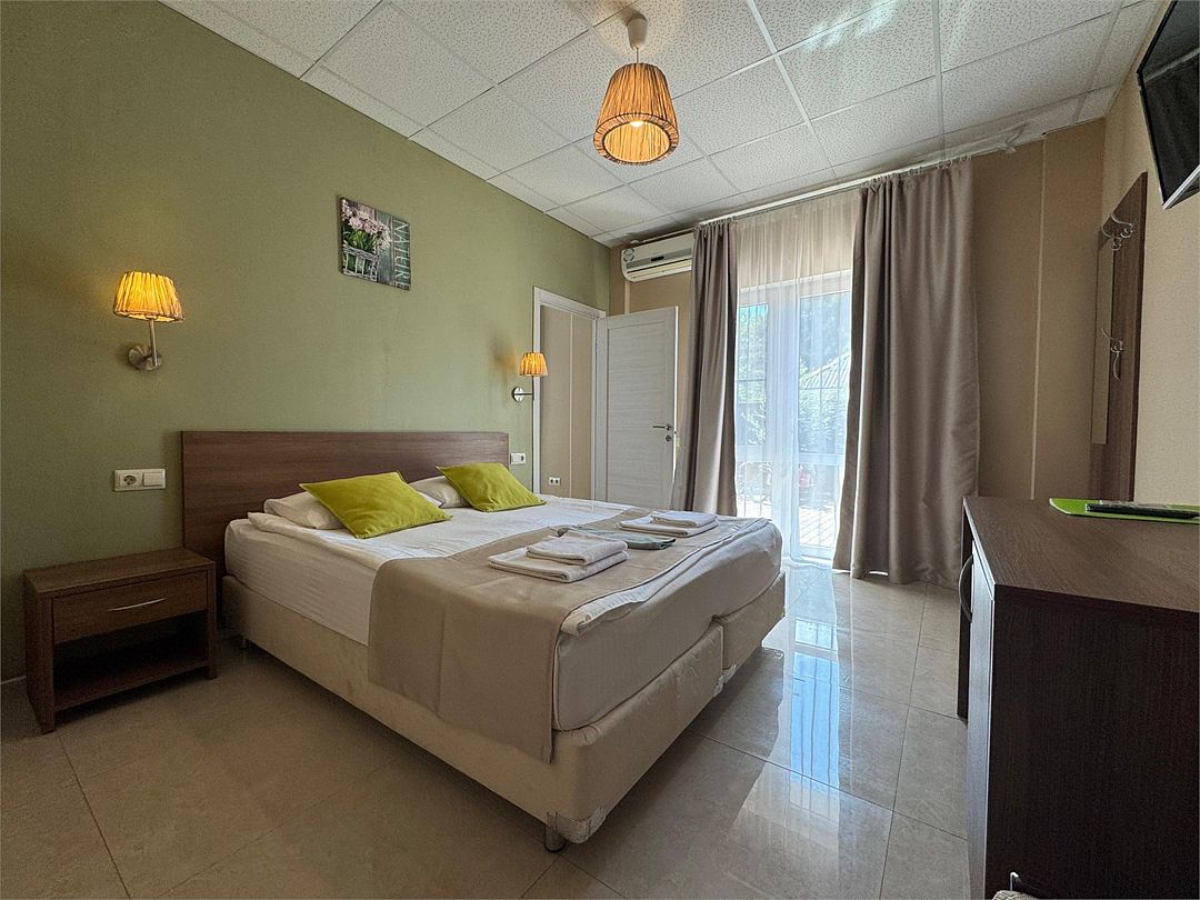 Трёхместный номер с одной двуспальной кроватью или двумя односпальными кроватями (на выбор), с раскладным диваном-кроватью (110х190). Номер имеет собственную террасу площадью 9 кв.м. Терраса оснащена уличной мебелью и качелью.Услуги и удобства