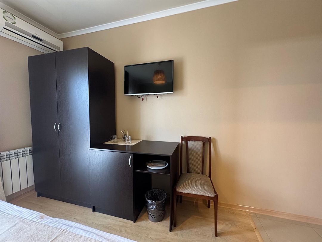 Wi-Fi, интернет, фен, банные полотенца, гигиенические средства, балкон, двуспальная кровать, две односпальные кровати, тумбы, шкаф для одежды, зеркало, набор посуды, унитаз, раковина, отопление, душ, кулер на этаже, вид во двор, ламинат, стаканы, столовые приборы, стул, туалетные средства, туалет, сплит-система, сушилка для белья, телевизор с плоским экраном, мини-холодильник, москитная сетка, номер для некурящих, рабочий стол, кресло-кровать, уборка номера, вешалки-плечики, мылоВ гостиничном номере