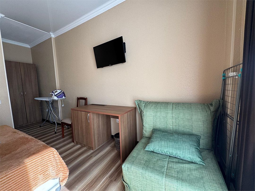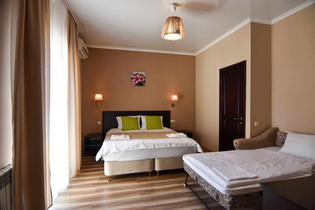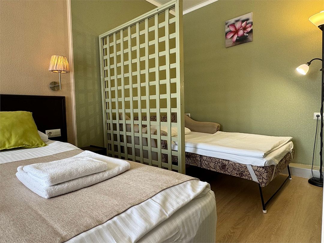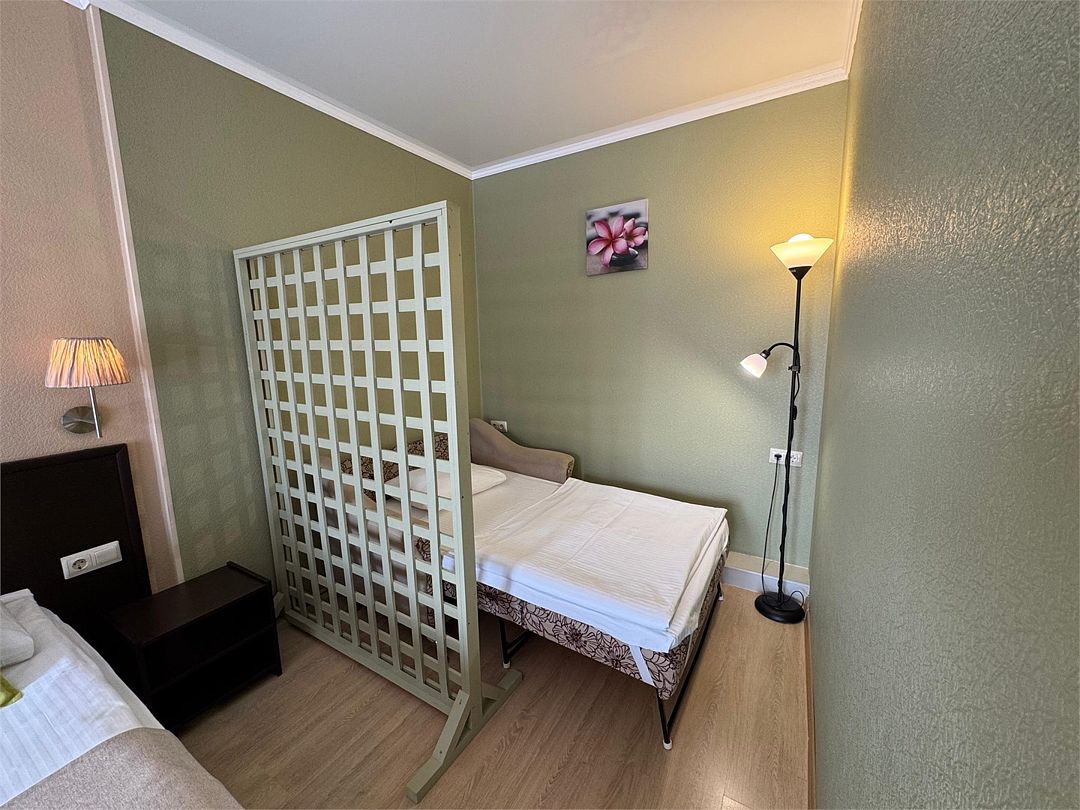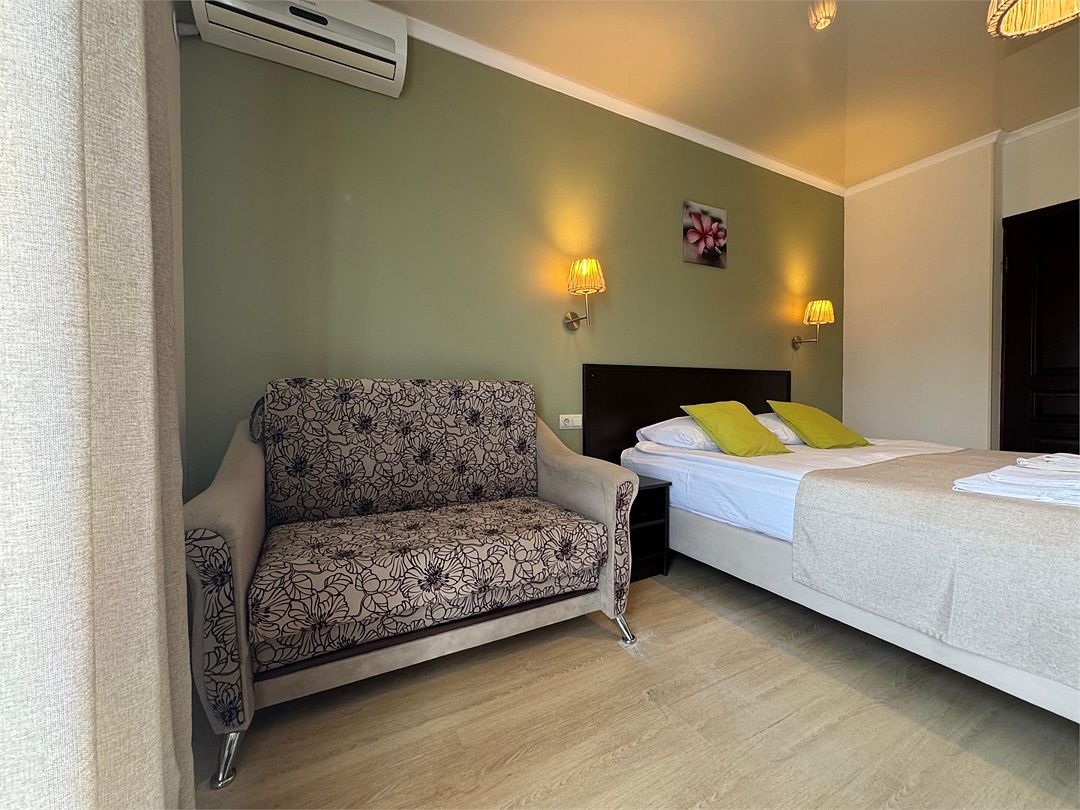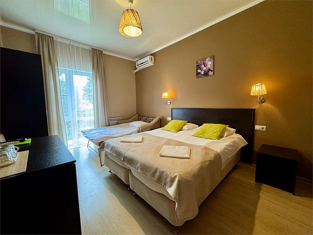 Трёхместный номер с одной двуспальной кроватью или двумя односпальными кроватями (на выбор), раскладной диван-кровать (110х190). Имеется маленький индивидуальный балкон без уличной мебели.Услуги и удобства