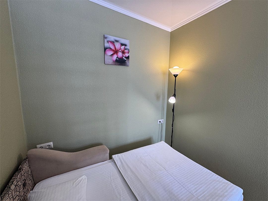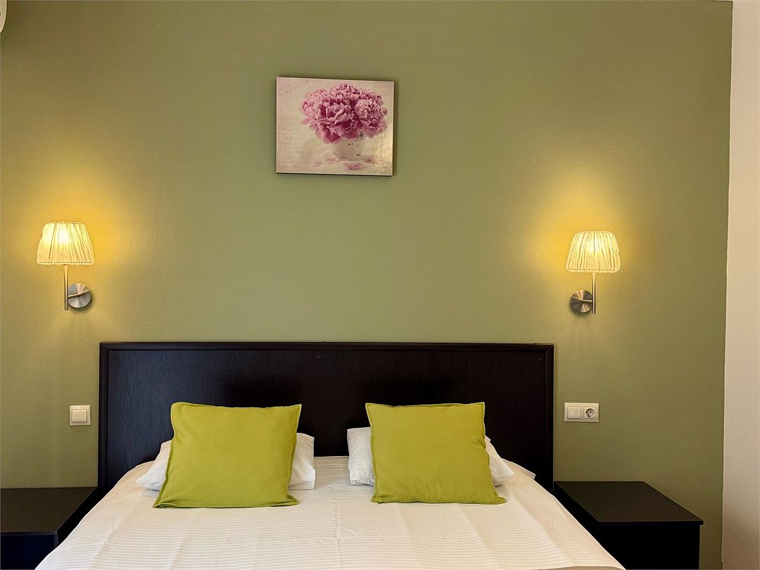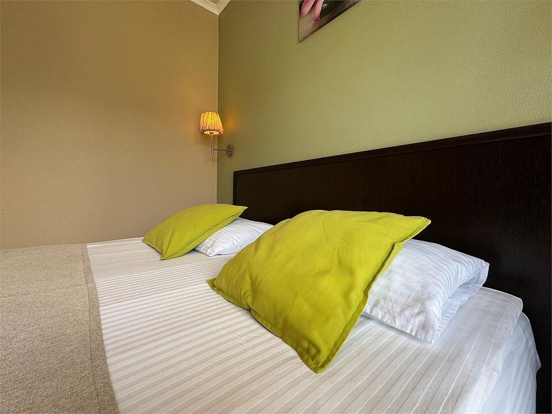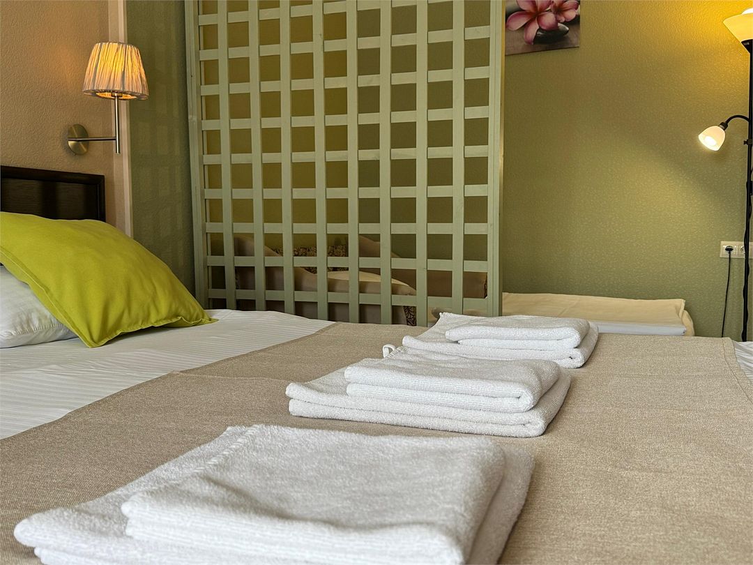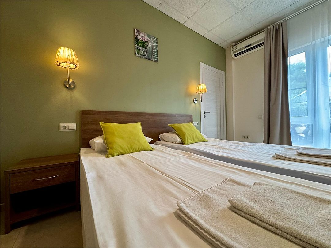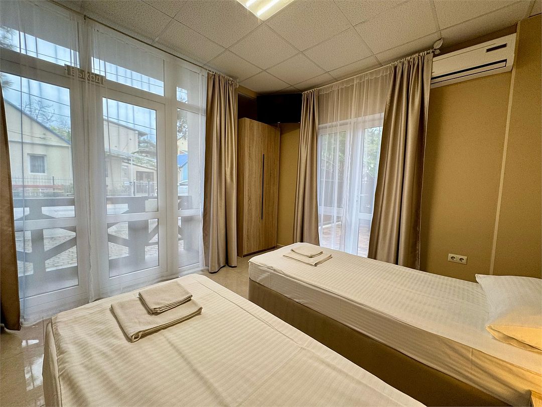 Трёхместный номер с одной двуспальной кроватью или двумя односпальными кроватями (на выбор), раскладной диван-кровать (110х190). Имеется маленький индивидуальный балкон без уличной мебели.Услуги и удобства
