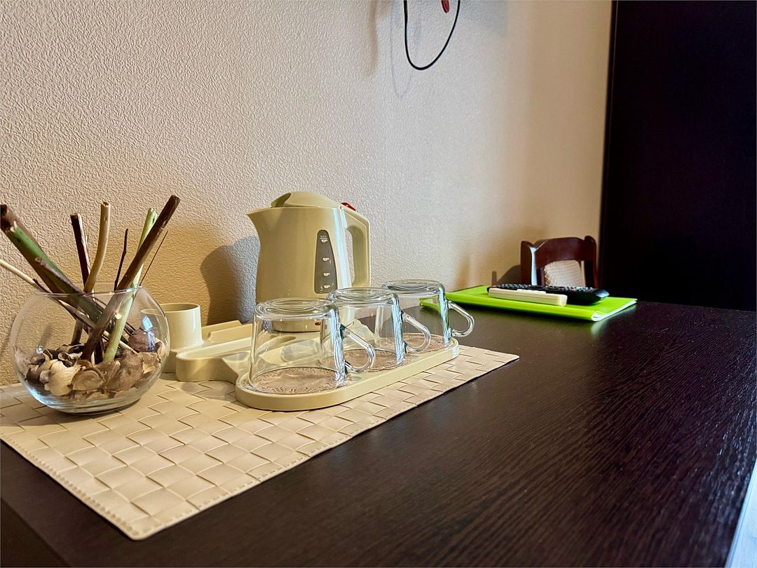 На 2 и 3 этажах гостевого дома «KESEA Family» расположены мини кухонные зоны общего пользования с необходимым инвентарем для приготовления пищи (общий холодильник, микроволновая печь, 2 газовые конфорки, общая гладильная доска с утюгом, а также вся необходимая посуда).