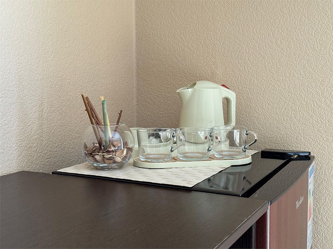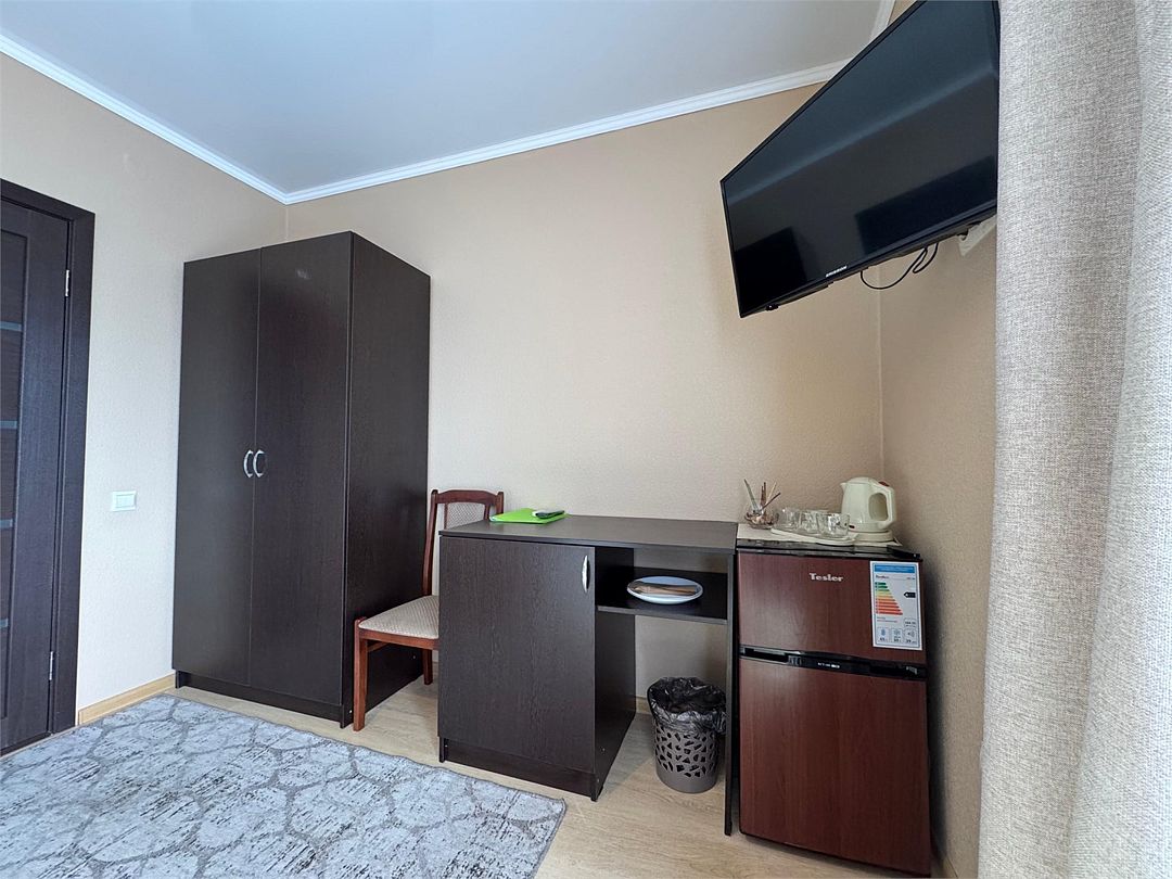 Wi-Fi, интернет, фен, банные полотенца, гигиенические средства, балкон, двуспальная кровать, две односпальные кровати, шкаф для одежды, зеркало, набор посуды, чайник, унитаз, раковина, душ, кулер на этаже, стаканы, столовые приборы, стул, сплит-система, сушилка для белья, диван-кровать, телевизор с плоским экраном, мини-холодильник, москитная сетка, номер для некурящих, рабочий столВ гостиничном номере