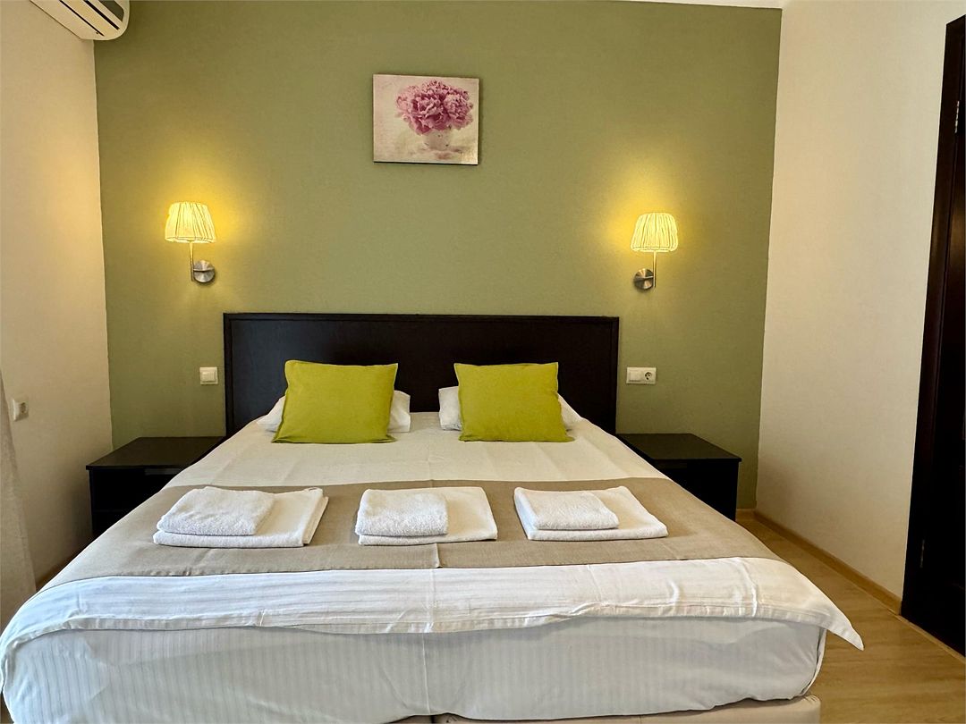 Основные спальные места:одна двуспальная кровать или две односпальные кровати и раскладной диван. С/У с душем, ТВ, мини-холодильник, сплит система