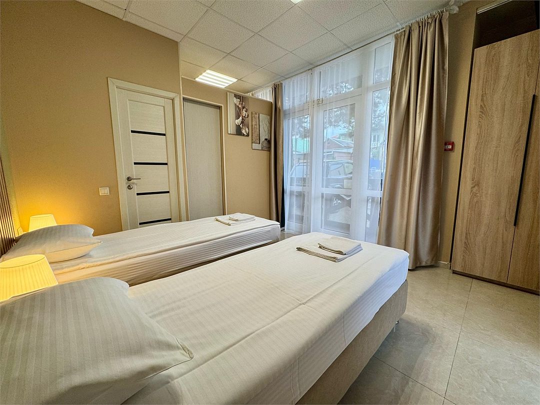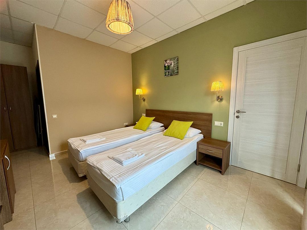 Двухкомнатные апартаменты на 1 этаже с отдельным входом. В апартаментах две комнаты. В каждой комнате имеется одна двуспальная кровать, либо две односпальные кровати (на выбор). В одной из комнат находится мини-кухня. Два входа в апартаменты: со стороны двора гостевого дома и с улицы.Услуги и удобства