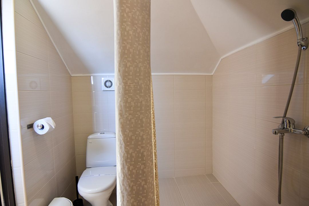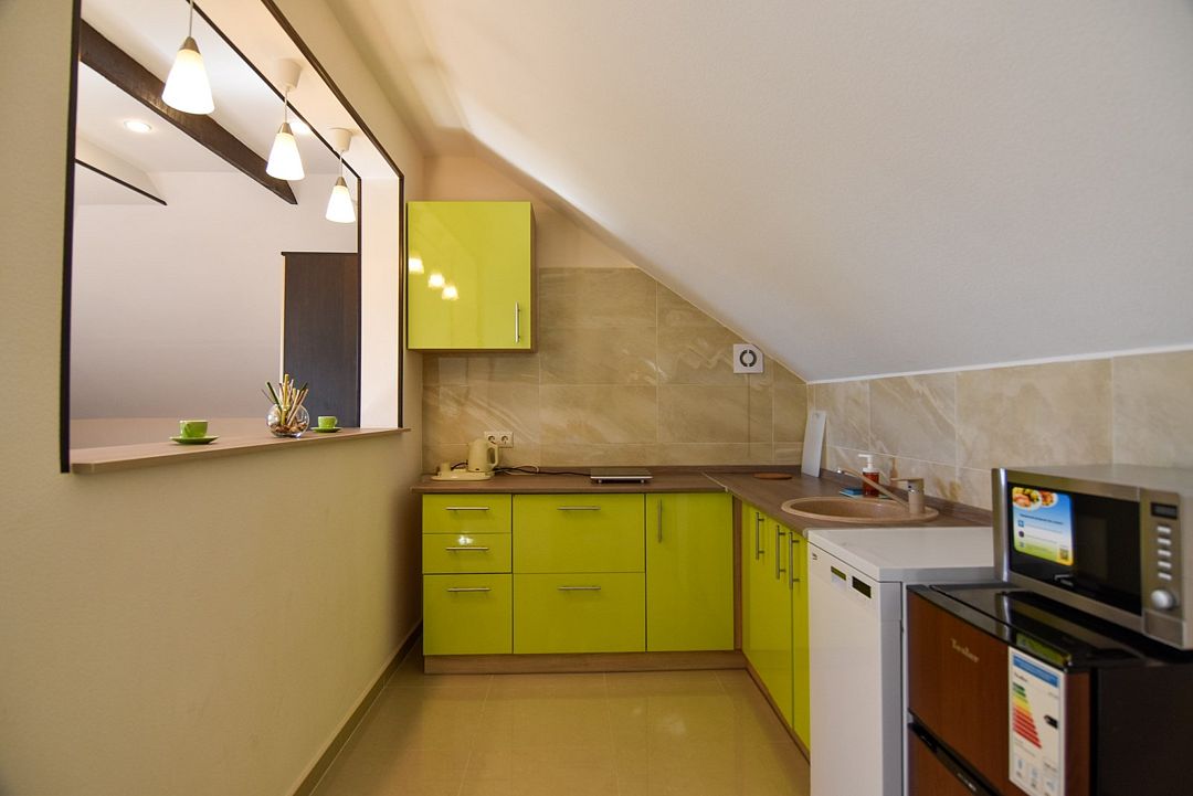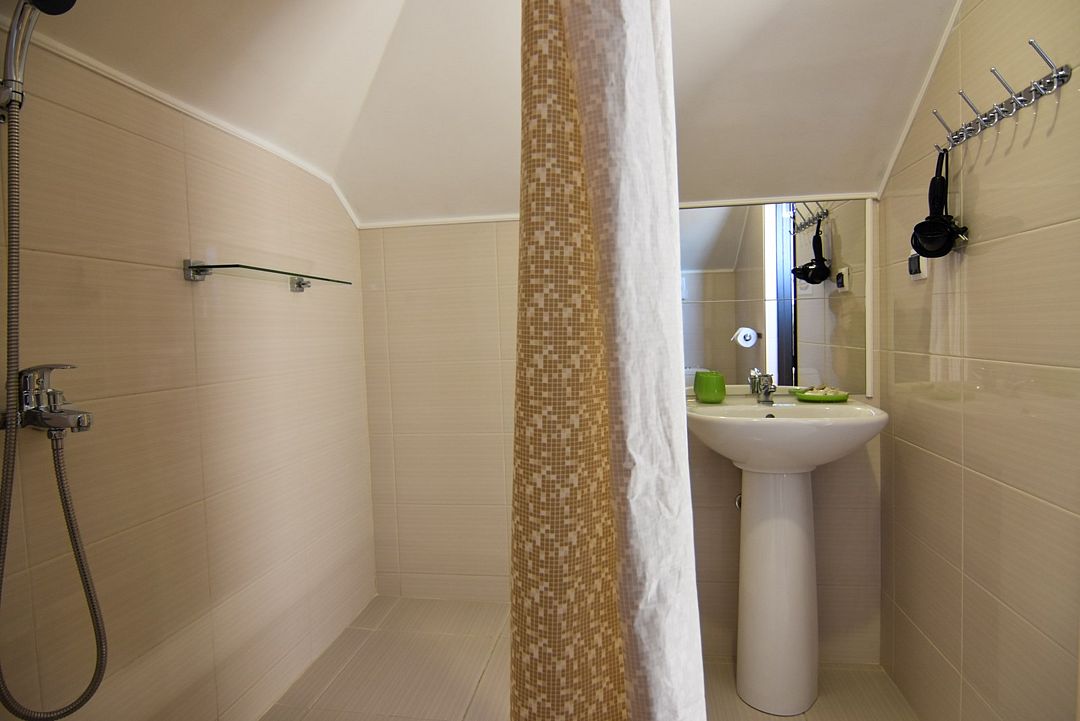 Мансардный Однокомнатный номер - студия с одной двуспальной или двумя односпальными кроватями и диваном-кроватью (110х190). Номер оснащён мини-кухней. В коридоре имеется гладильная доска и утюг (на 2 номера).Услуги и удобства