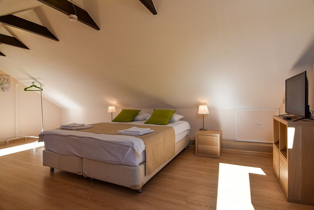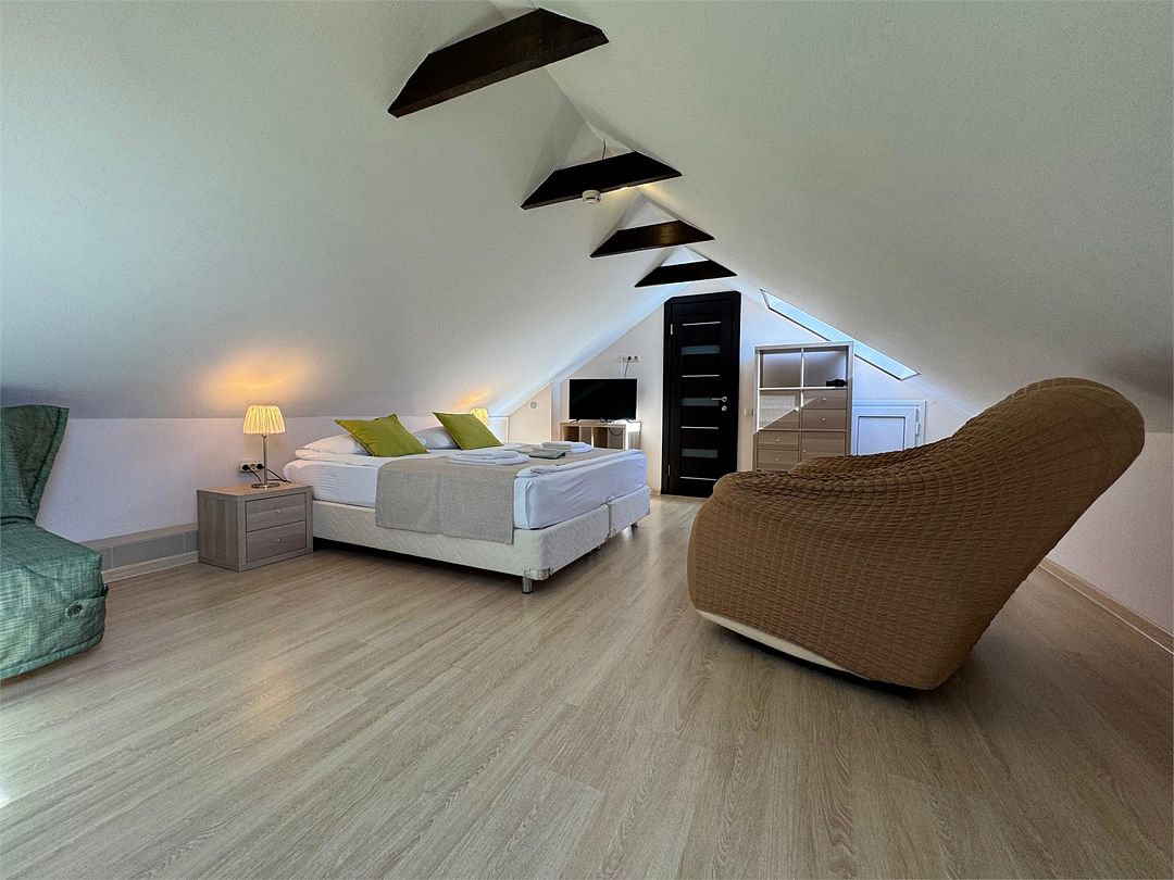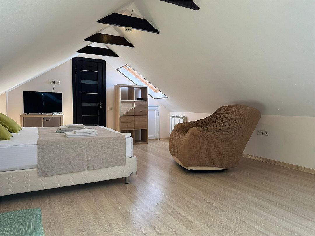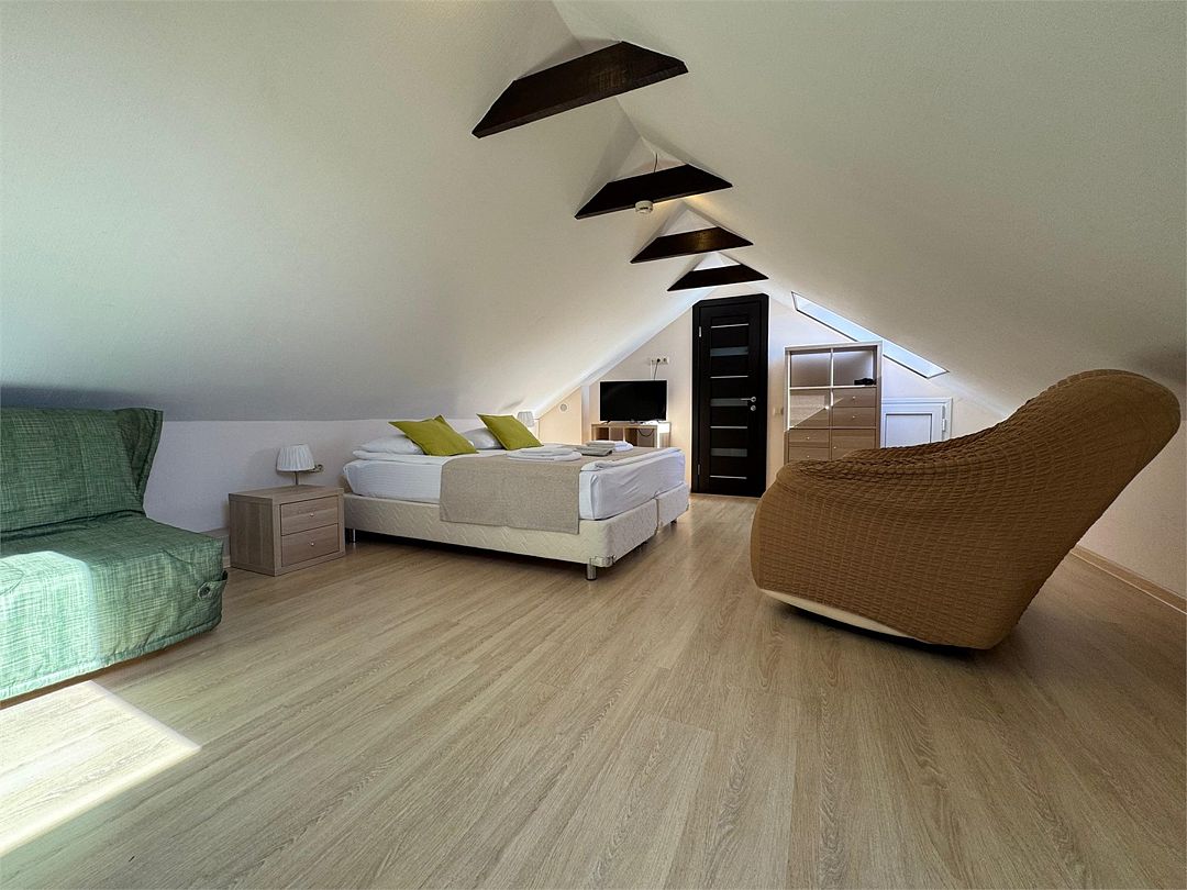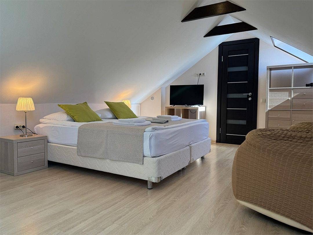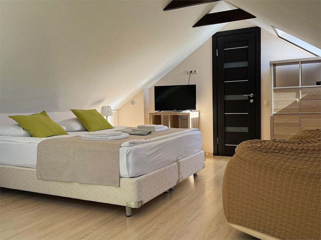 Мансардный двухкомнатный номер. В одной комнате одна двуспальная кровать или две односпальные кровати (на выбор) и диван-кровать (120х200). В другой комнате (проходной) диван-кровать (110х190) и обеденная зона. Гладильная доска и утюг имеются в коридоре (на 2 номера).Услуги и удобства
