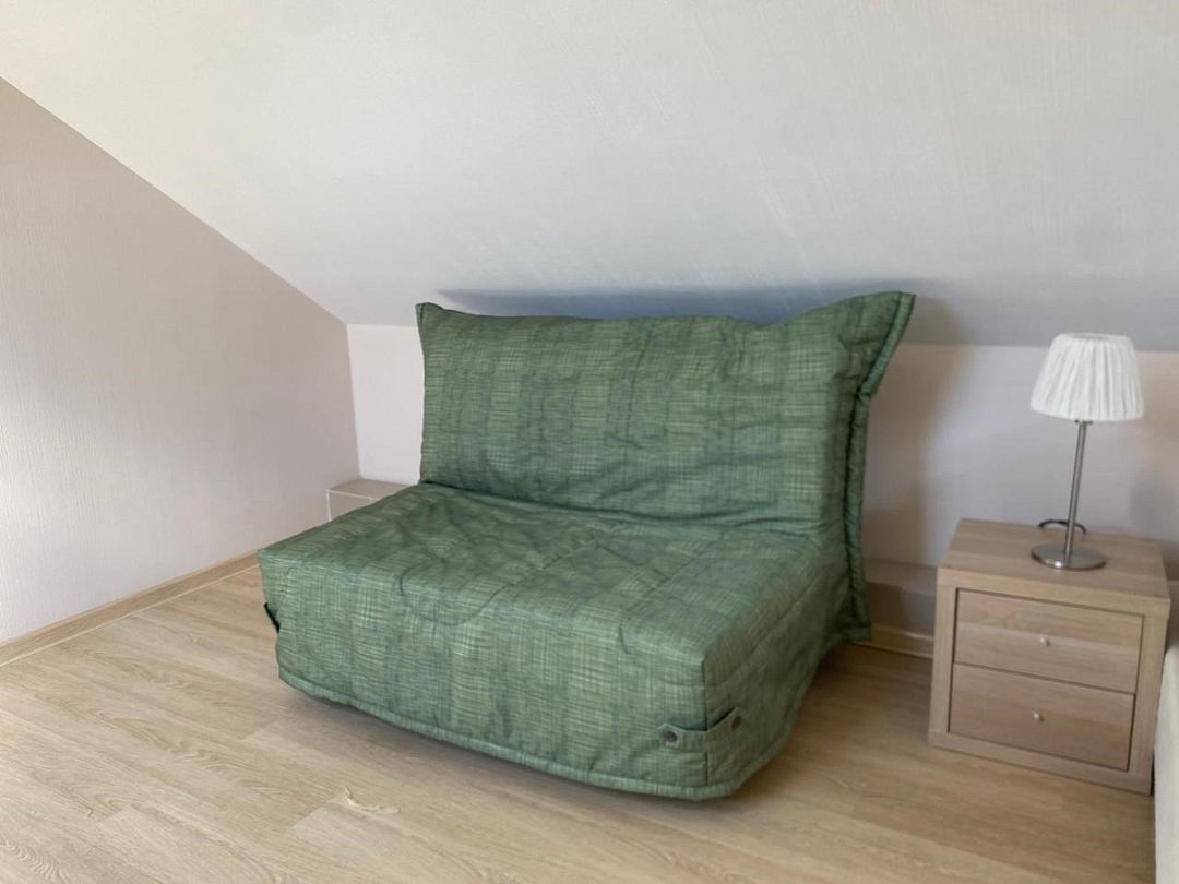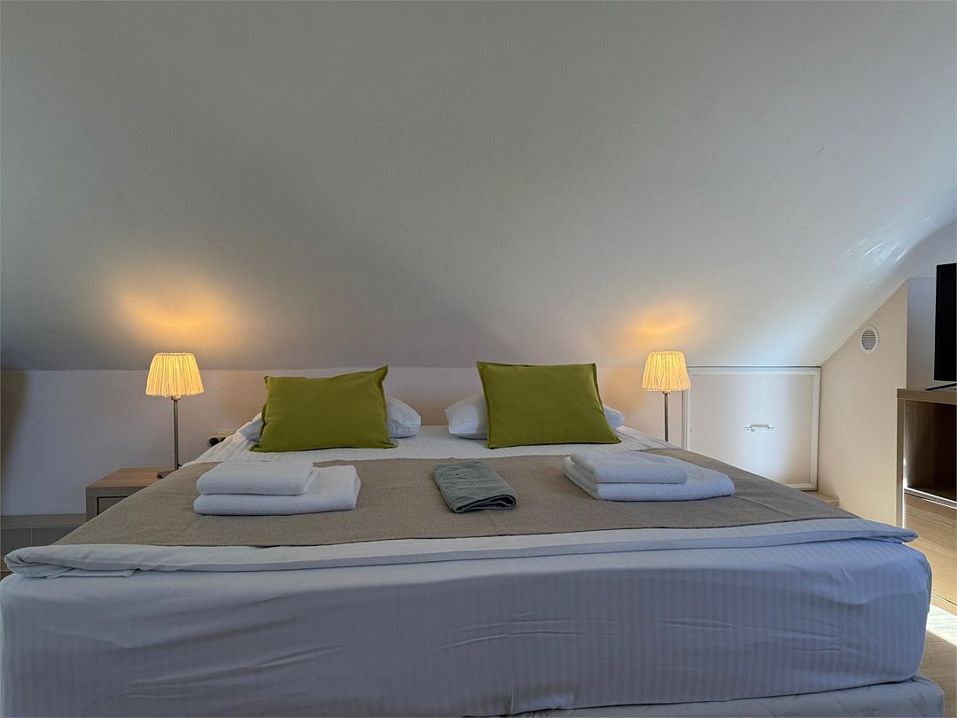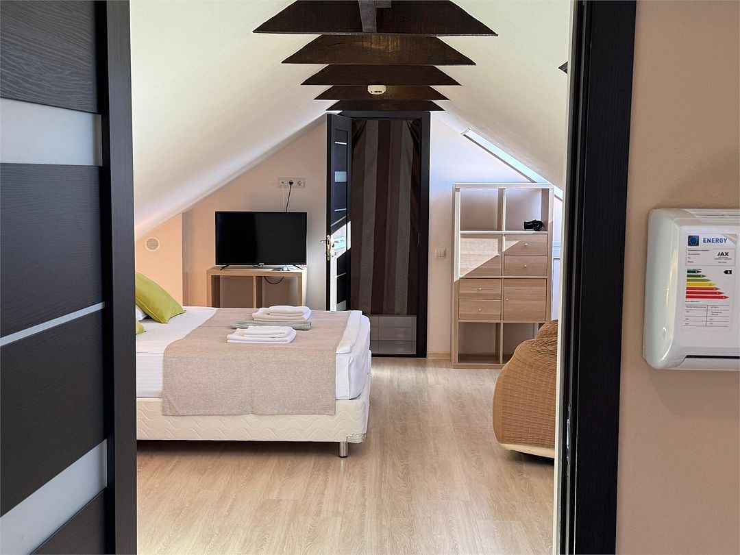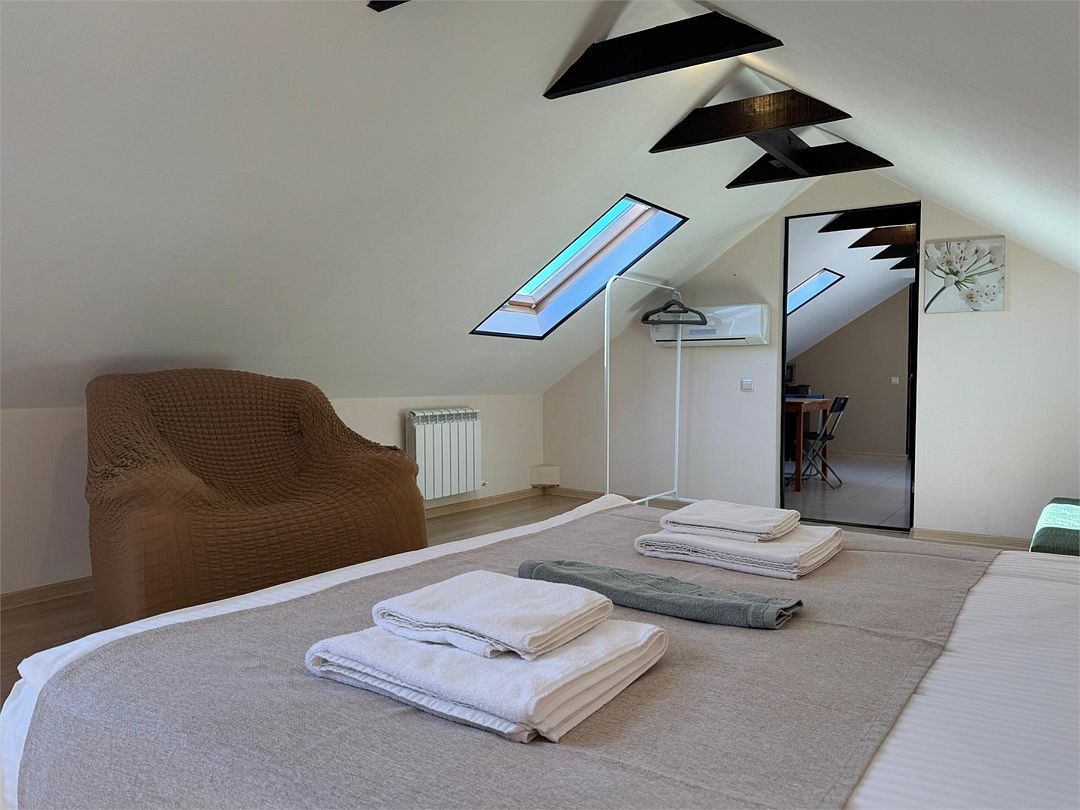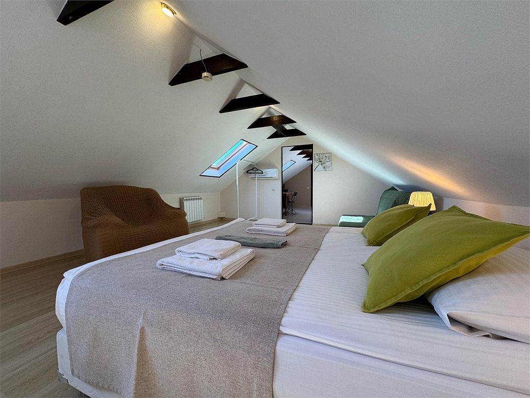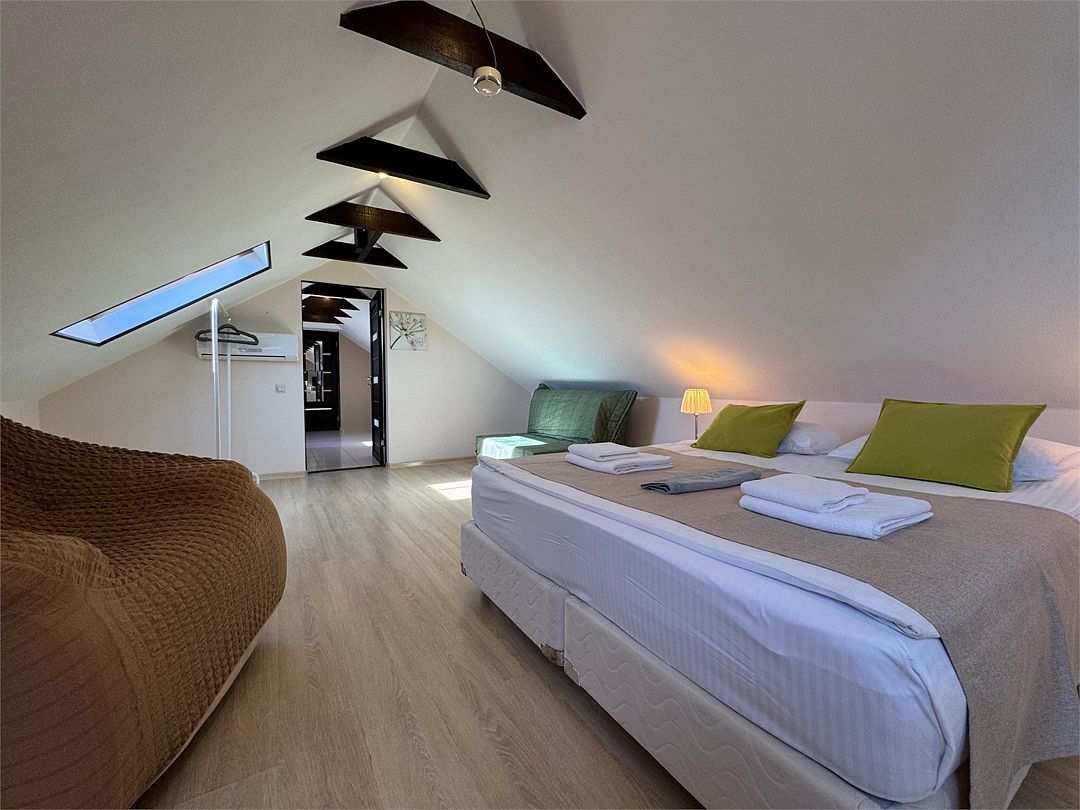 Мансардный двухкомнатный номер. В одной комнате одна двуспальная кровать или две односпальные кровати (на выбор) и диван-кровать (120х200). В другой комнате (проходной) диван-кровать (110х190) и обеденная зона. Гладильная доска и утюг имеются в коридоре (на 2 номера).Услуги и удобства