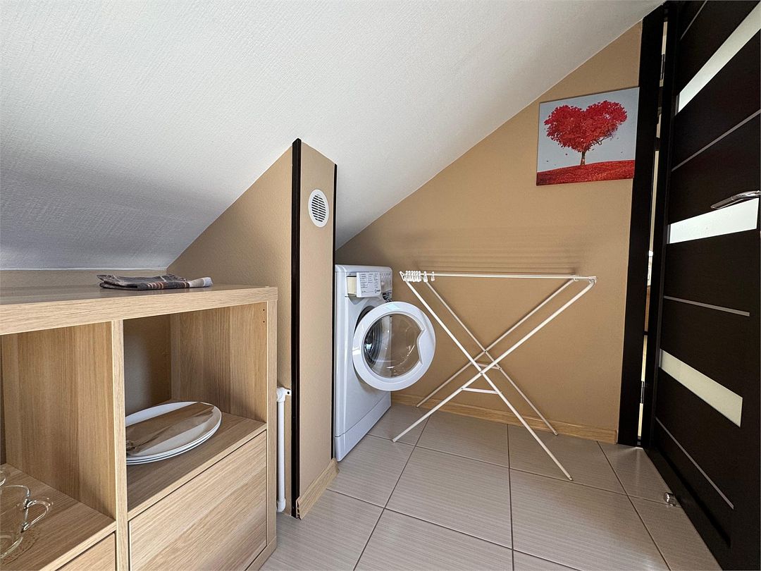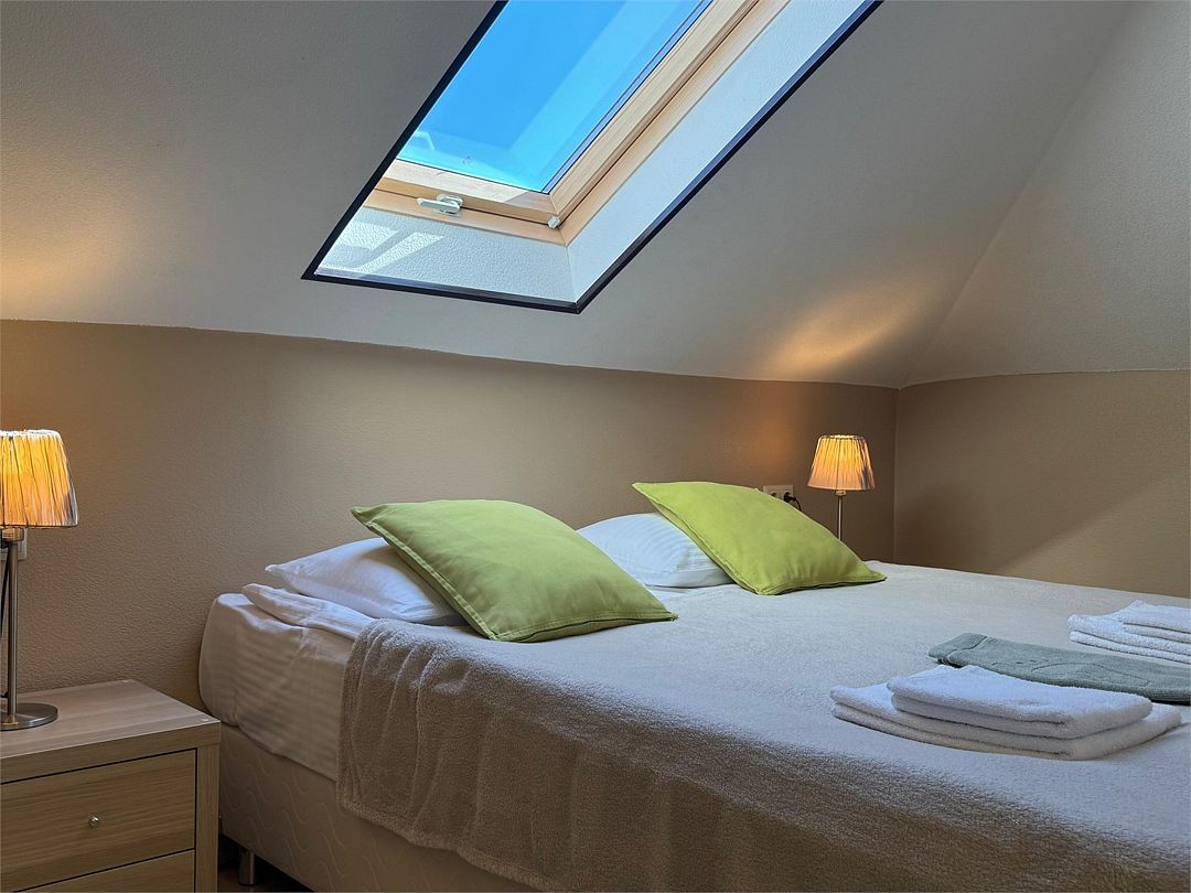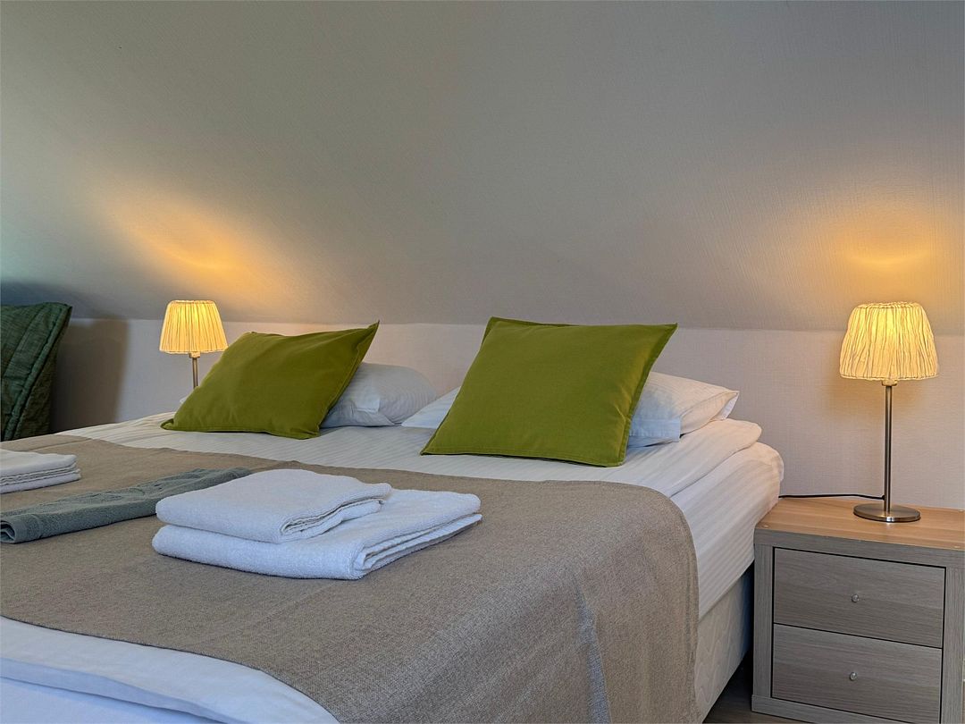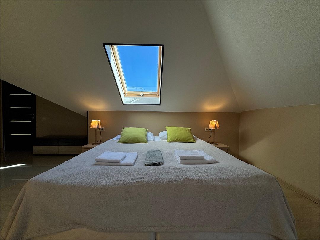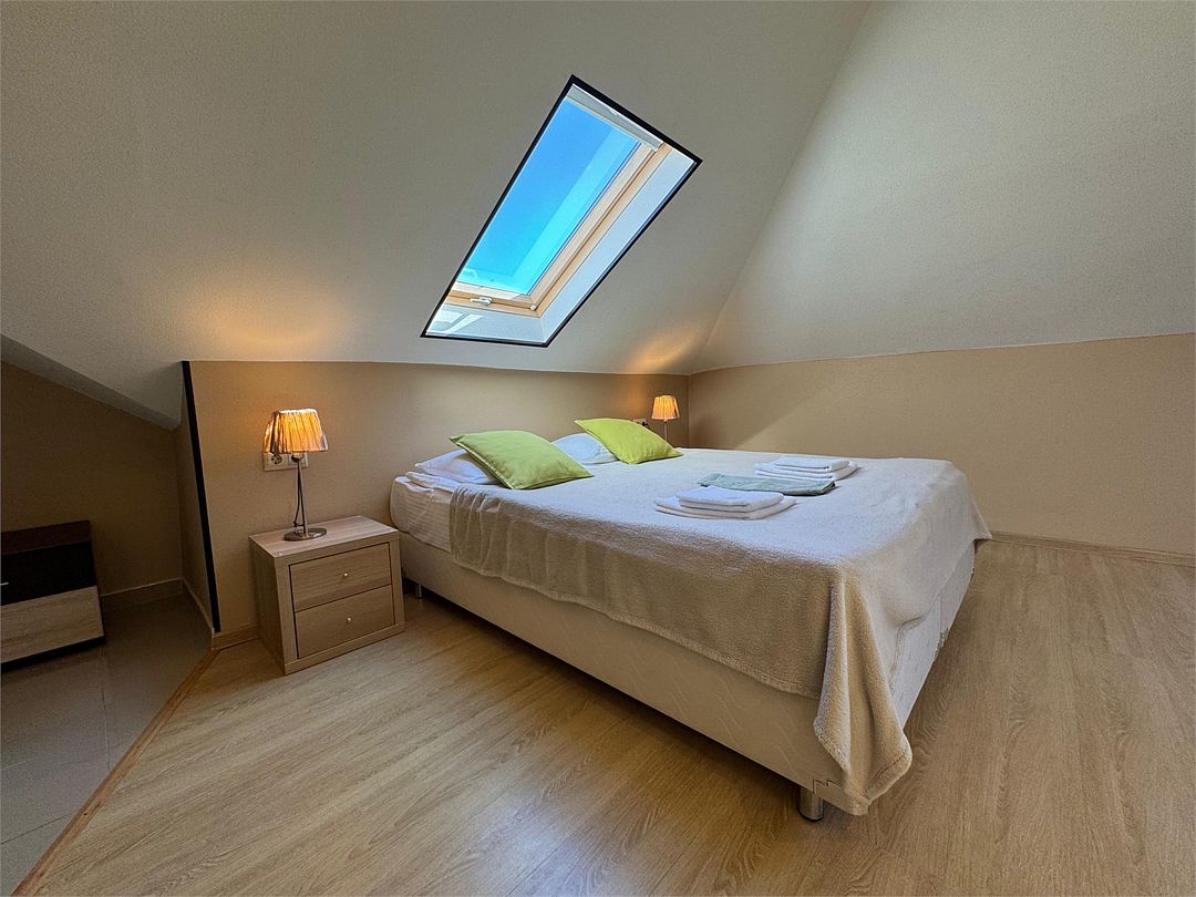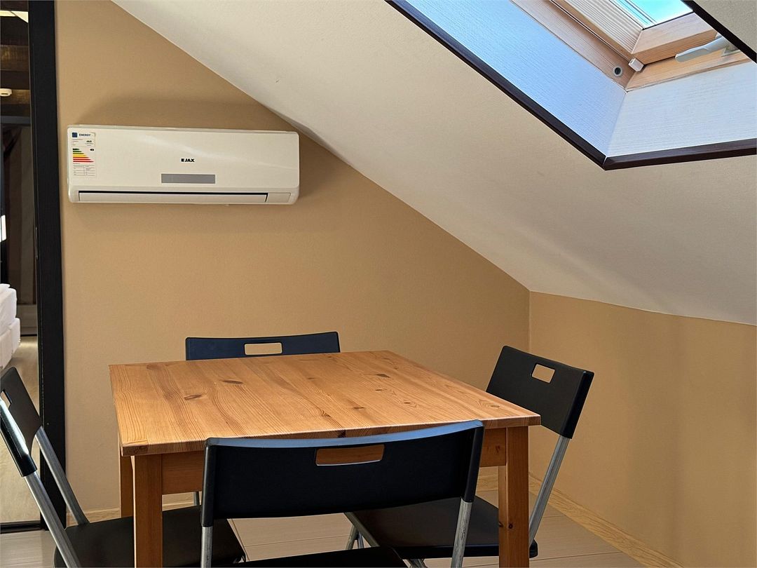 Мансардный двухкомнатный номер. В одной комнате одна двуспальная кровать или две односпальные кровати (на выбор) и диван-кровать (120х200). В другой комнате (проходной) диван-кровать (110х190) и обеденная зона. Гладильная доска и утюг имеются в коридоре (на 2 номера).Услуги и удобства