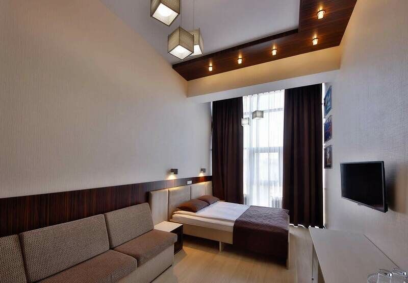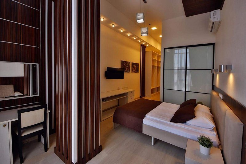 - отличительной особенностью номера «Студия» является витражное окно от пола до потолка высотой 4 м
