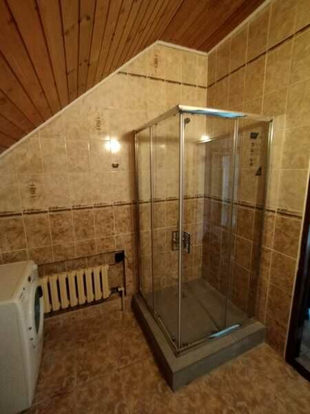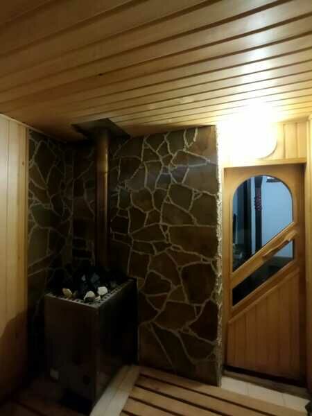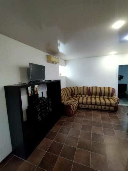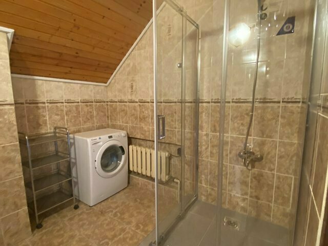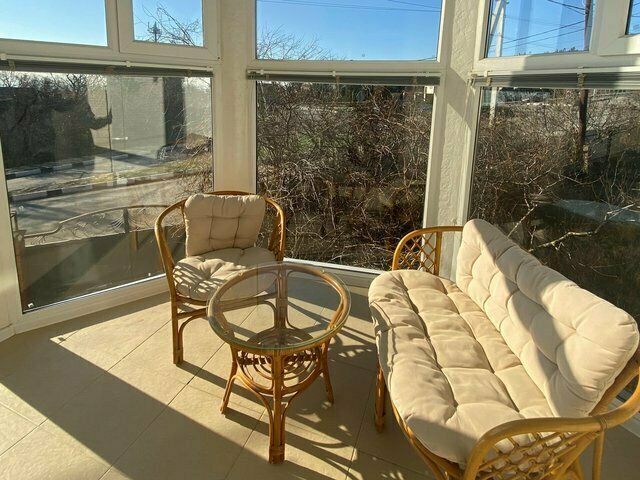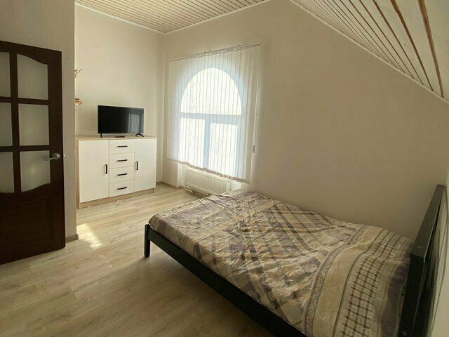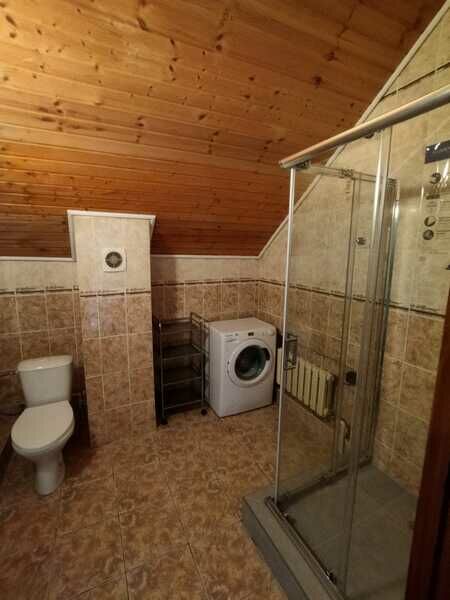 Вместительный 3-х этажный коттедж включает три номера, кухню, два санузла и просторную гостиную. Каждая комната уютно обустроена, имеются шкафы, тумбочка для хранения, телевизор, кондиционер. В ванных и душевых установлены стиральные машины. В кухонной зоне созданы оптимальные условия для приготовления пищи. Есть холодильник, микроволновка, посуда, столовые приборы.