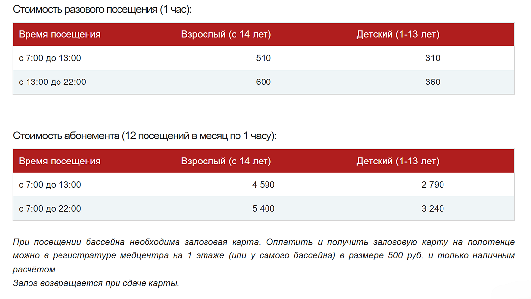 Для отдыхающих по лечению посещение бассейна включено (один час в день), остальные гости могут воспользоваться за дополнительную плату; при входе требуется залоговая карта, которая возвращается по окончании посещений.