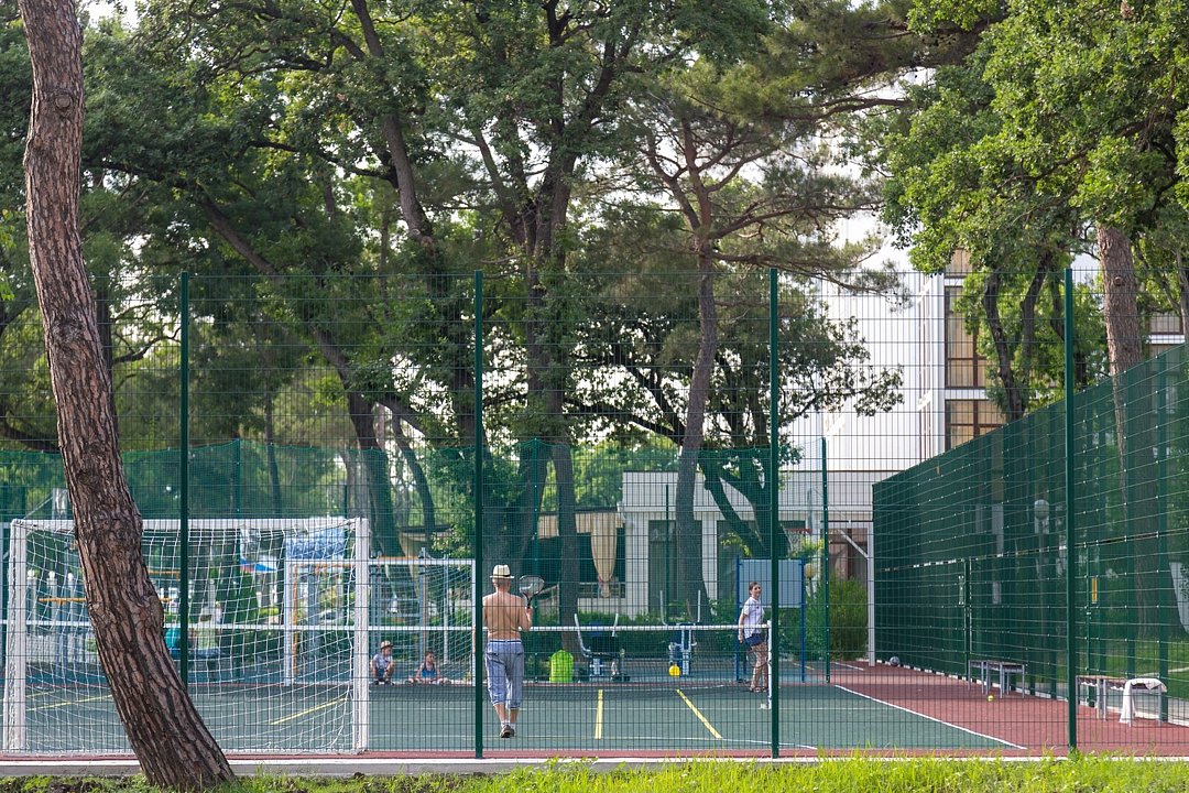 Гостям санатория предоставлены площадки для баскетбола, волейбола, футбола и большого тенниса, а также отдельная зона с тренажёрами для персональных и спортивных занятий. Необходимый инвентарь выдается сотрудником на территории спортивной площадки с 8:00 до 20:00.