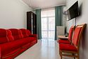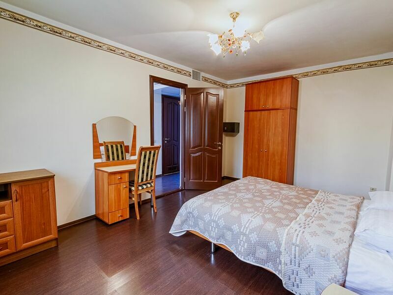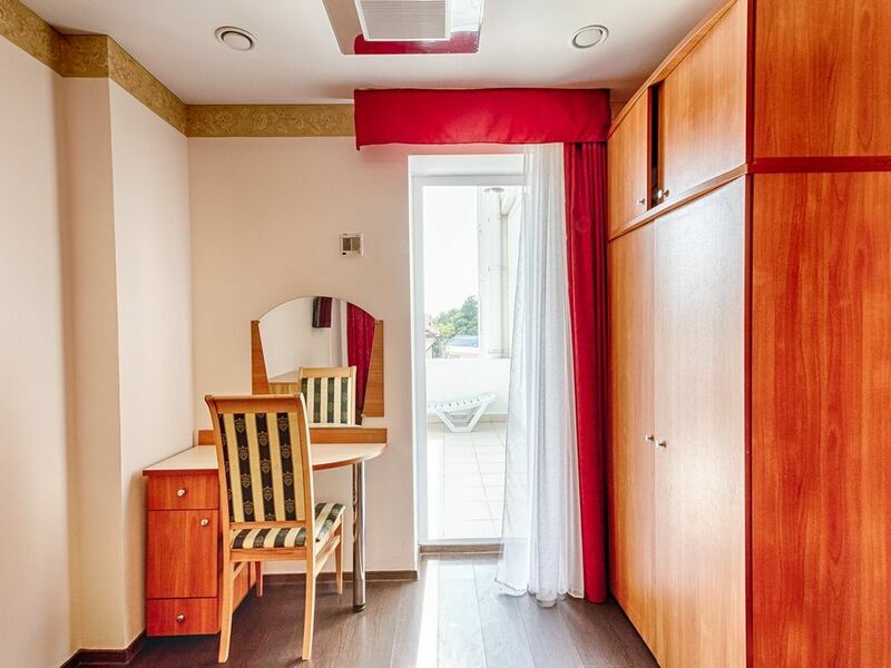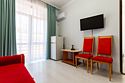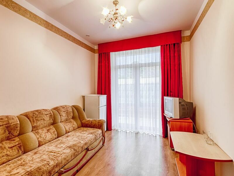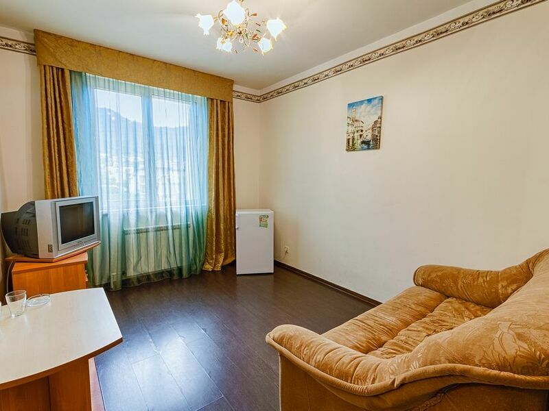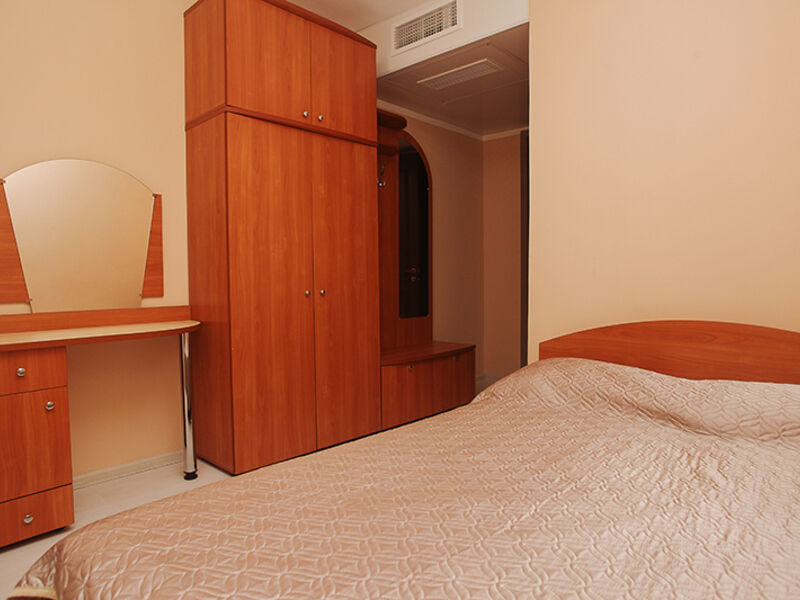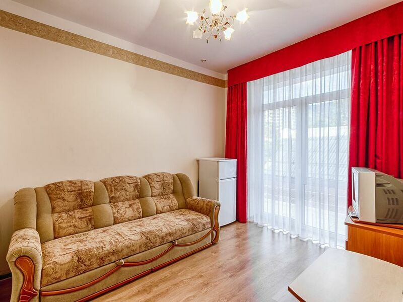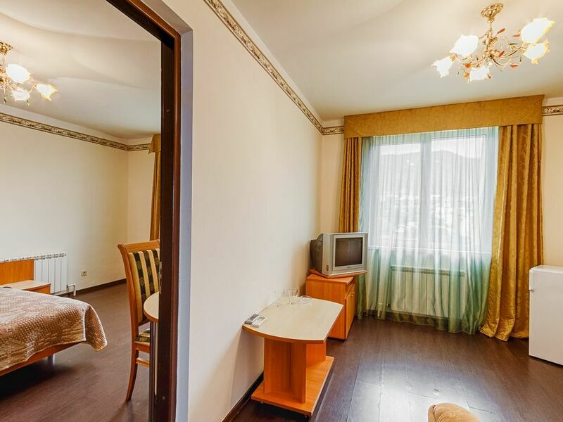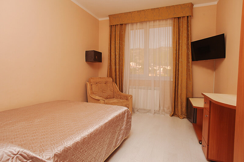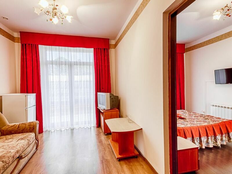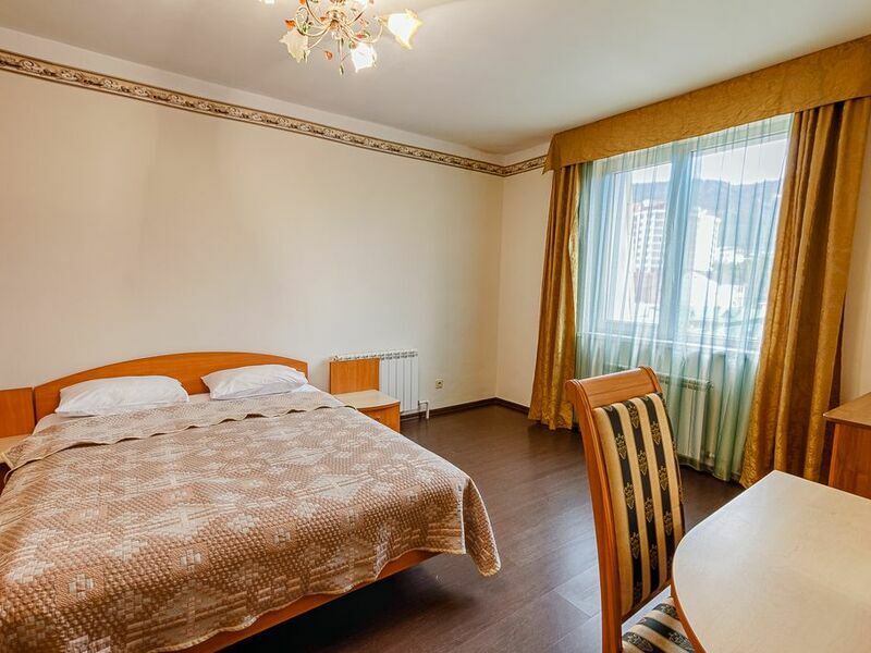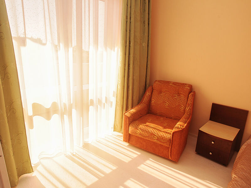 Номерной фонд отеля – это номера уровня «Стандарт», «Улучшенный» и «Семейный». Все номера расположены в 5-ти этажном корпусе и могут иметь выход как на балкон, так и террасу, вид на море или горы. Все номера оснащаются кроватями, диванами, шкафами, телевизорами, холодильниками и кондиционерами. Санузел комплектуется душем или душевой кабиной. Заселение детей до 5 лет без предоставления спального места и питания – бесплатно. В качестве дополнительных услуг гостям предлагается прокат бытового инвентаря (утюг).