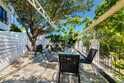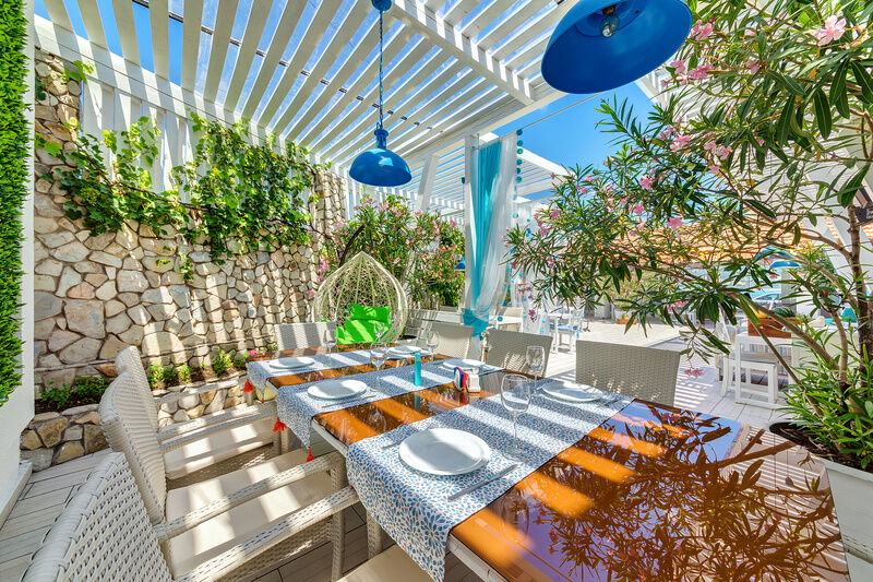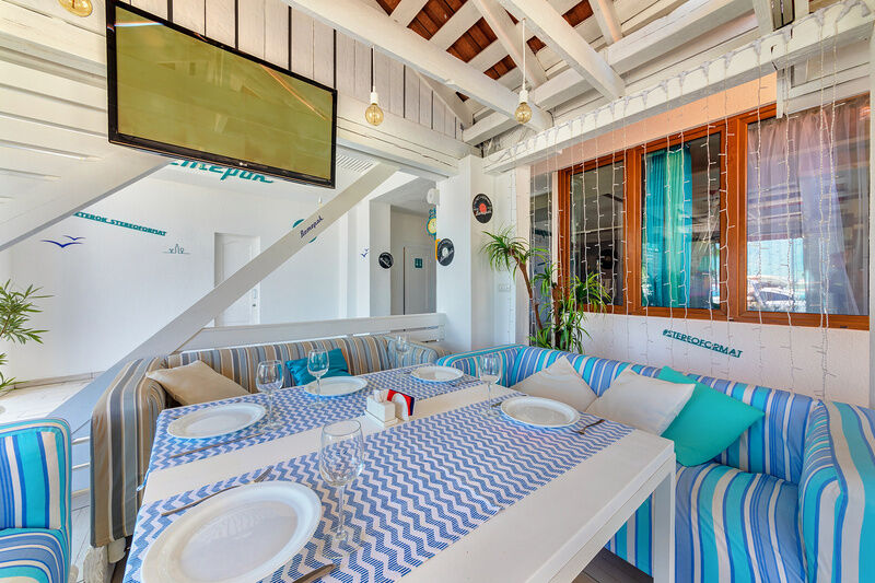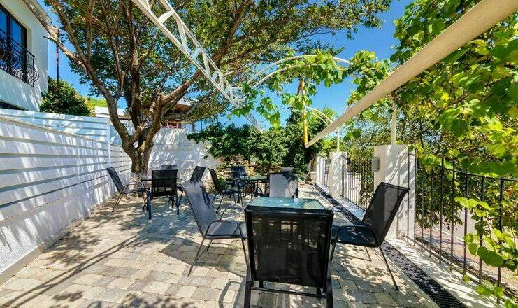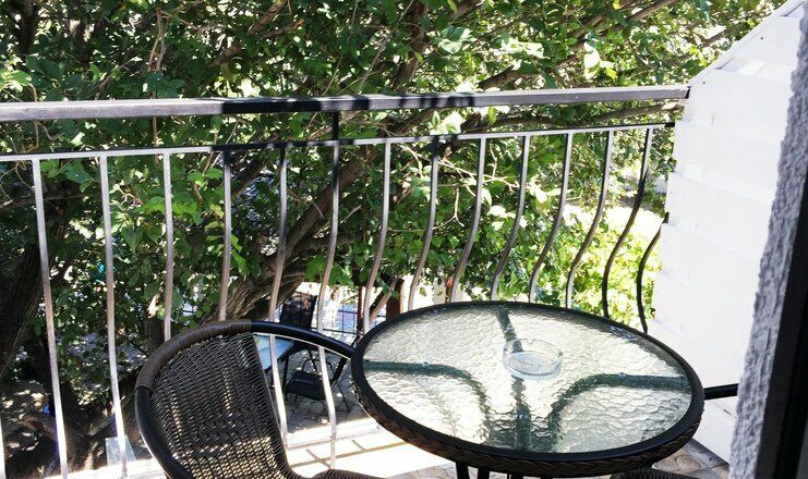 Всего в 100 метрах от моря находится галечный пляж, на берегу есть кабинки для переодевания, теневые навесы и лежаки.