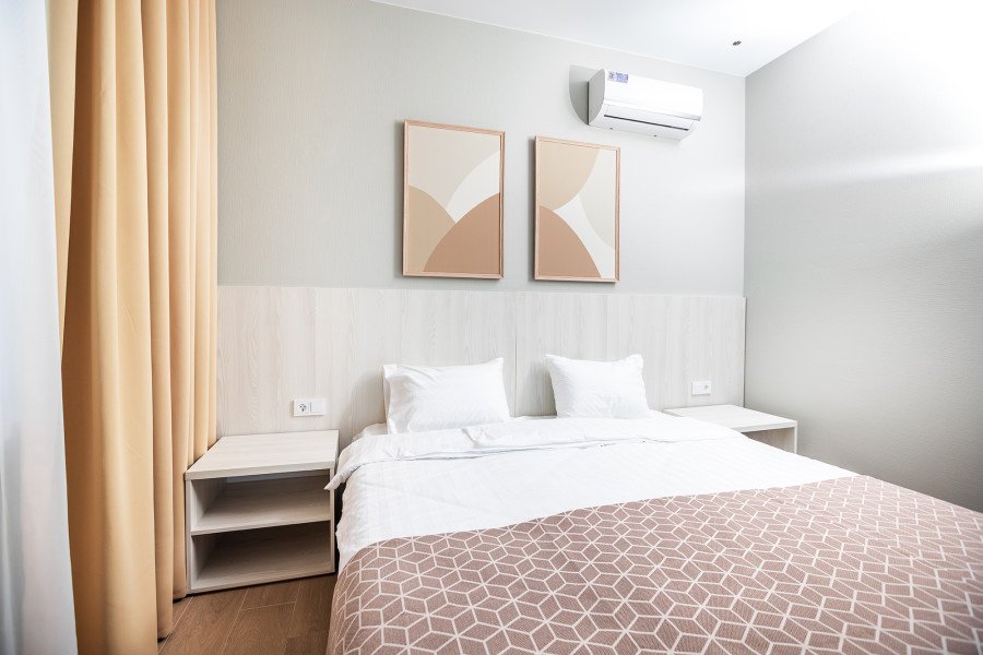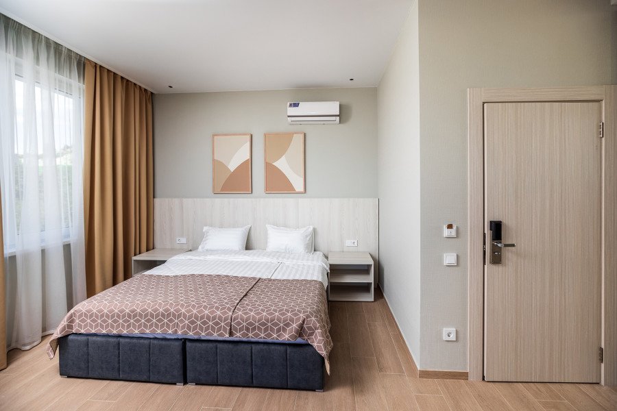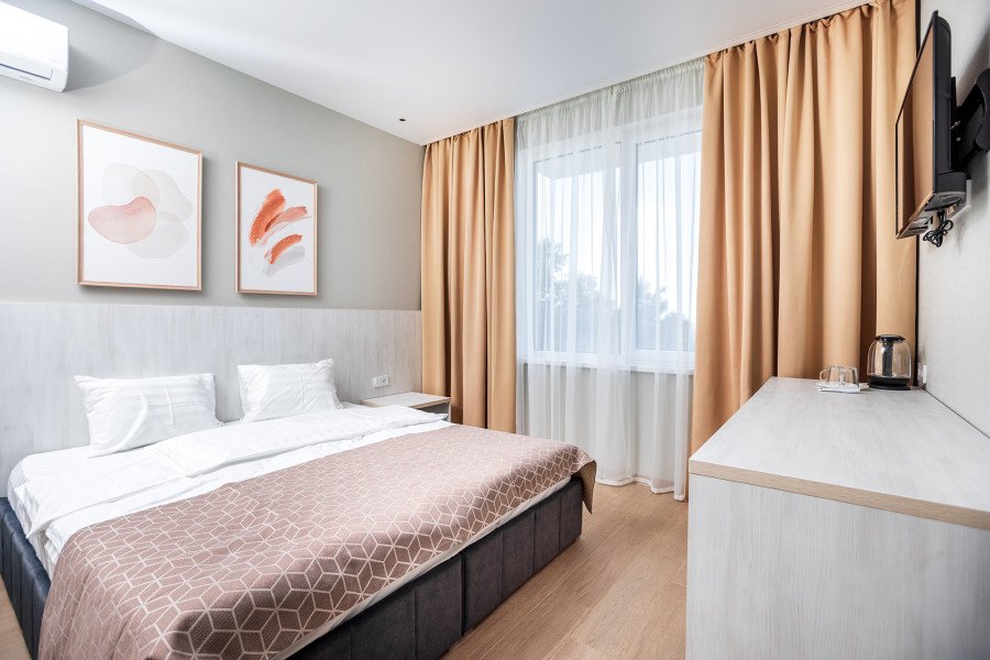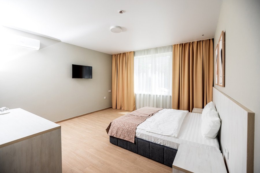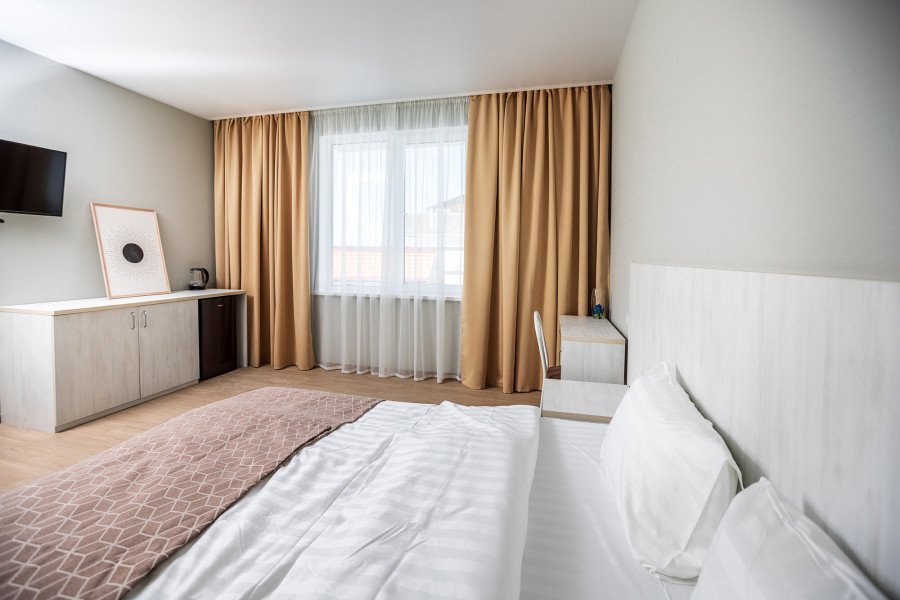 Комфортный, светлый, просторный номер оснащён: двуспальная кровать или две односпальные кровати, холодильник, электрический чайник, телевизор с плоским экраном, шторы, шкаф-купе, кондиционер, розетки возле кровати, стол.