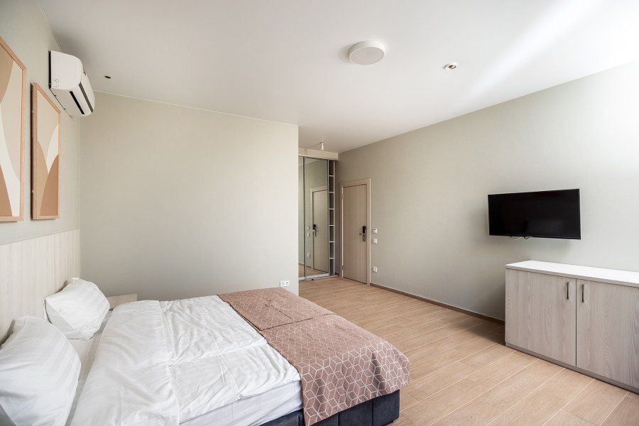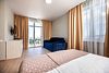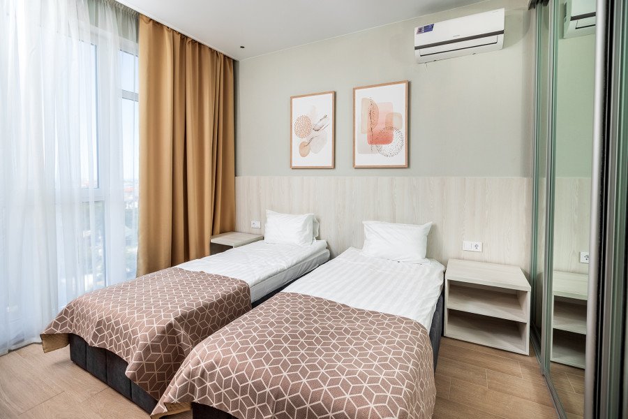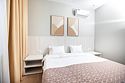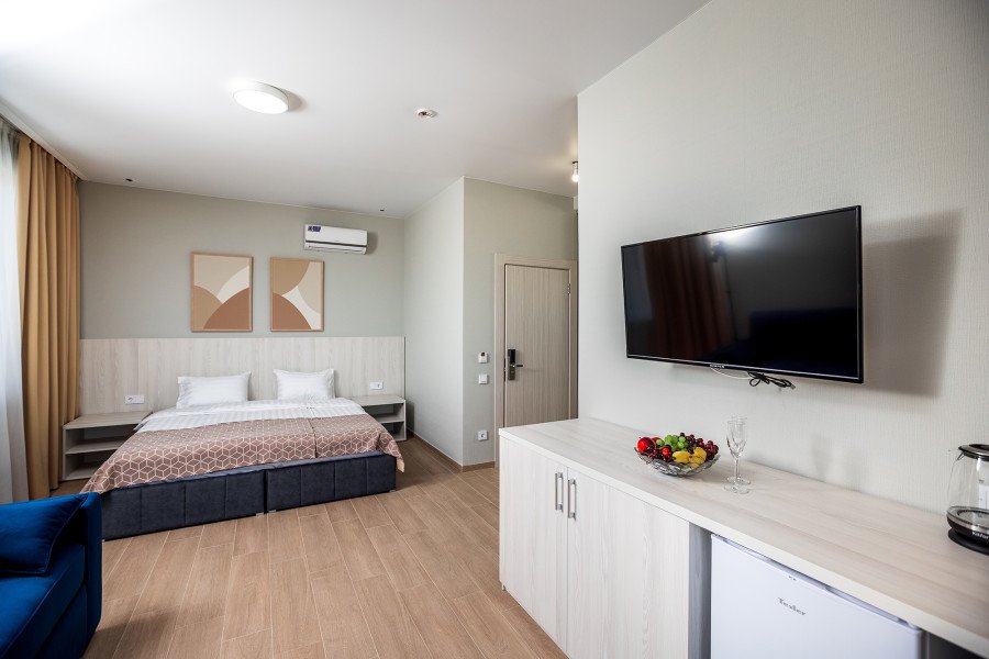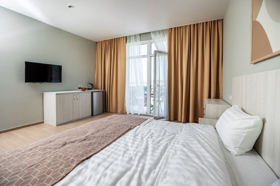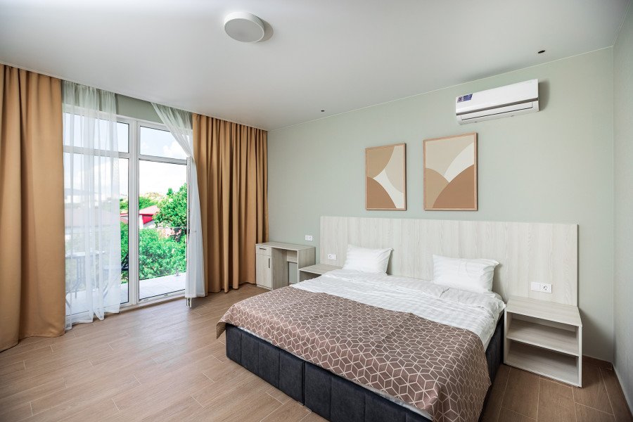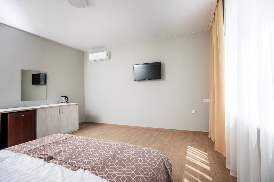 Комфортный, светлый, просторный номер оснащен: двуспальная кровать или две односпальные кровати, холодильник, электрический чайник, телевизор с плоским экраном, шторы, шкаф-купе, кондиционер, розетки возле кровати, стол.