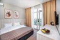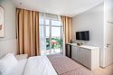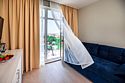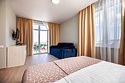Комфортный трехместный номер с балконом оснащен: двуспальная кровать или две односпальные кровати, диван-кровать, прикроватные тумбочки, телевизор с плоским экраном, шторы блэкаут, шкаф-купе, стол, холодильник, кондиционер, розетка возле кровати, электрический чайник.