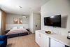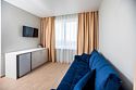 Комфортный трехместный номер оснащен: двуспальная кровать или две односпальные кровати, диван-кровать, прикроватные тумбочки, телевизор с плоским экраном, шторы блэкаут, шкаф-купе, стол, холодильник, кондиционер, розетка возле кровати, электрический чайник.