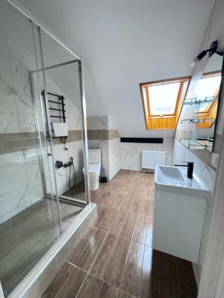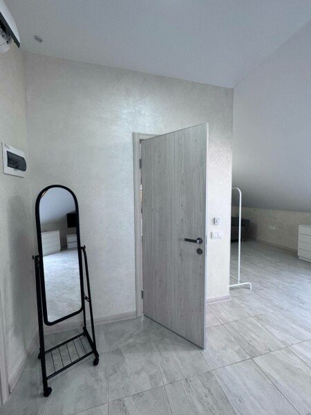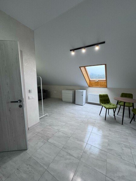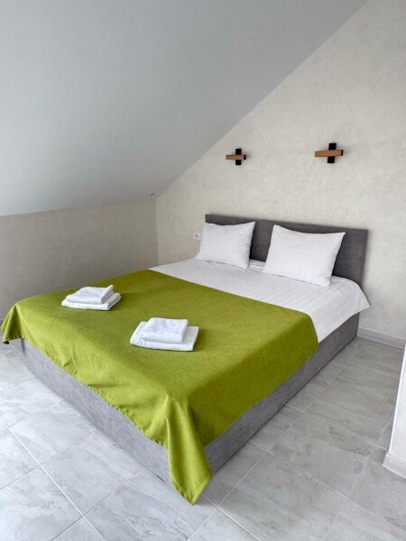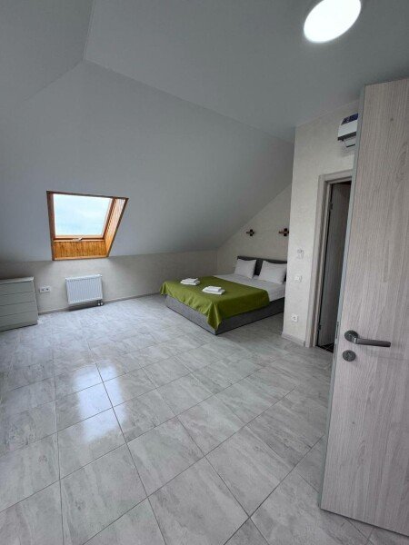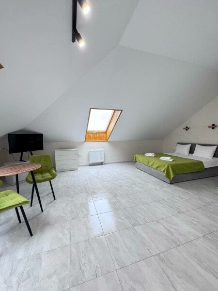 Трехместный номер 45 м² на мансардном этаже c возможностью размещения ребенка на дополнительном месте. Оснащение номера: Двуспальная кровать, раскладной диван, зеркало полный рост, холодильник, обеденный стол и стулья, TV, туалетная комната с душевой кабиной.