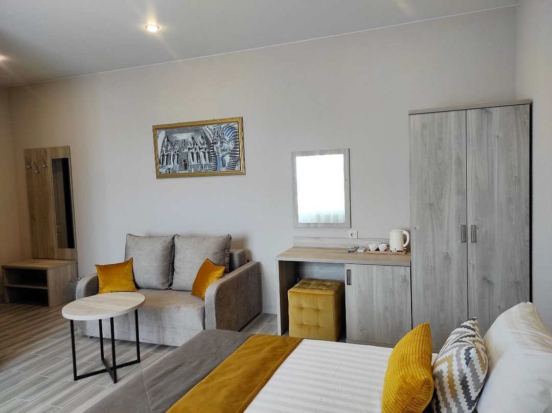 основные места - кровати односпальные или одна двуспальная кровать и 2 дивана раскладных, холодильник, кондиционер, телевизор, 2 комнаты, санузел (душ+туалет), мини-кухня, туалетные принадлежности