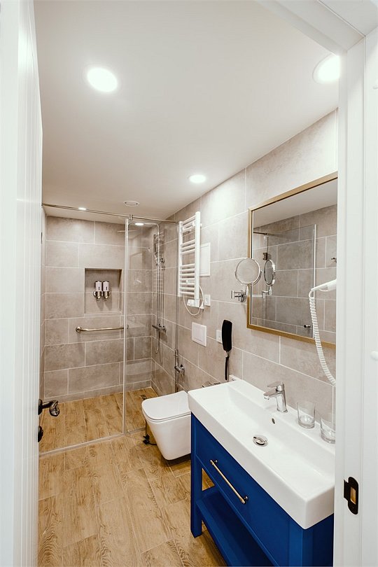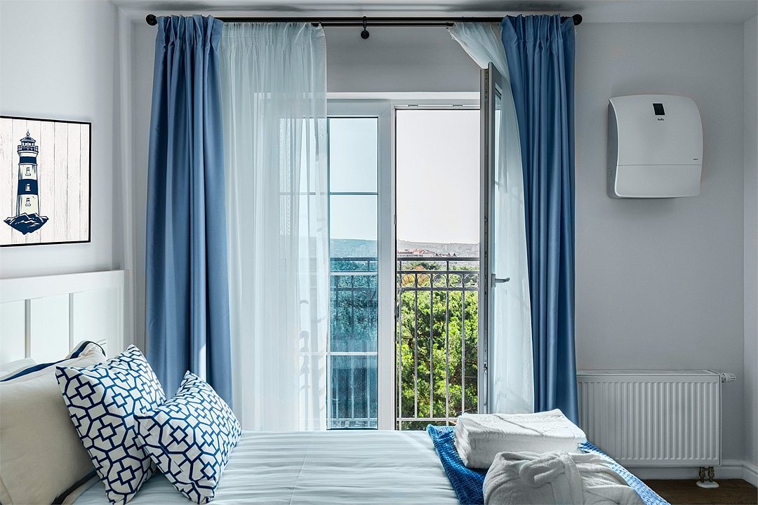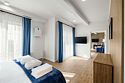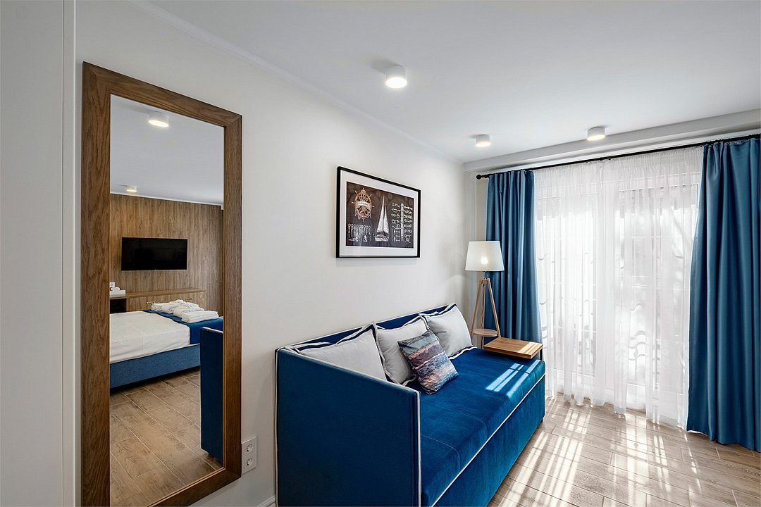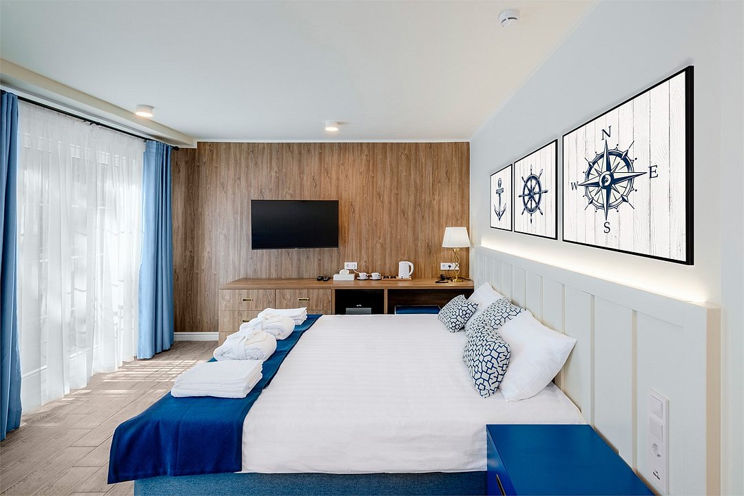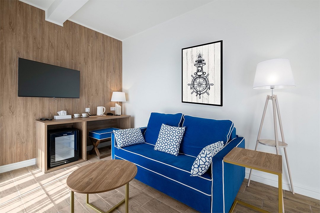 Уютный однокомнатный номер с панорамными окнами и выходом на индивидуальную террасу с диваном и шезлонгами расположен на втором этаже отеля. Номер выполнен в приятной бело-синей цветовой гамме с элементами деревянного декора. Один ребенок в возрасте до 6 лет, включительно, размещается бесплатно без предоставления дополнительного спального места. Дополнительное спальное место - по запросу.Услуги и удобства