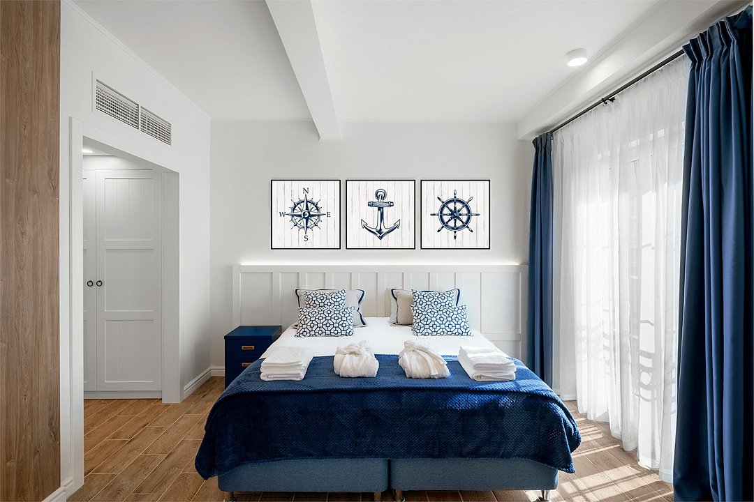 Уютные однокомнатные номера с панорамными окнами и выходом в небольшое индивидуальное патио выполнены в приятной бело-синей цветовой гамме с элементами деревянного декора. Один ребенок в возрасте до 6 лет, включительно, размещается бесплатно без предоставления дополнительного спального места. Дополнительное спальное место - по запросу.Услуги и удобства