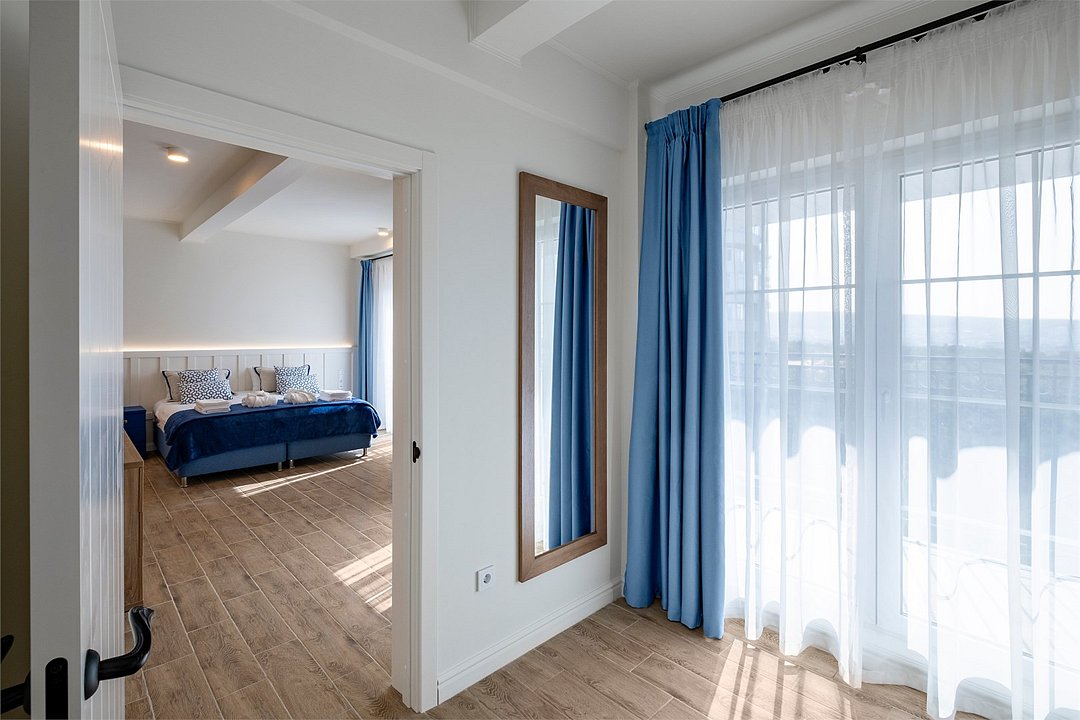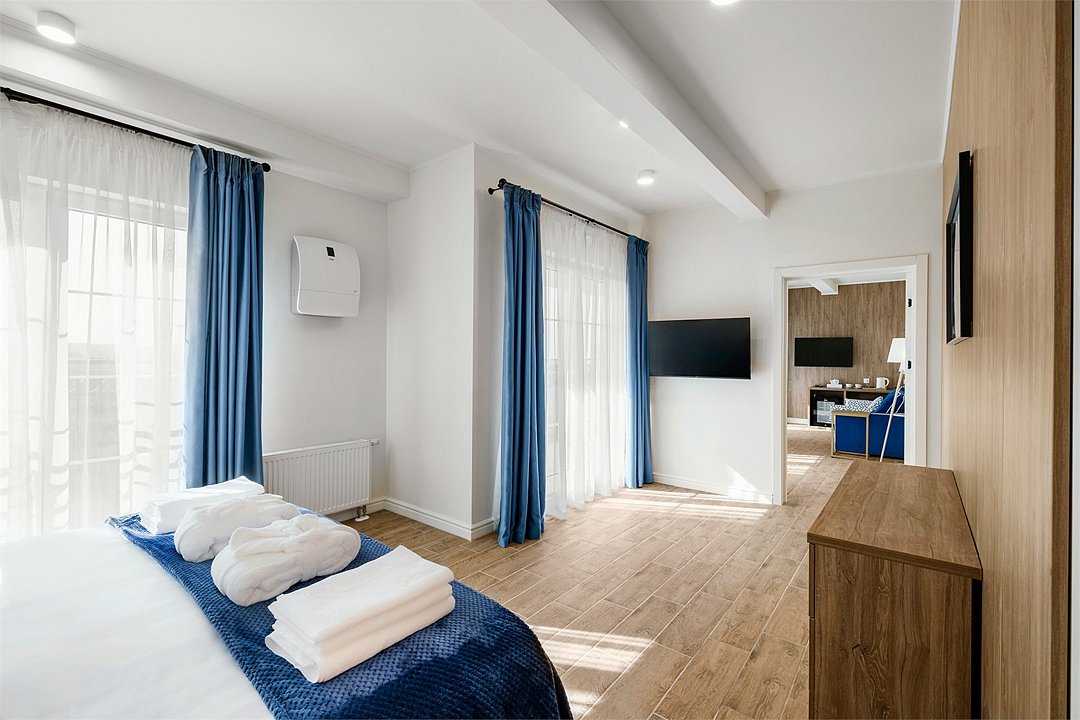 Уютный двухкомнатный номер с двумя входами и панорамными окнами расположен на пятом этаже отеля. С лоджии открывается вид на территорию отеля с реликтовыми соснами. Номер выполнен в приятной бело-синей цветовой гамме с элементами деревянного декора. Один ребенок в возрасте до 6 лет, включительно, размещается бесплатно без предоставления дополнительного спального места. Дополнительное спальное место - по запросу.Услуги и удобства