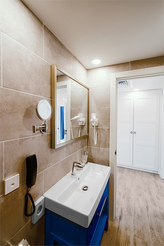 телевизор, Wi-Fi, IP-телефон, настольные лампы, фен, электронные замки, утюг, душевая кабина, халаты, банные полотенца, пляжные полотенца, тапочки, гигиенические средства, косметические средства, две односпальные или большая двуспальная кровать, гладильная доска, диван, шкаф для одежды, журнальный столик, письменный стол, багажная тумба, зеркало, письменные принадлежности, чайный набор, обслуживание номеров, сейф, минеральная вода, косметическое зеркало, вид во двор, стаканы, кофейный столик, тумба, внутренний телефон, мини-холодильник, гостиничная парфюмерия, номер для некурящих, USB-порт, пуфик, чайная станция, уборка номера, услуги прачечной (платно), вешалки-плечики, шапочка для душаВ гостиничном номере