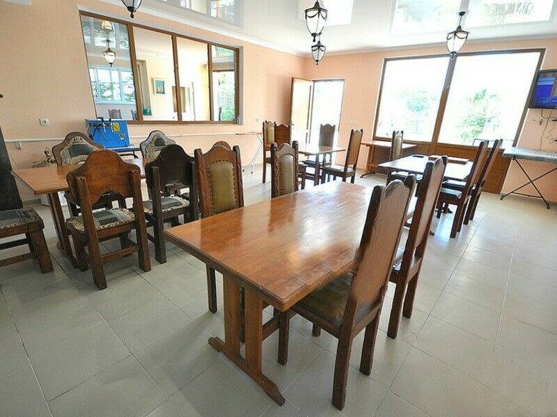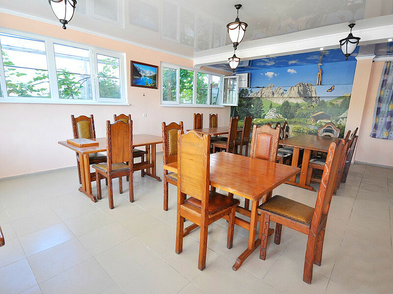 Питание в гостевом доме не предусмотрено, однако к услугам гостей барбекю-зона и общая кухня, где можно самостоятельно приготовить еду. На территории имеется сауна, открытый бассейн с зоной отдыха по периметру. Для автовладельцев рядом с корпусом организована автостоянка. Для маленьких гостей оборудована игровая площадка. В 3 минутах ходьбы расположен городской галечный пляж, оснащенный лежаками, навесами, шезлонгами. На пляже работают душевые, туалеты, есть спасательный пост.