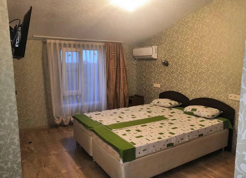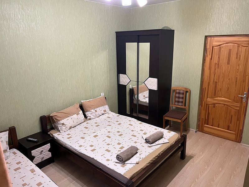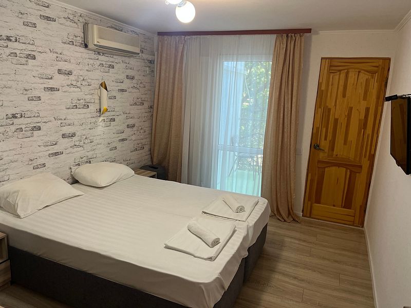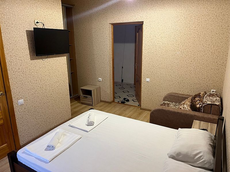 Имеет спальню с приятным интерьером. В номере: 1 двуспальная кровать, 1 диван односпальный. Имеется телевизор, кондиционер, шкаф, холодильник, стулья. Индивидуальная ванная комната: душ, раковина, туалет. В стоимость входит: Постельное бельё, полотенца, мыло. WI-Fi бесплатно на всей территории. Бесплатная общественная парковка за территорией.
