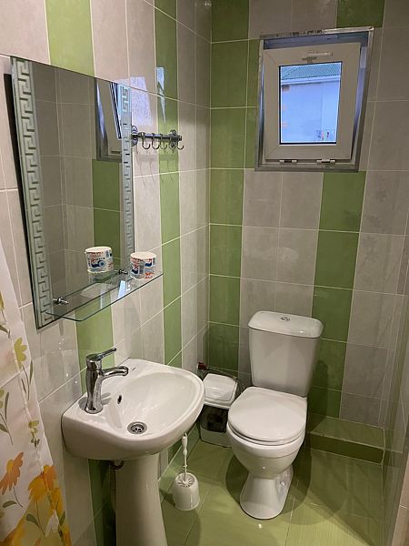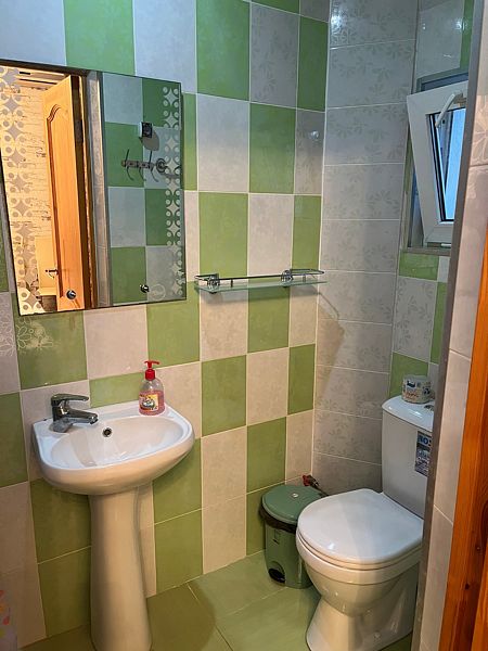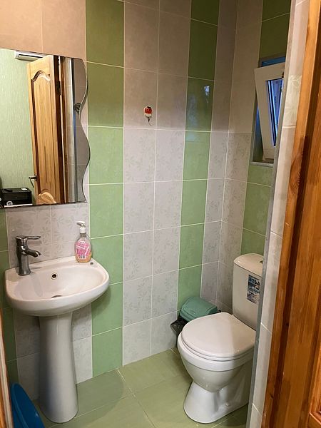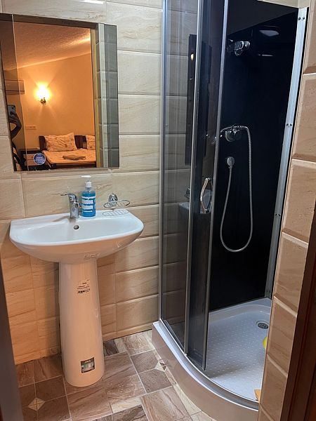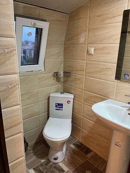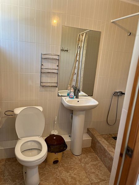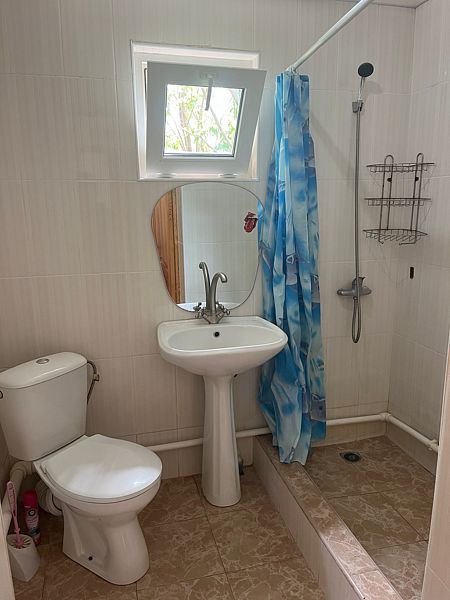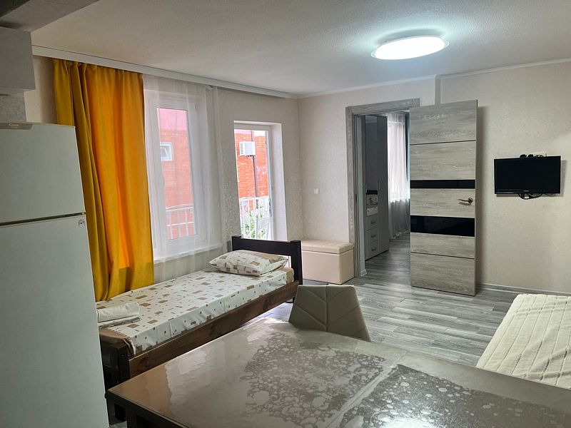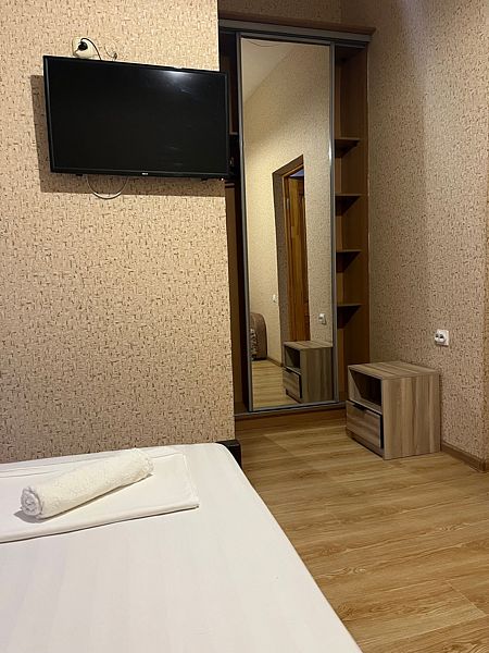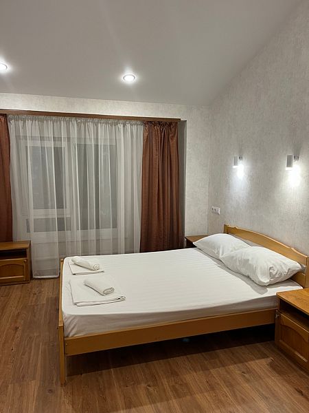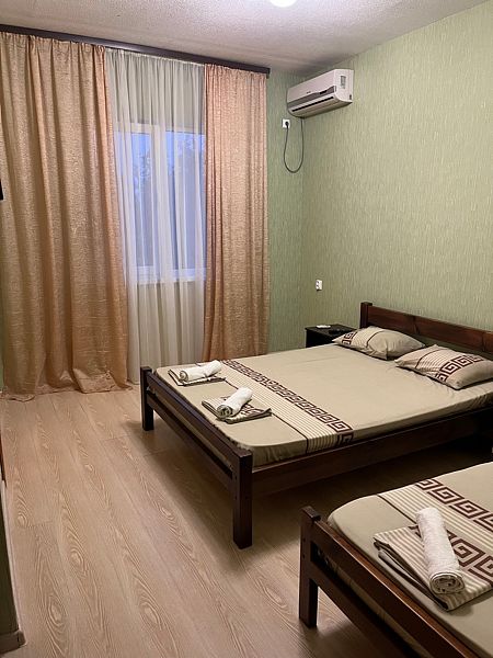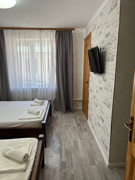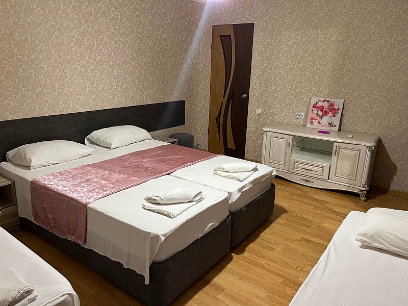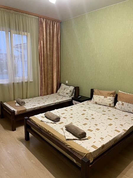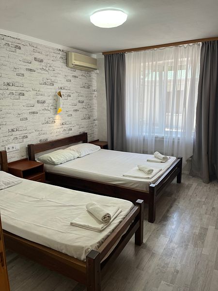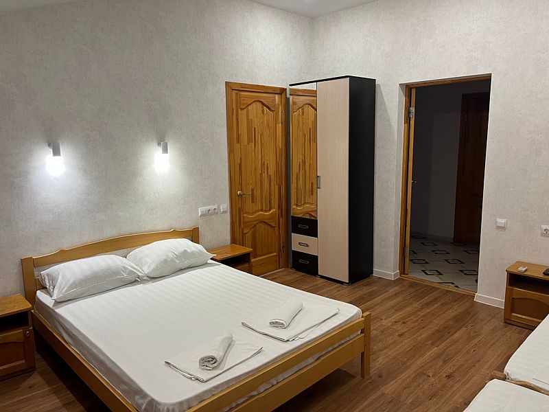 Имеет спальню с приятным интерьером. В номере: 1 двуспальная кровать, 1 односпальная кровать,1 доп. односпальный диван. Имеется телевизор, кондиционер, шкаф, холодильник, стулья. Индивидуальная ванная комната: душ, раковина, туалет. В стоимость входит: Постельное бельё, полотенца, мыло. WI-Fi бесплатно на всей территории. Бесплатная общественная парковка за территорией.