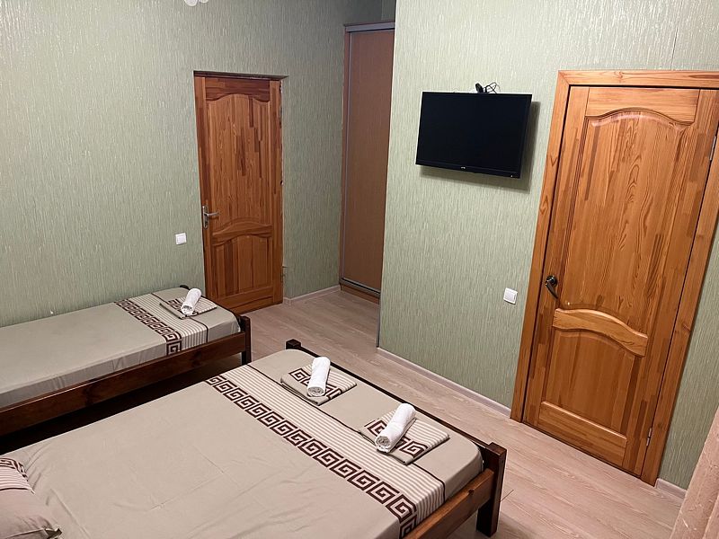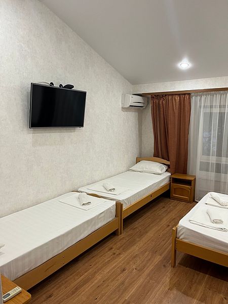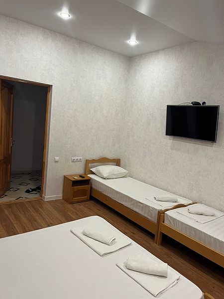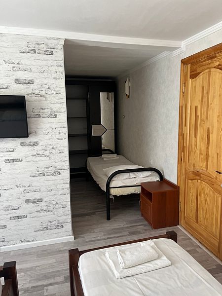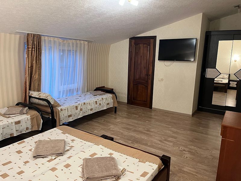 Имеет спальню с приятным интерьером. В номере: 5 односпальных кроватей. Имеется телевизор, кондиционер, шкаф, холодильник, стулья. Индивидуальная ванная комната: душ, раковина, туалет. В стоимость входит: постельное бельё, полотенца, мыло. WI-Fi бесплатно на всей территории. Бесплатная общественная парковка за территорией.