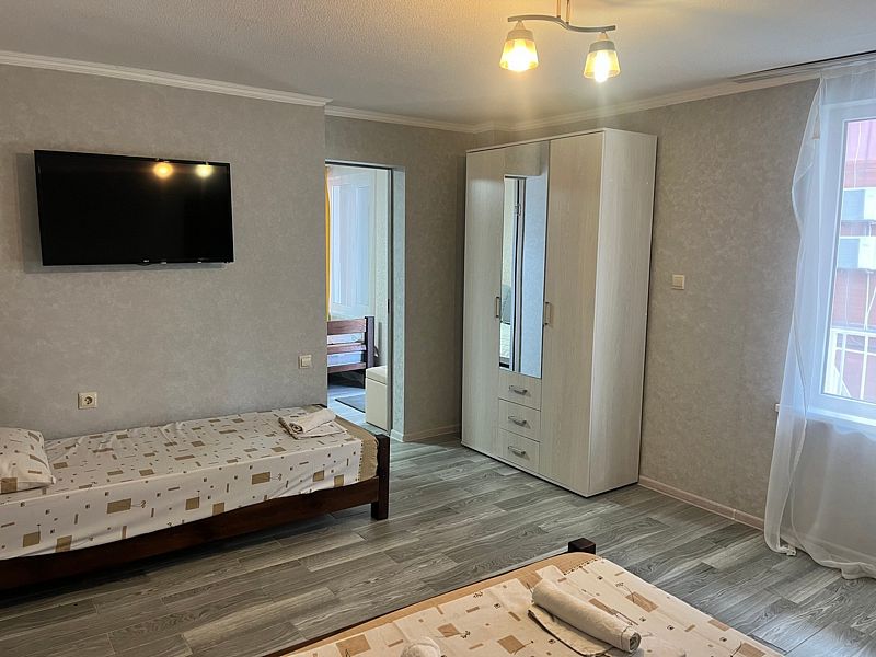 Имеет 1 гостиную и 1 спальню с приятным интерьером. В номере: 1 двуспальная кровать, 1 диван односпальный, 2 односпальных кровати. Имеется телевизор, кондиционер, шкаф, кухня, посуда, столовые приборы, СВЧ, чайник, плита электрическая, холодильник, стол, стулья. Индивидуальная ванная комната: ванна, раковина, туалет, стиральная машина.